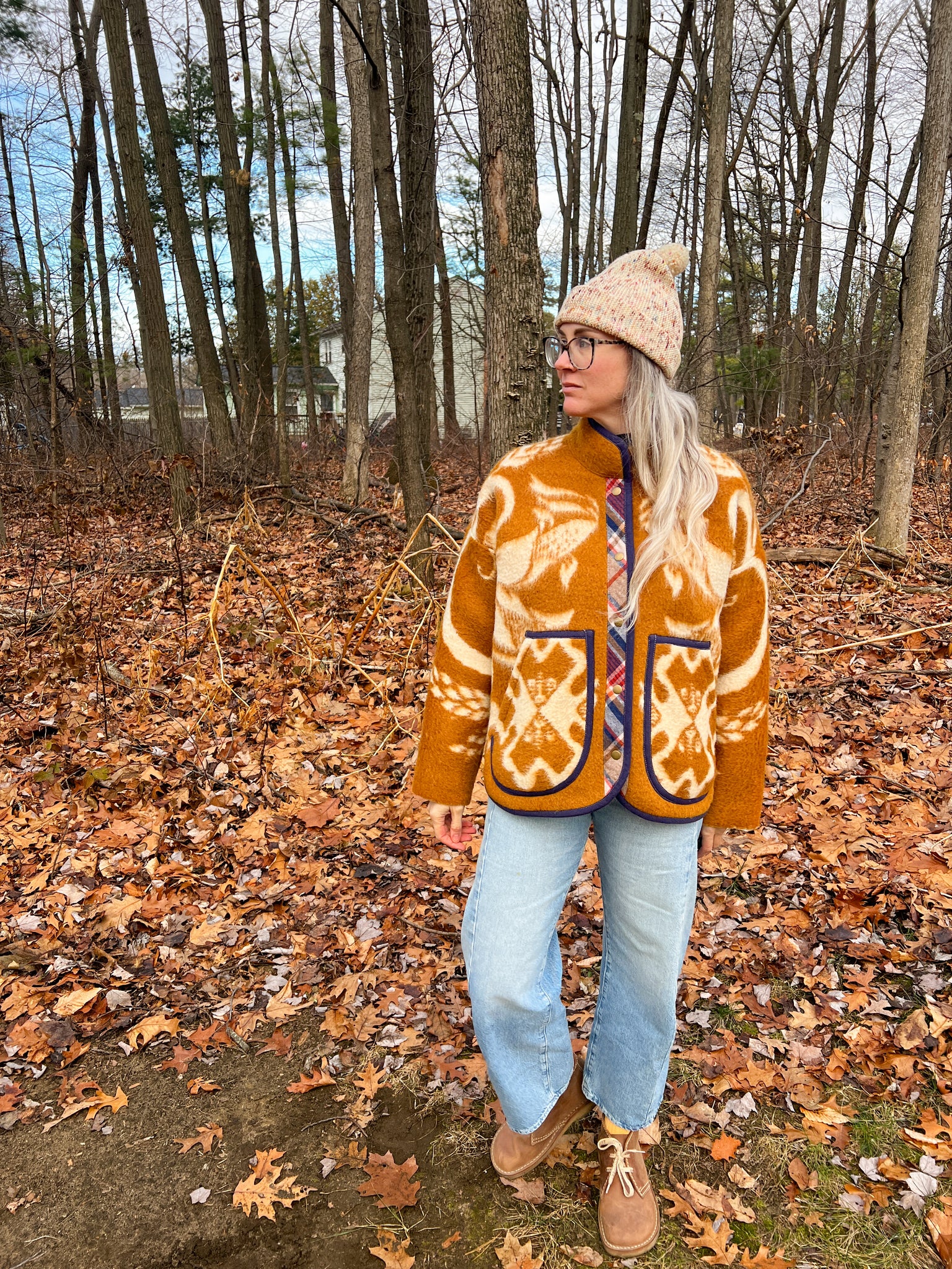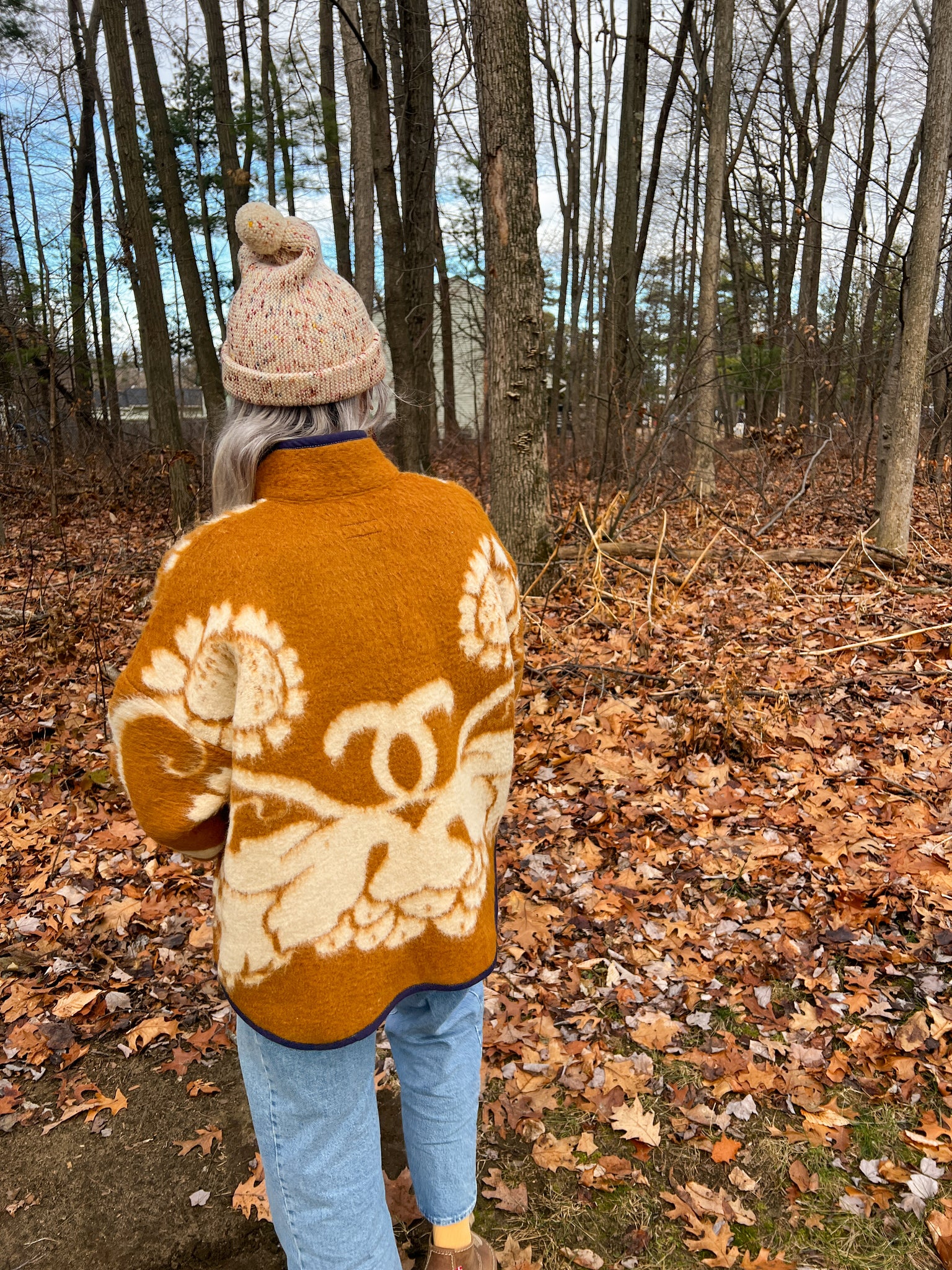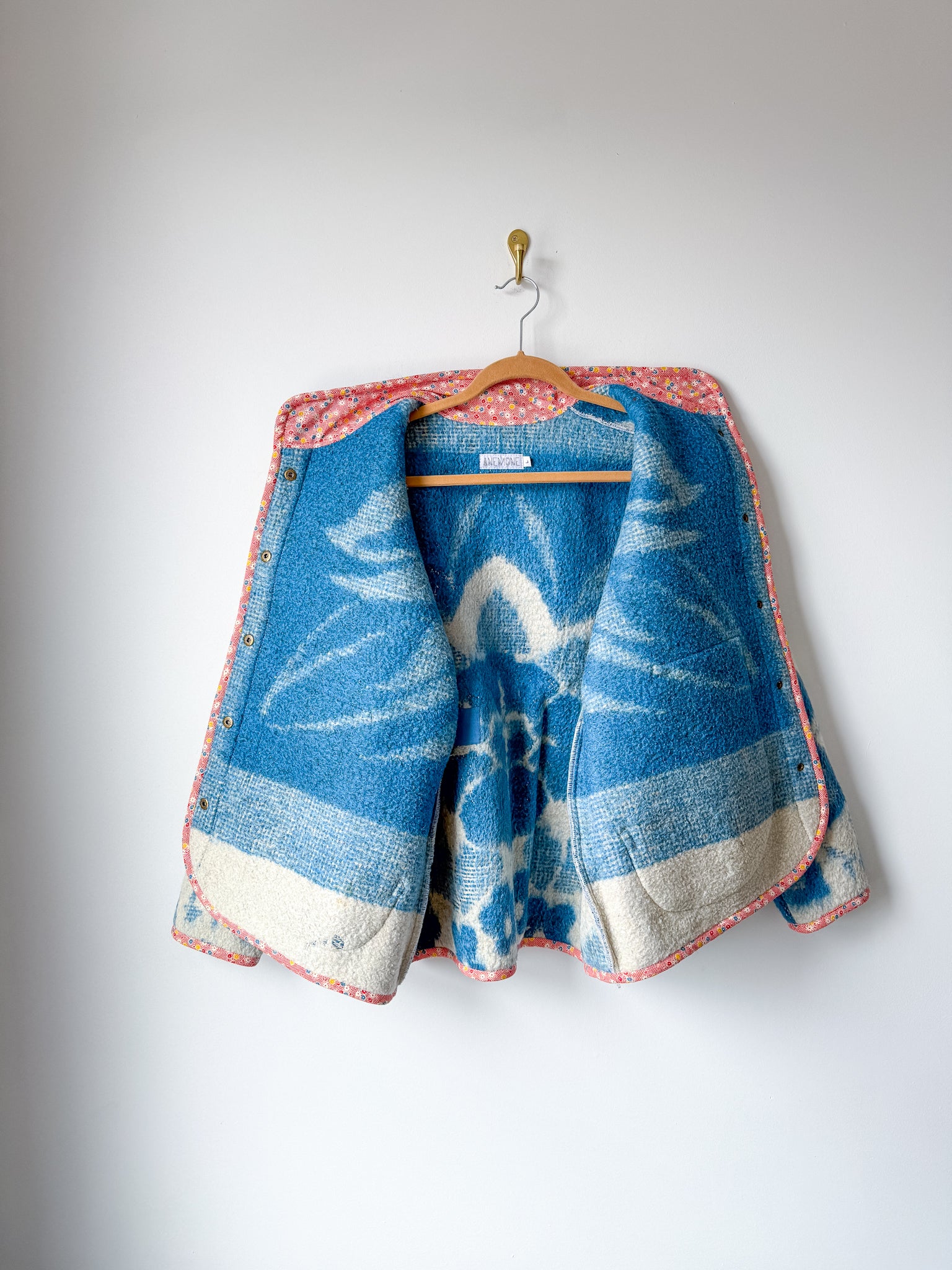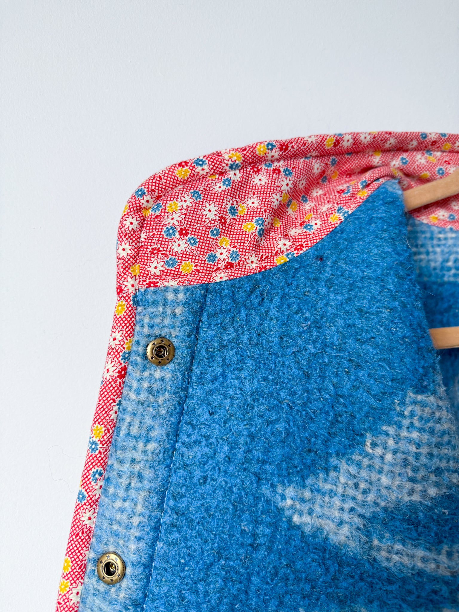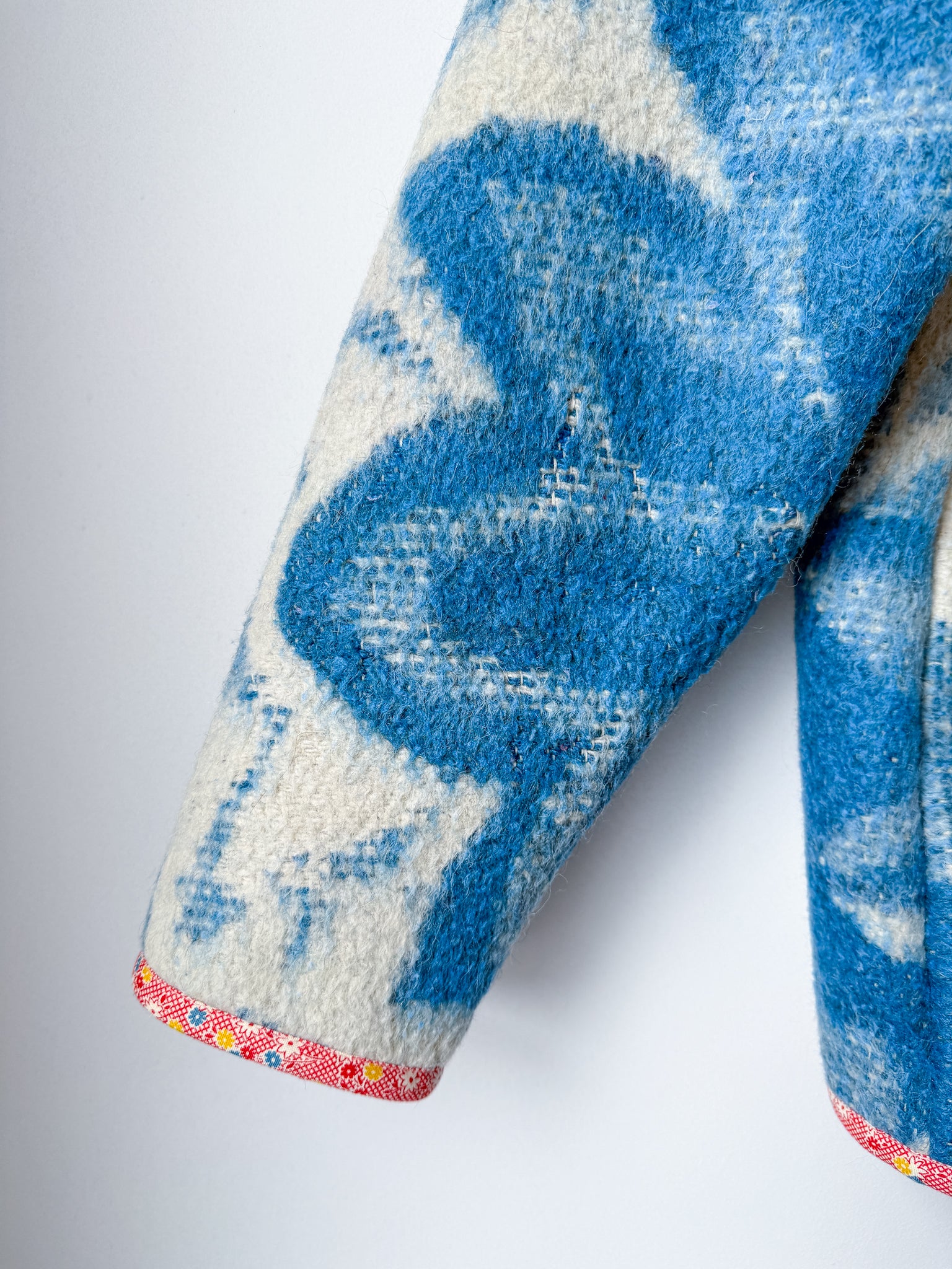This Flora Jacket is made from a vintage blanket sourced from Ukraine. The front plackets have been constructed from a portion of a handwoven coverlet, while the inner collar and outer edges are bound in a cotton fabric in red, blue and yellow floral that perfectly compliments the placket and blue of the jacket.