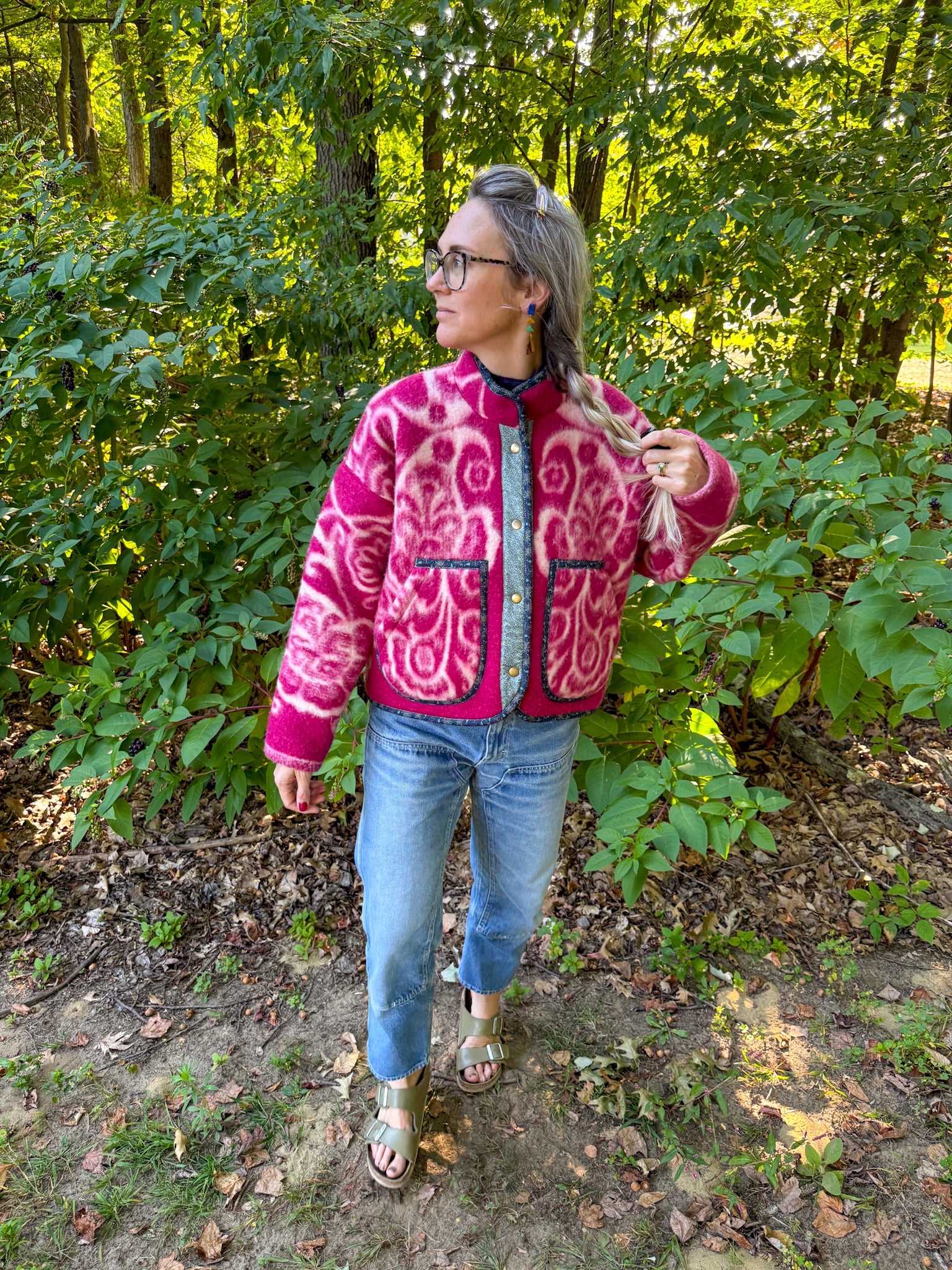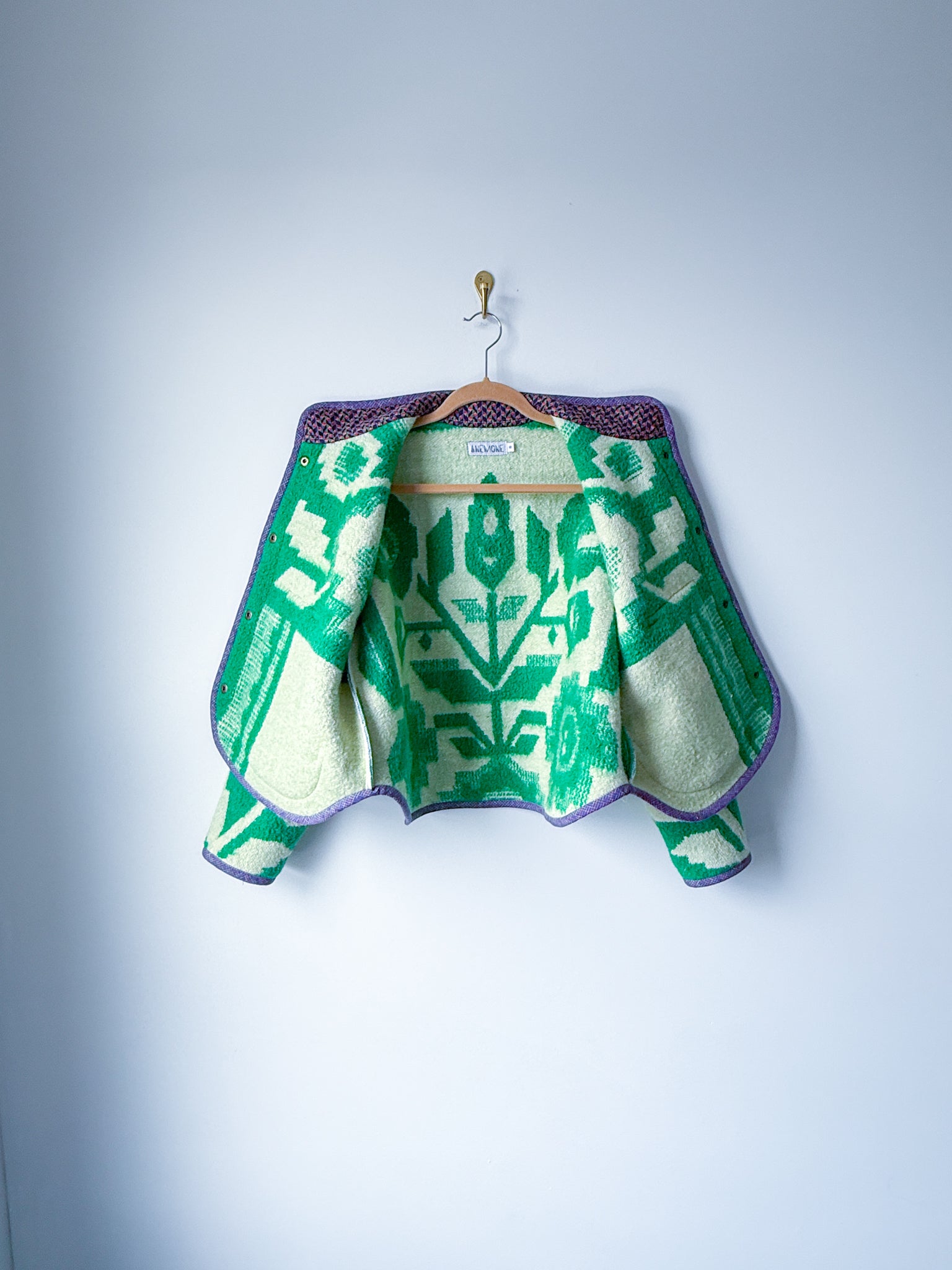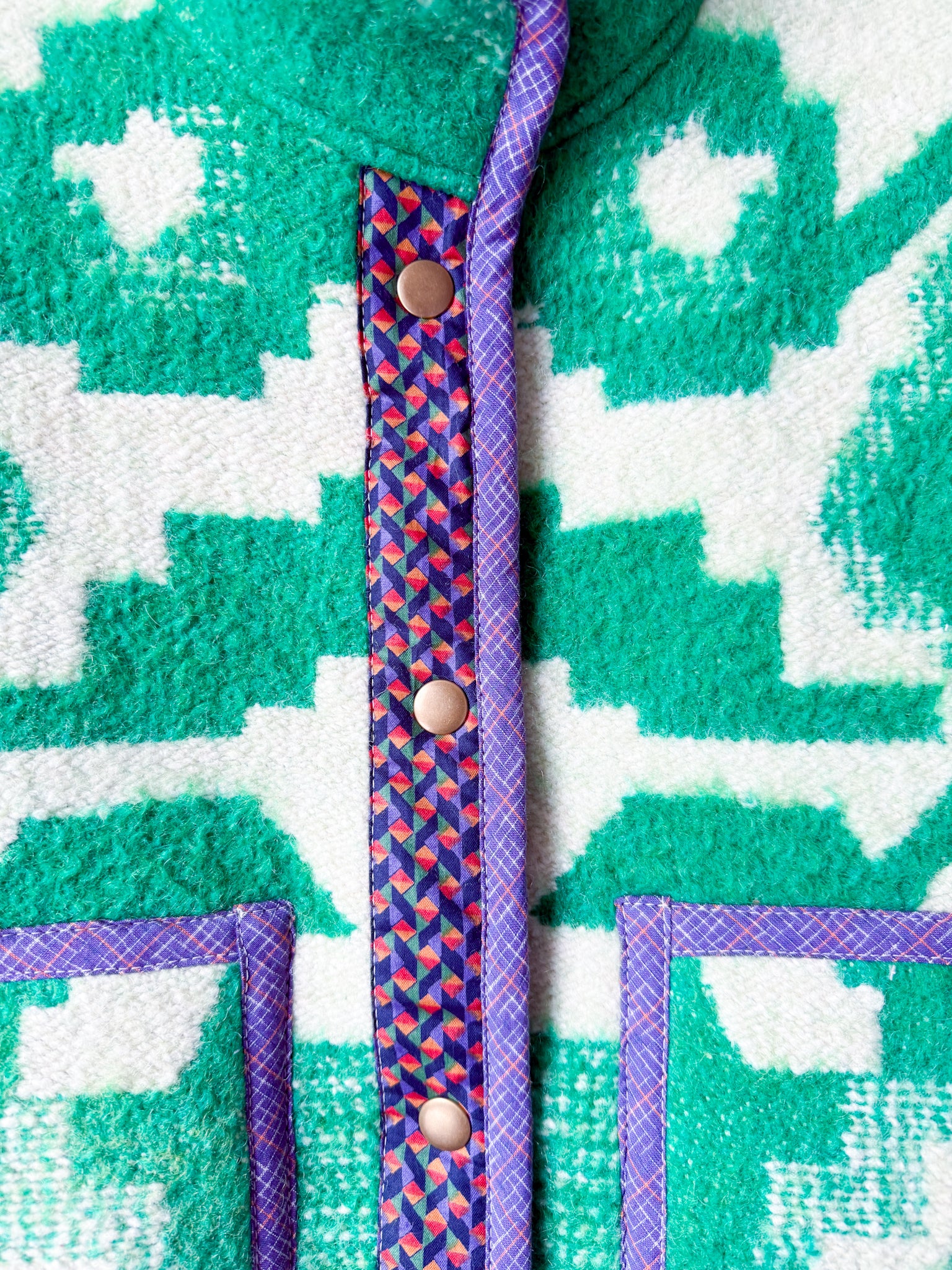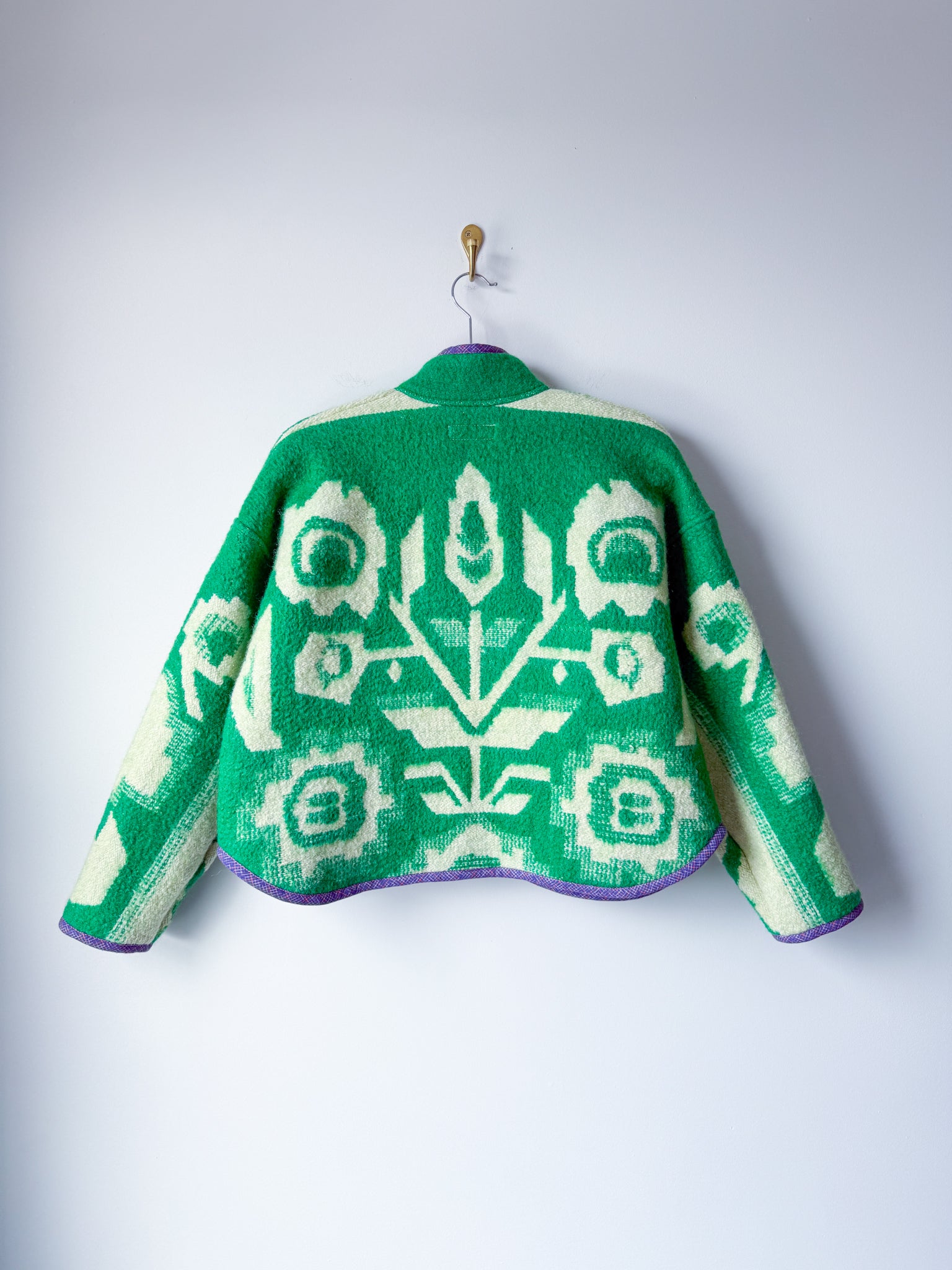 This Flora Jacket is made from a vintage blanket sourced from Ukraine, in a gorgeous kelly green with a contrast floral pattern. The front plackets and inner collar are lined in a vintage batik patterned fabric, while the edges, pockets, and sleeves are bound in a woven cotton that pairs perfectly with the collar and placket fabric.