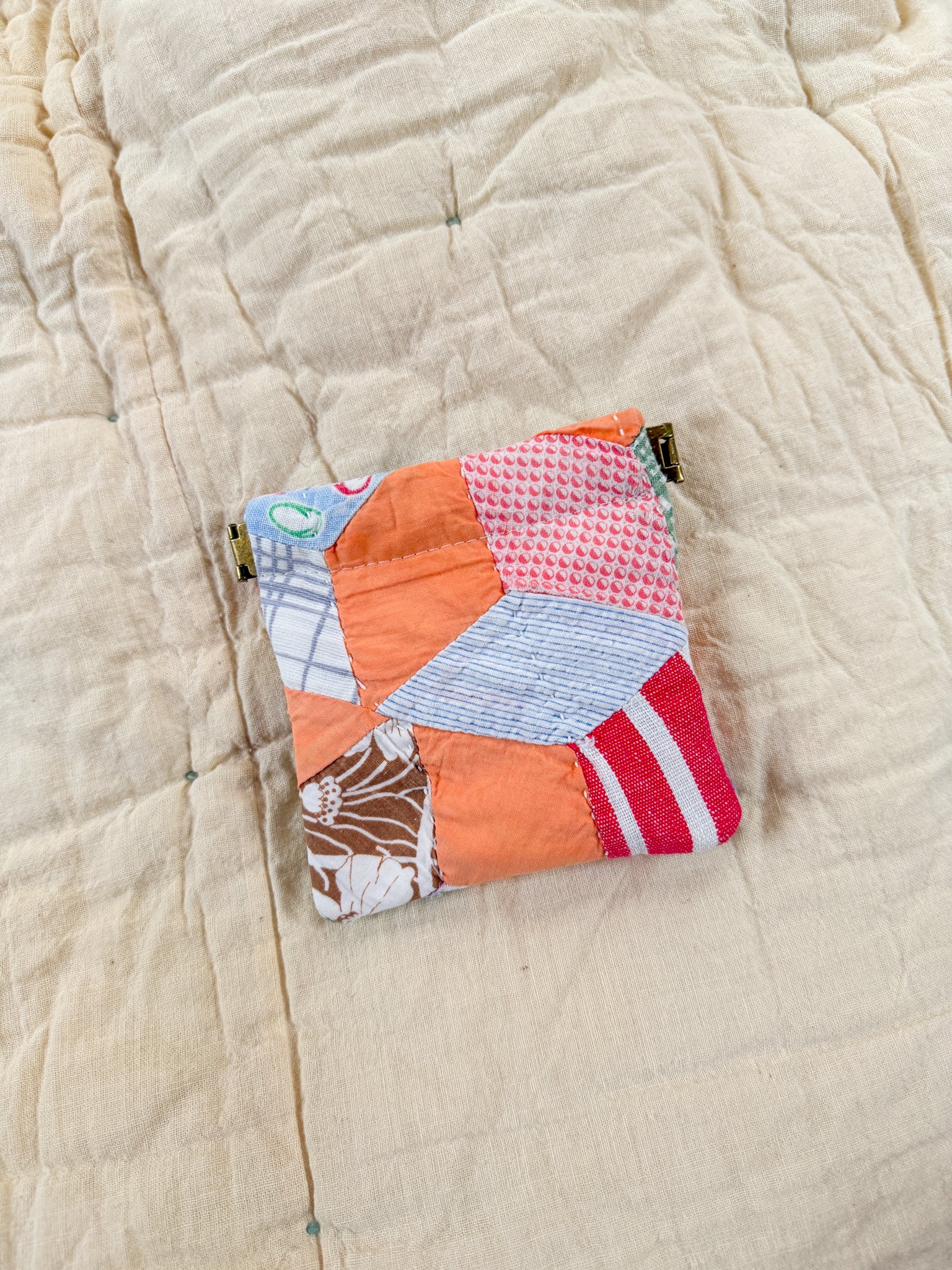 This quilted case is lined in vintage textile remnants (because nothing goes to waste around here!) and features a squeeze frame top to keep the contents securely stored without fear of falling out into the depths of your purse, backpack, glove compartment, coat, life, etc.