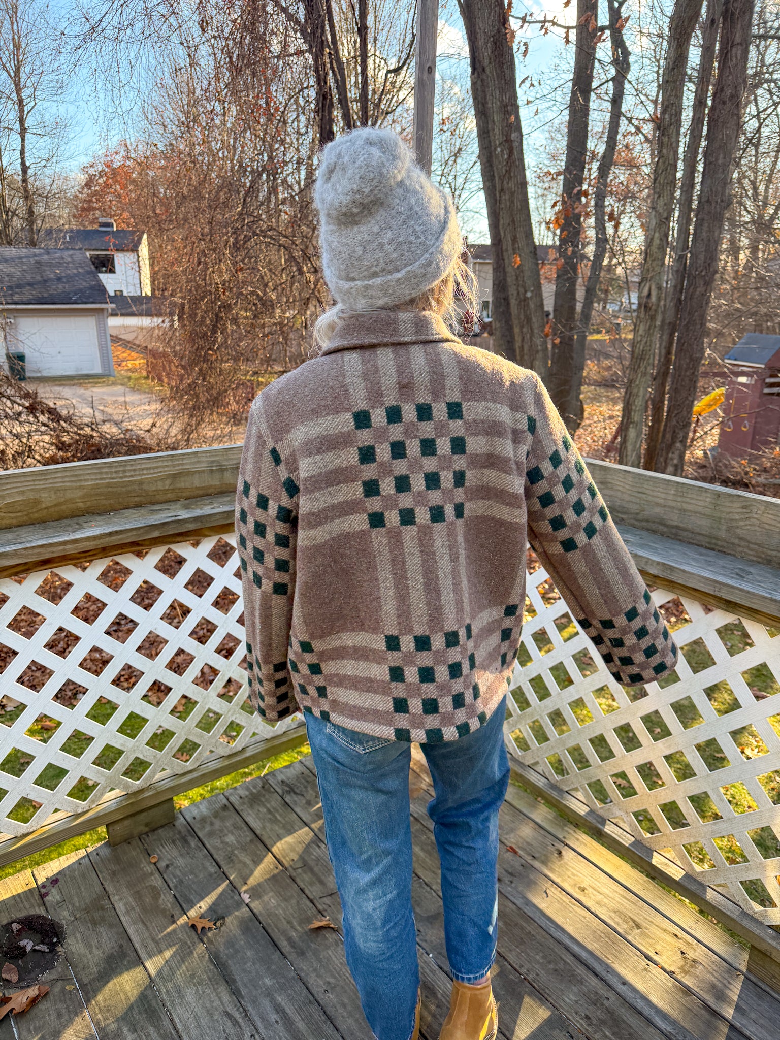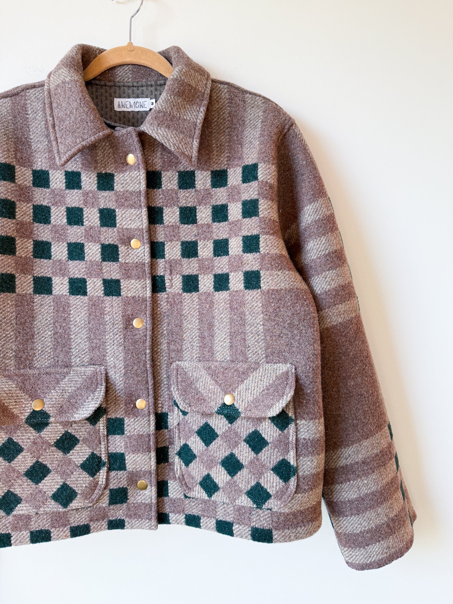This vintage 100% wool blanket has been reworked into a Field Jacket, which features a slight drop shoulder and tapered sleeve, with a straight silhouette, complete with flap front patch pockets and antique brass snaps. The inner facings, back of the neck, under-collar, and pockets feature vintage flannel fabric.
