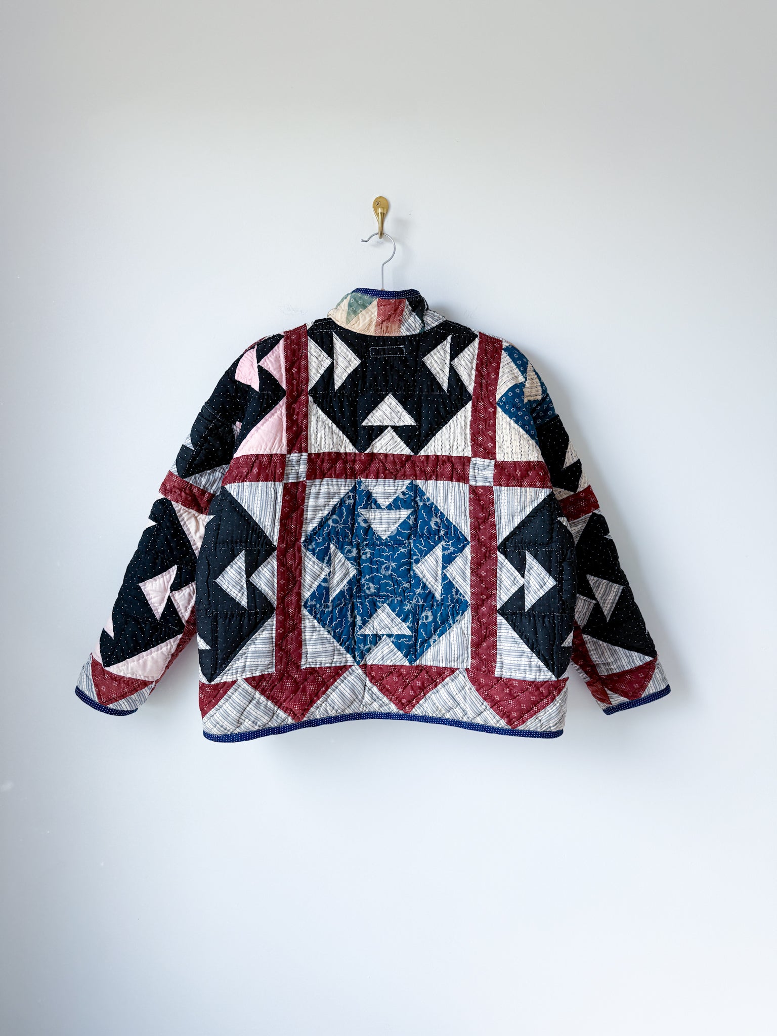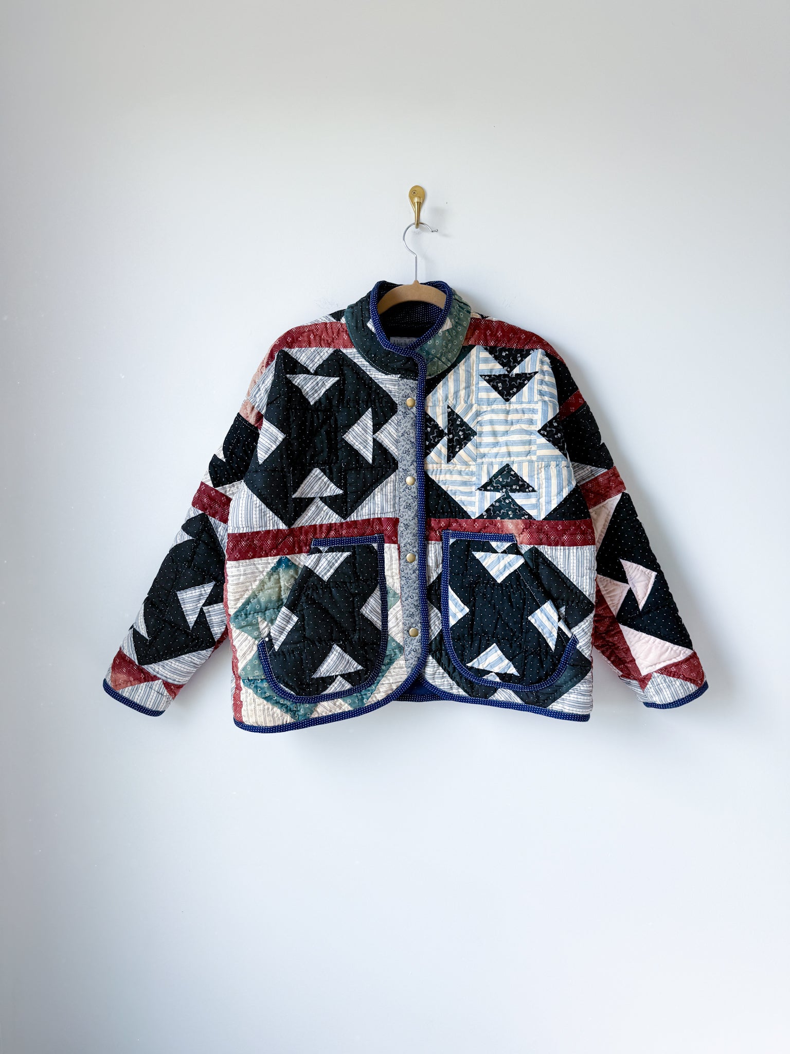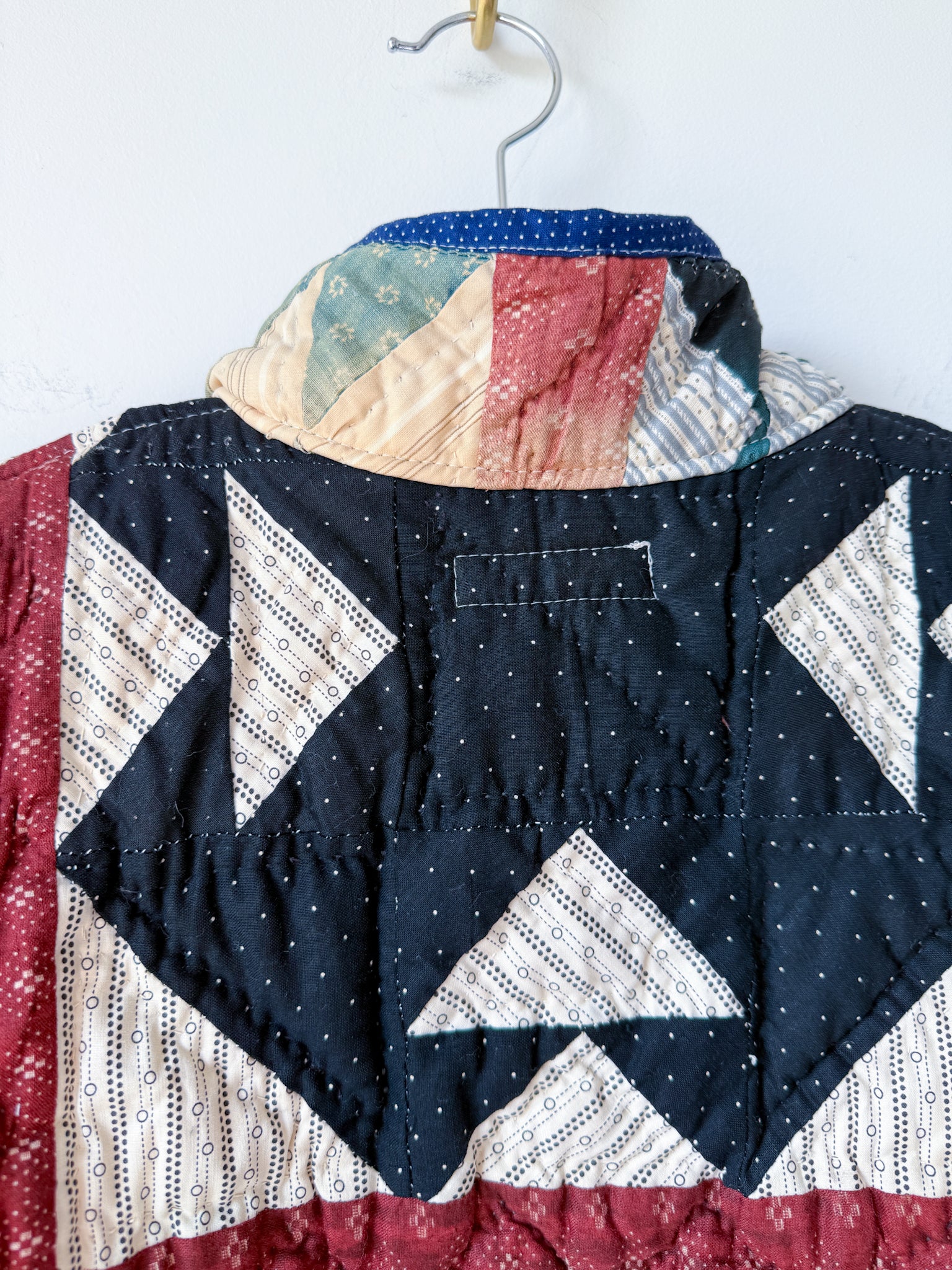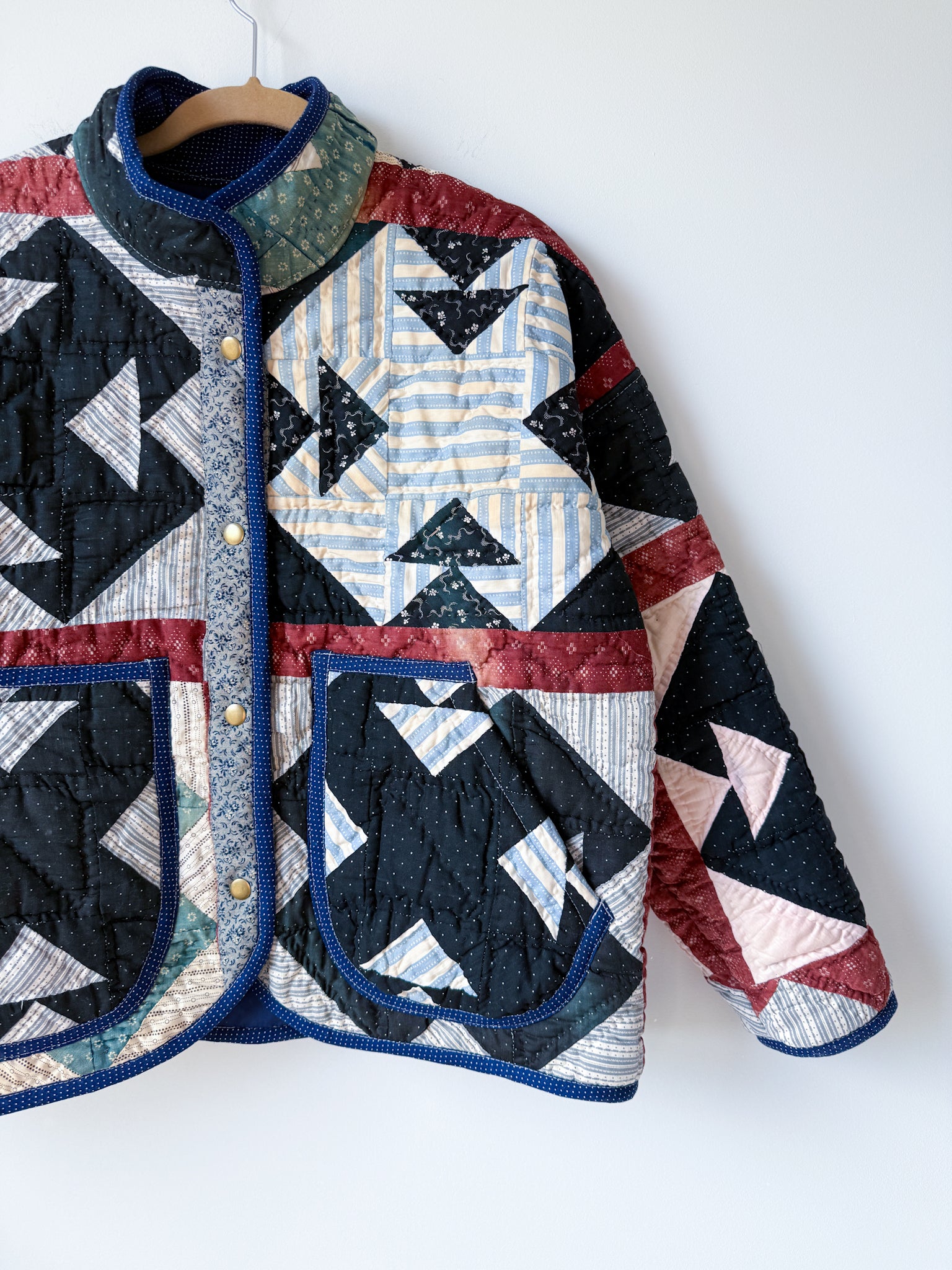 This Flora Jacket is made from a midweight quilt that is hand-pieced and quilted (with black thread in areas!) in a Churn Dash pattern. This quilt dates back to the mid to late 19th century, and was found at an estate here in Vermont. While the front of the quilt was remarkably intact aside from sun damage and fabric disintegration in areas, the entire back was brittle and disintegrating throughout. To give this quilt a new life, this jacket has been fully lined in a deep navy lining fabric. The edges are bound in an indigo dot fabric native to the time period, and the front plackets are constructed from a blue and gray toned floral print vintage cotton.