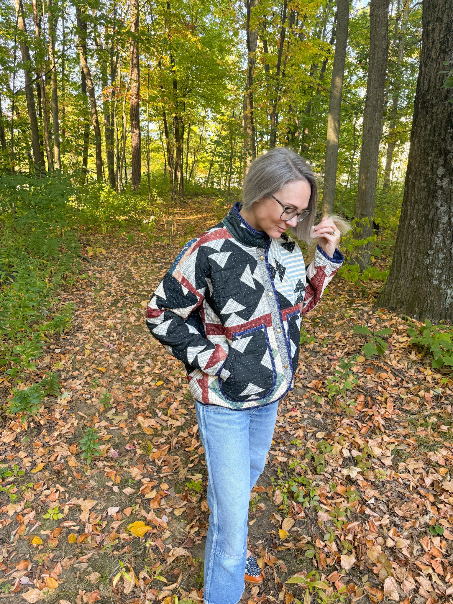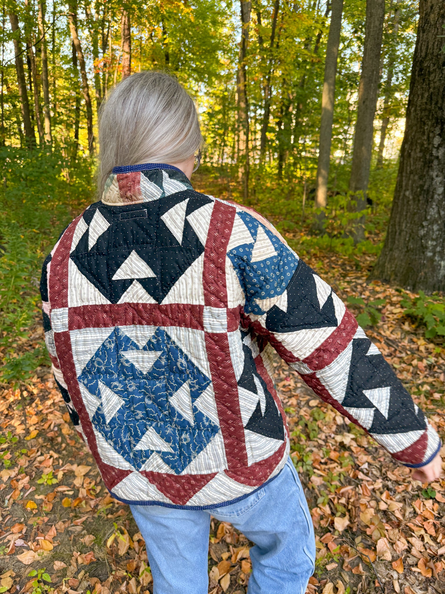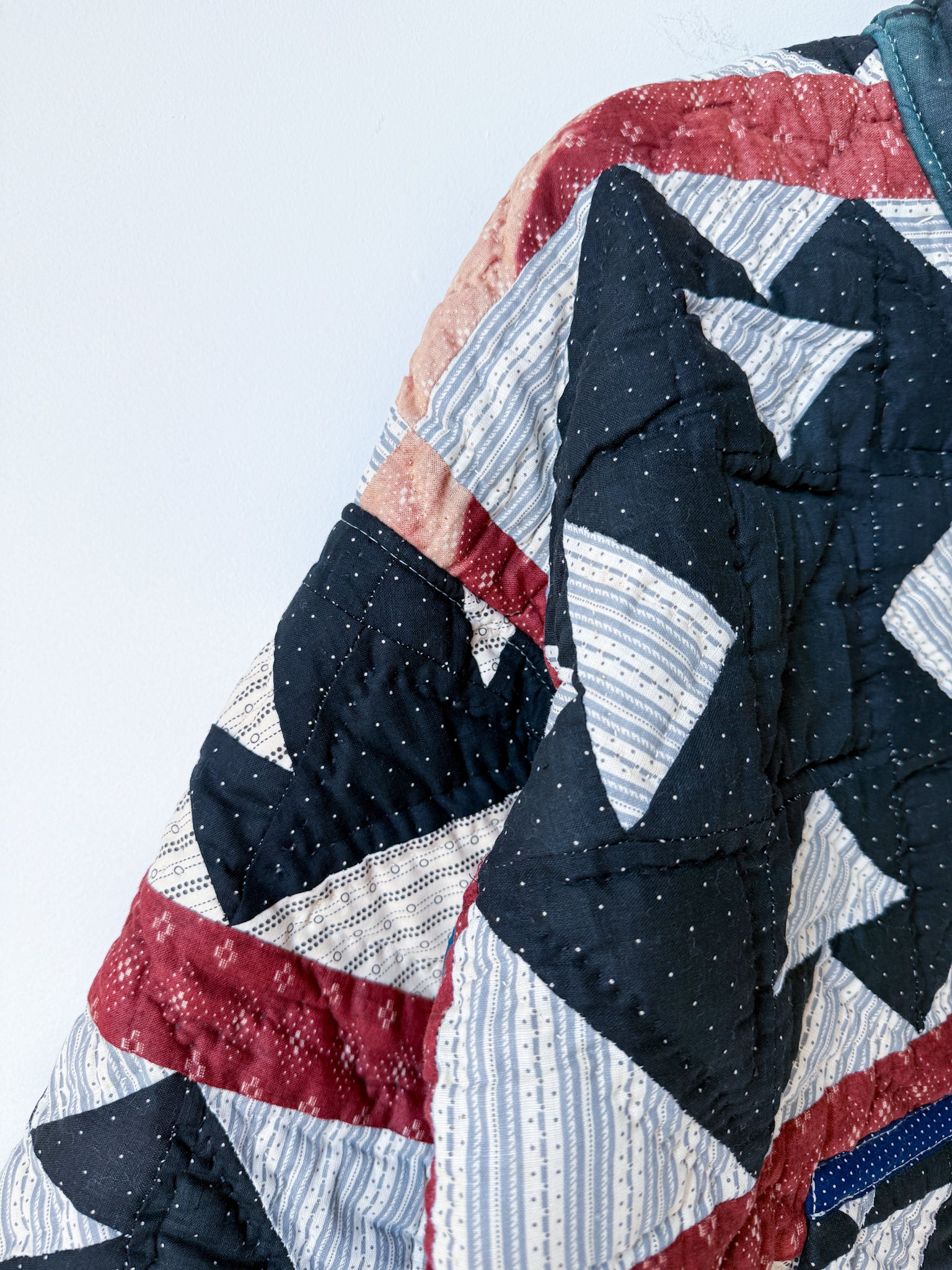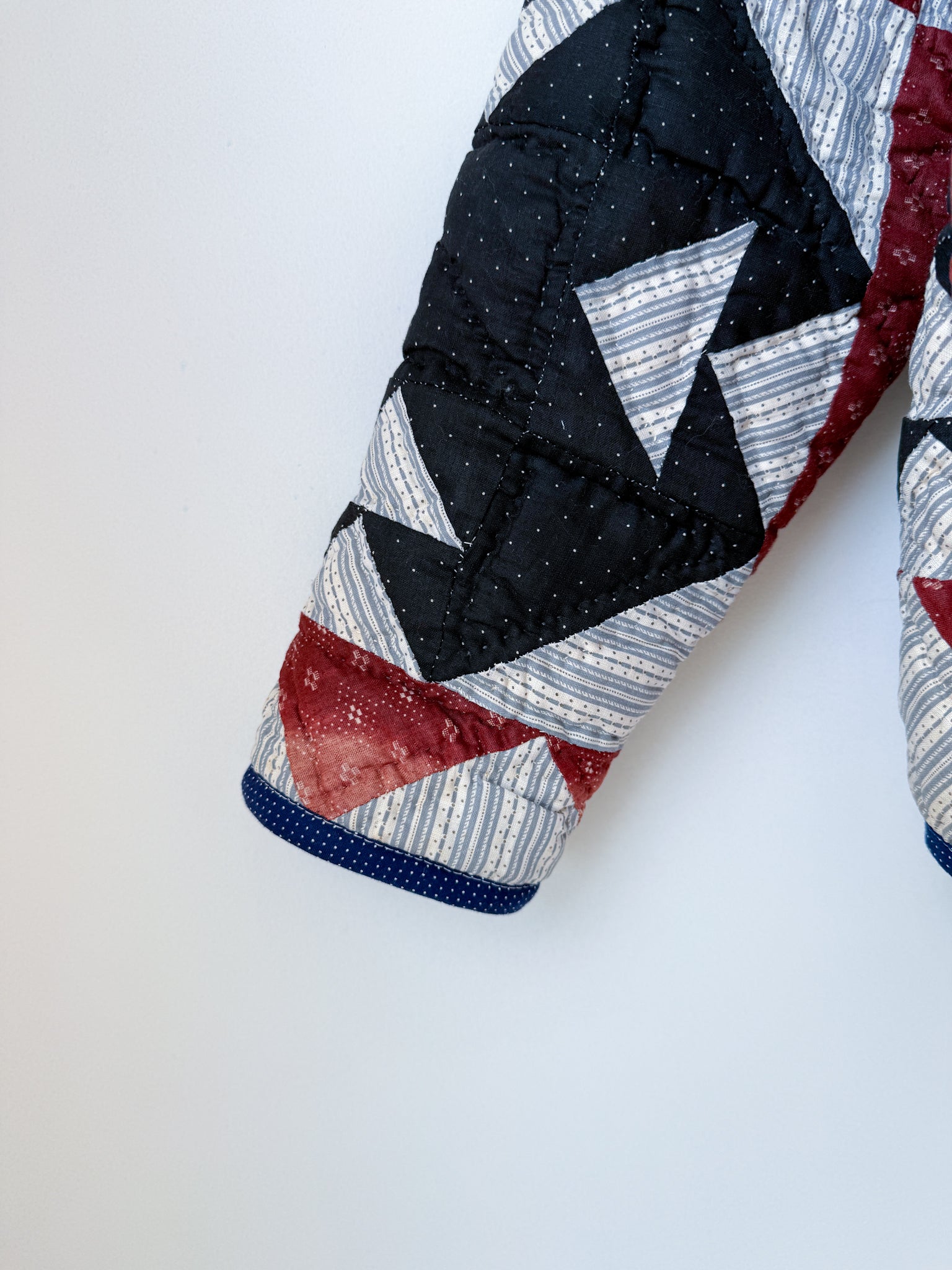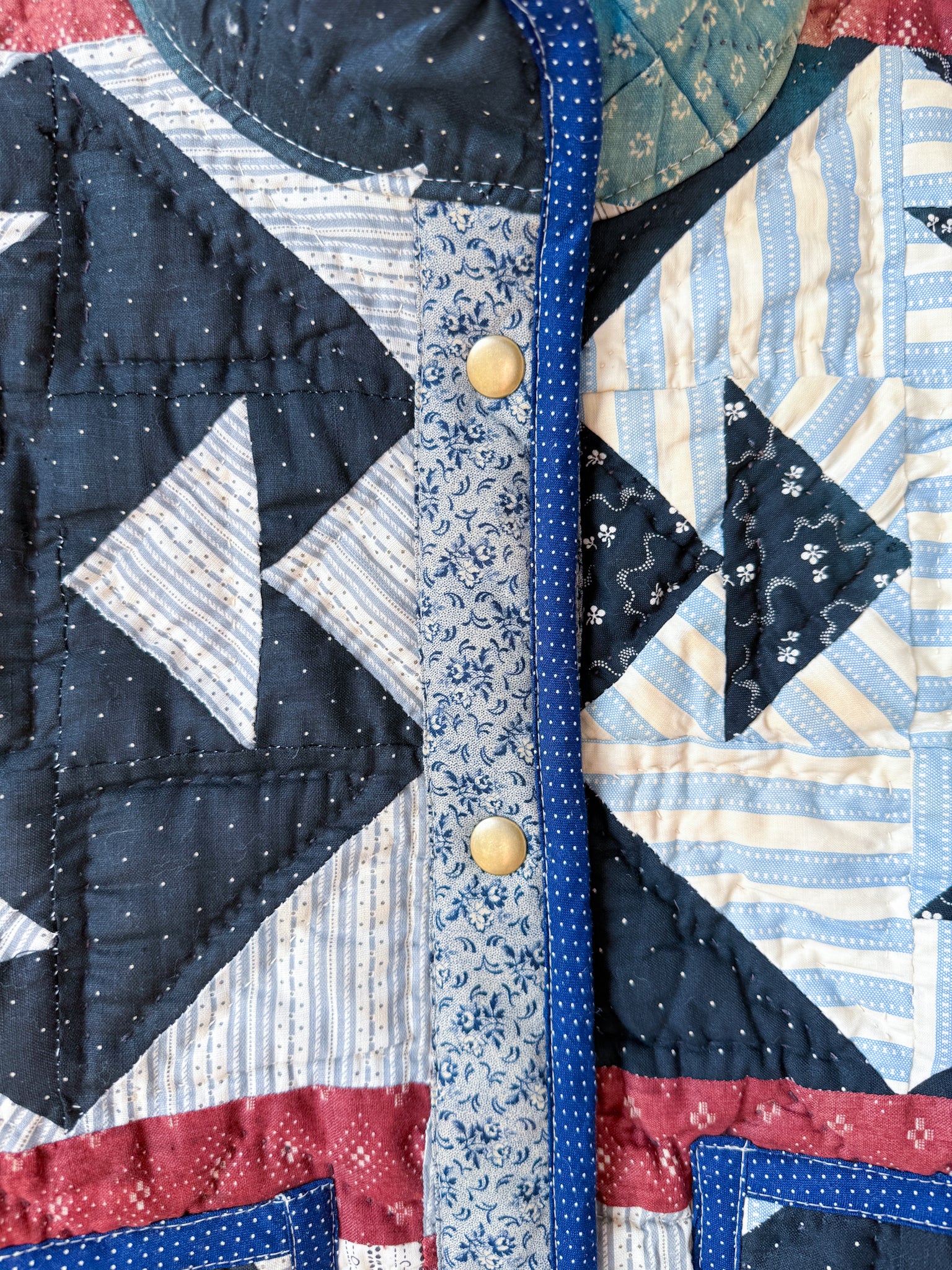 This Flora Jacket is made from a midweight quilt that is hand-pieced and quilted (with black thread in areas!) in a Churn Dash pattern. This quilt dates back to the mid to late 19th century, and was found at an estate here in Vermont. While the front of the quilt was remarkably intact aside from sun damage and fabric disintegration in areas, the entire back was brittle and disintegrating throughout. To give this quilt a new life, this jacket has been fully lined in a deep navy lining fabric. The edges are bound in an indigo dot fabric native to the time period, and the front plackets are constructed from a blue and gray toned floral print vintage cotton.