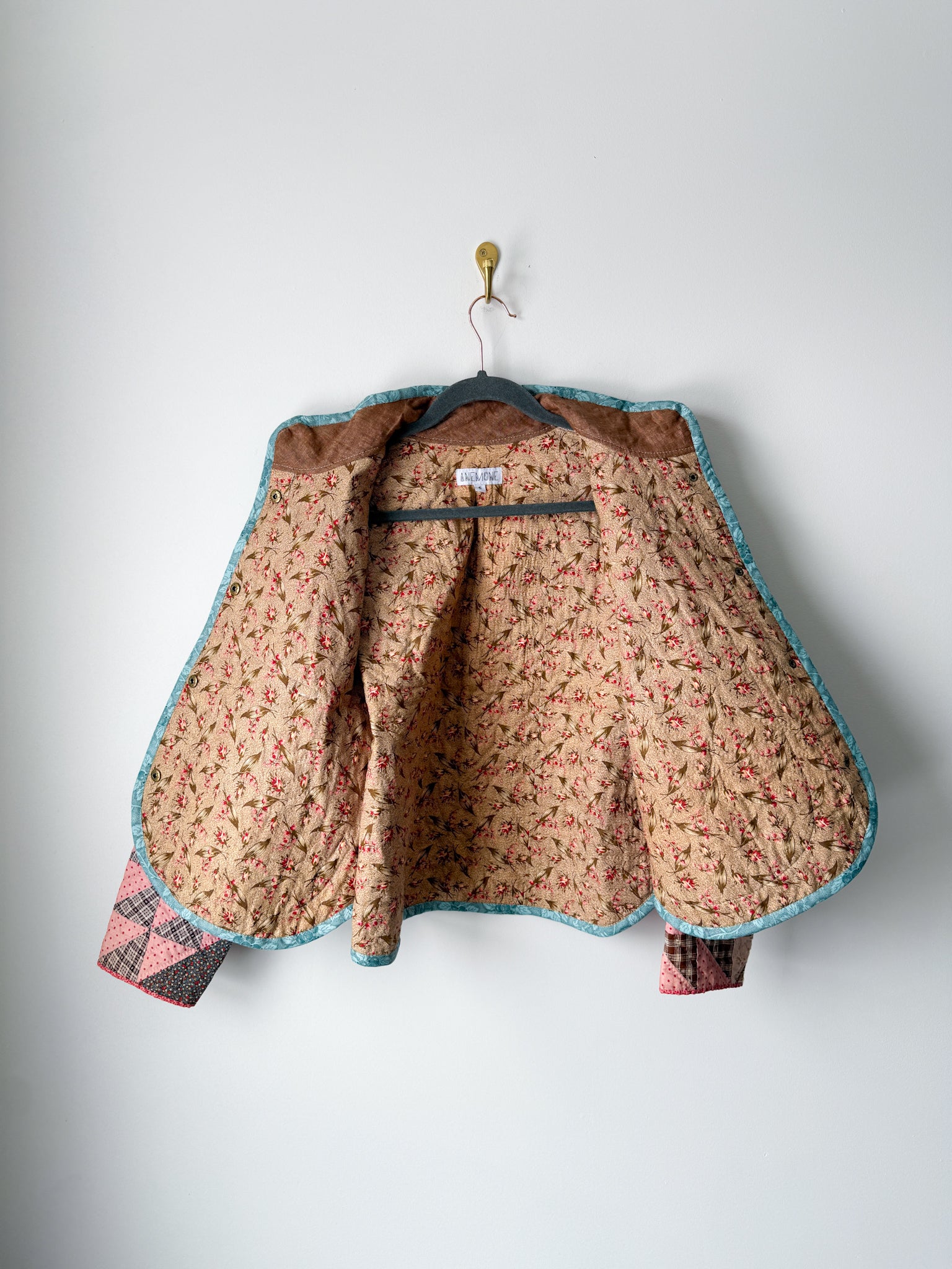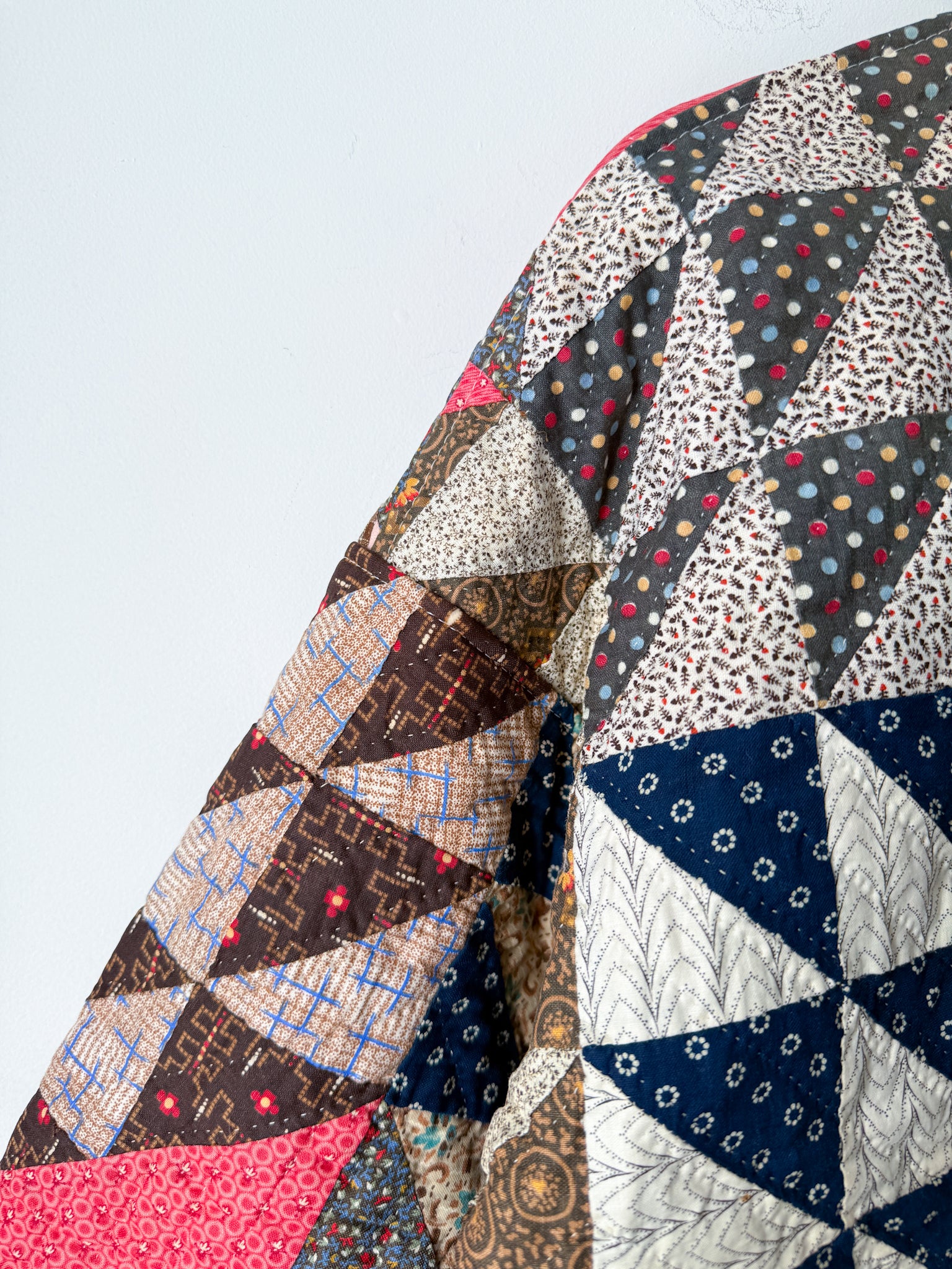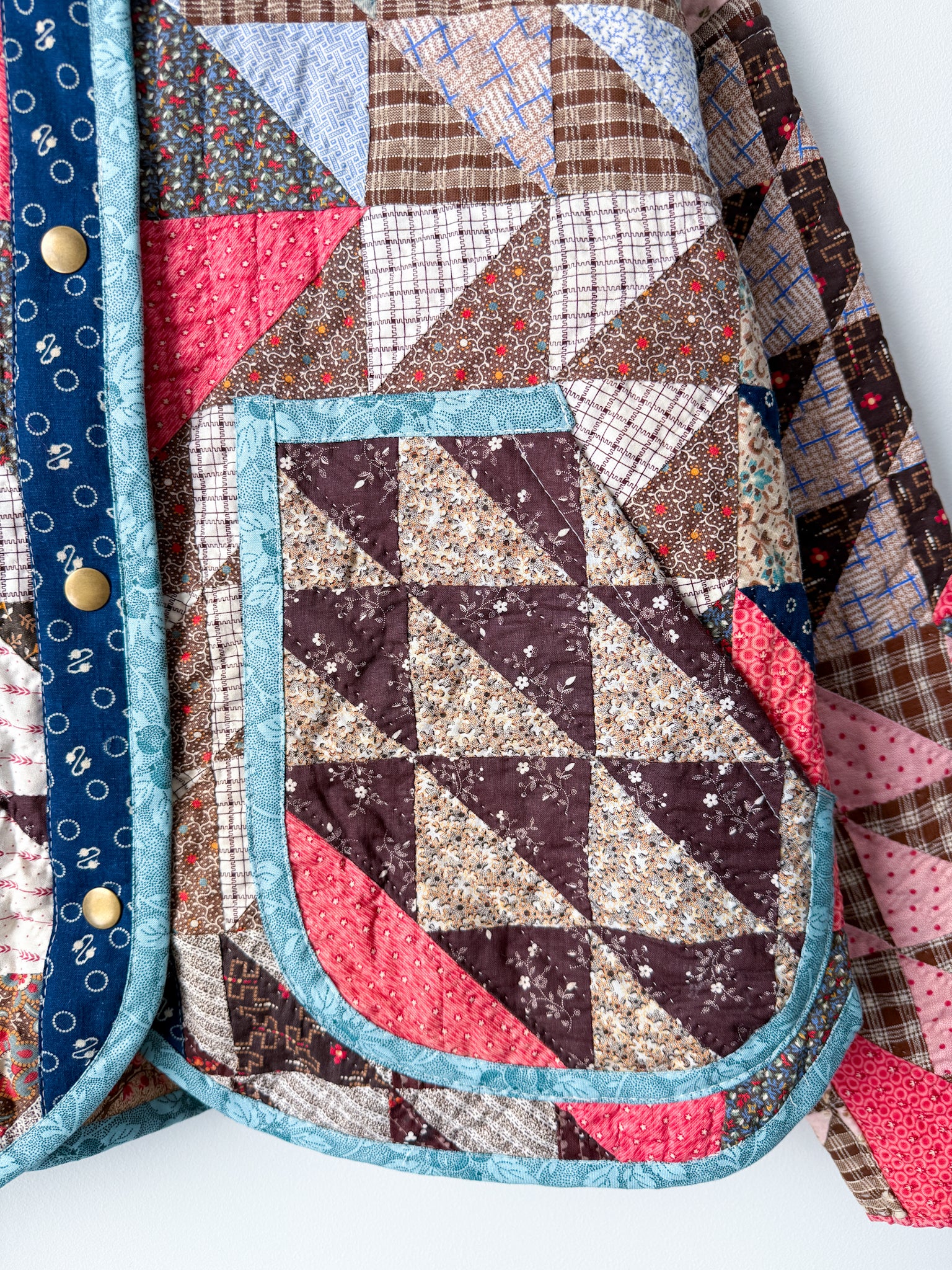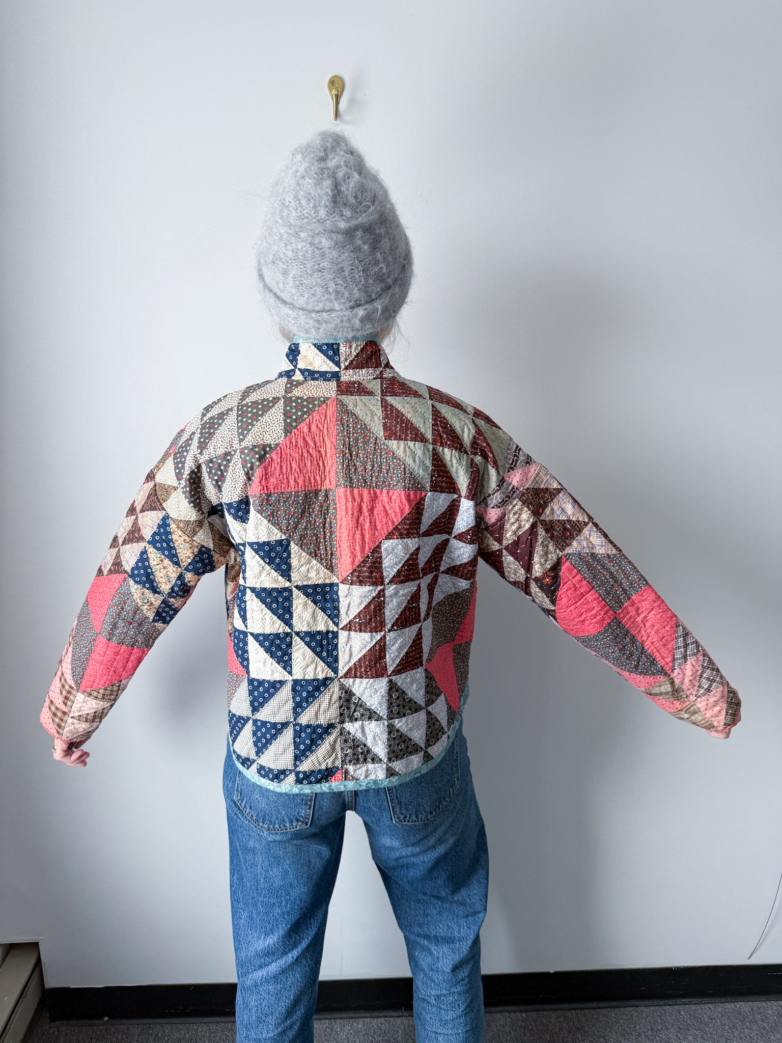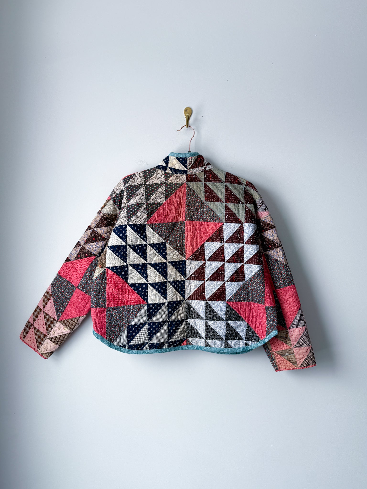 This Flora Jacket is made from a summer-weight 19th century quilt that is hand pieced and quilted in a Windmill pattern (similar to Ocean Waves) - there are extraordinary fabrics used on the quilt top, with a whole cloth backing that is equally stunning. The fabrics and quilt as a whole is remarkably intact for its age (there were highly damaged areas along the fold lines of the original quilt, but they were able to be worked around). The pockets and outer edges bound in an indigo floral. The front plackets are truly special - constructed from the last remaining bits of antique indigo deadstock fabric found at a local auction here in Vermont.