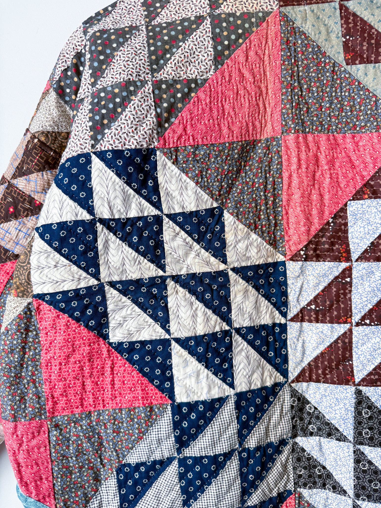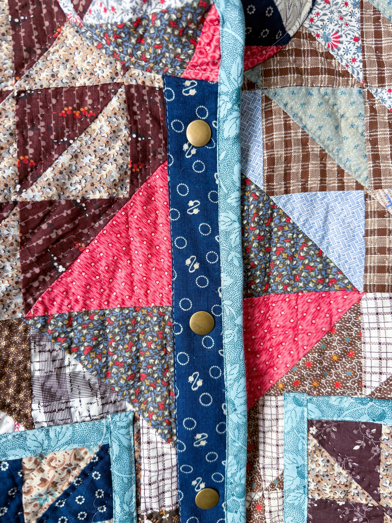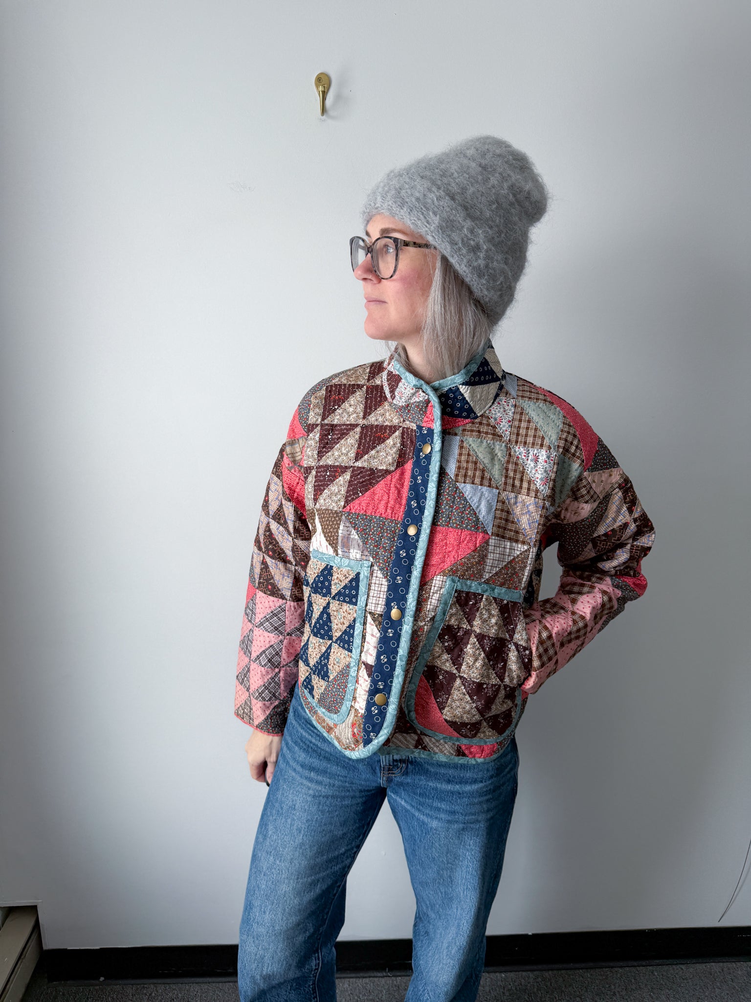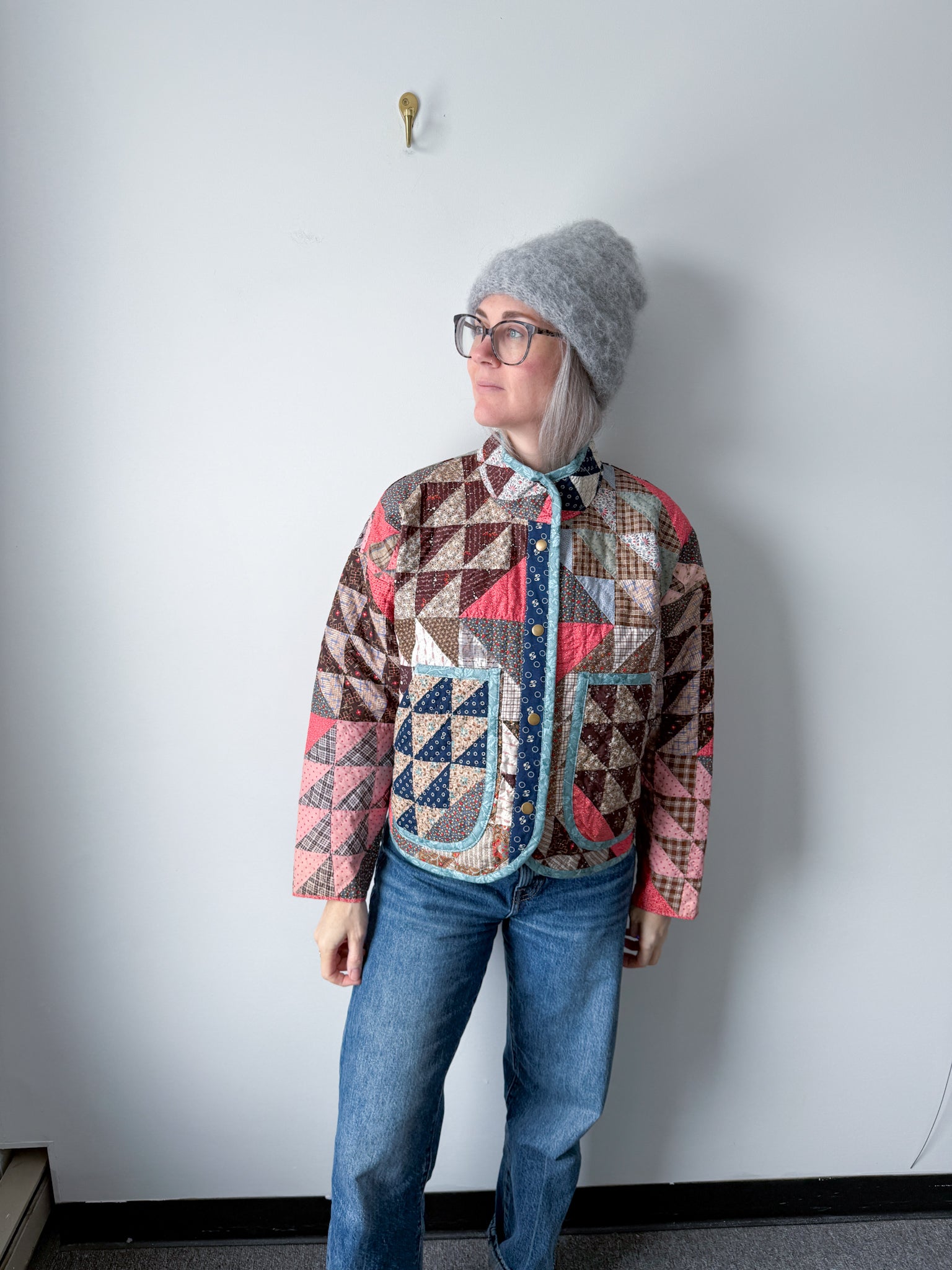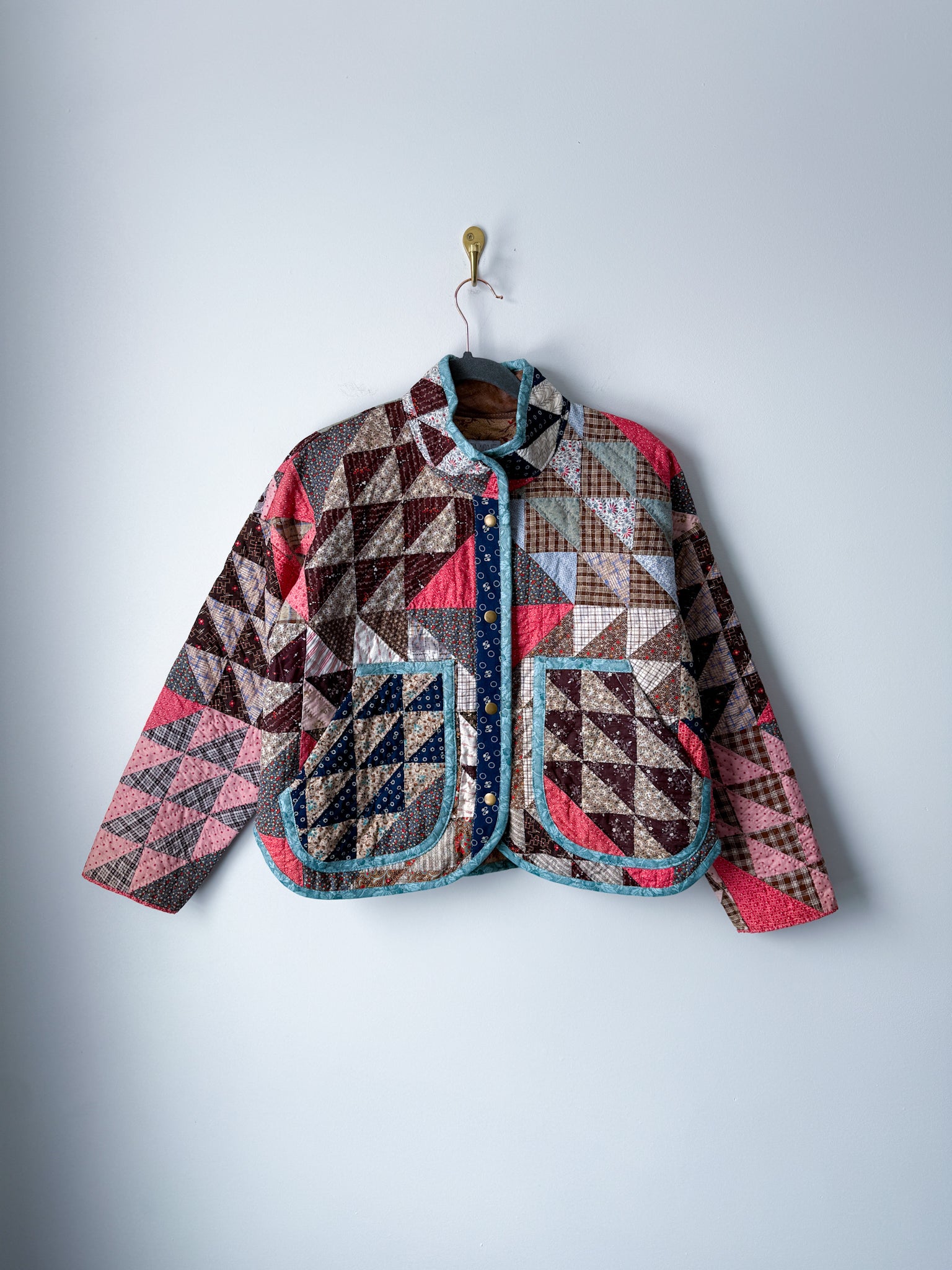 This Flora Jacket is made from a summer-weight 19th century quilt that is hand pieced and quilted in a Windmill pattern (similar to Ocean Waves) - there are extraordinary fabrics used on the quilt top, with a whole cloth backing that is equally stunning. The fabrics and quilt as a whole is remarkably intact for its age (there were highly damaged areas along the fold lines of the original quilt, but they were able to be worked around). The pockets and outer edges bound in an indigo floral. The front plackets are truly special - constructed from the last remaining bits of antique indigo deadstock fabric found at a local auction here in Vermont.
