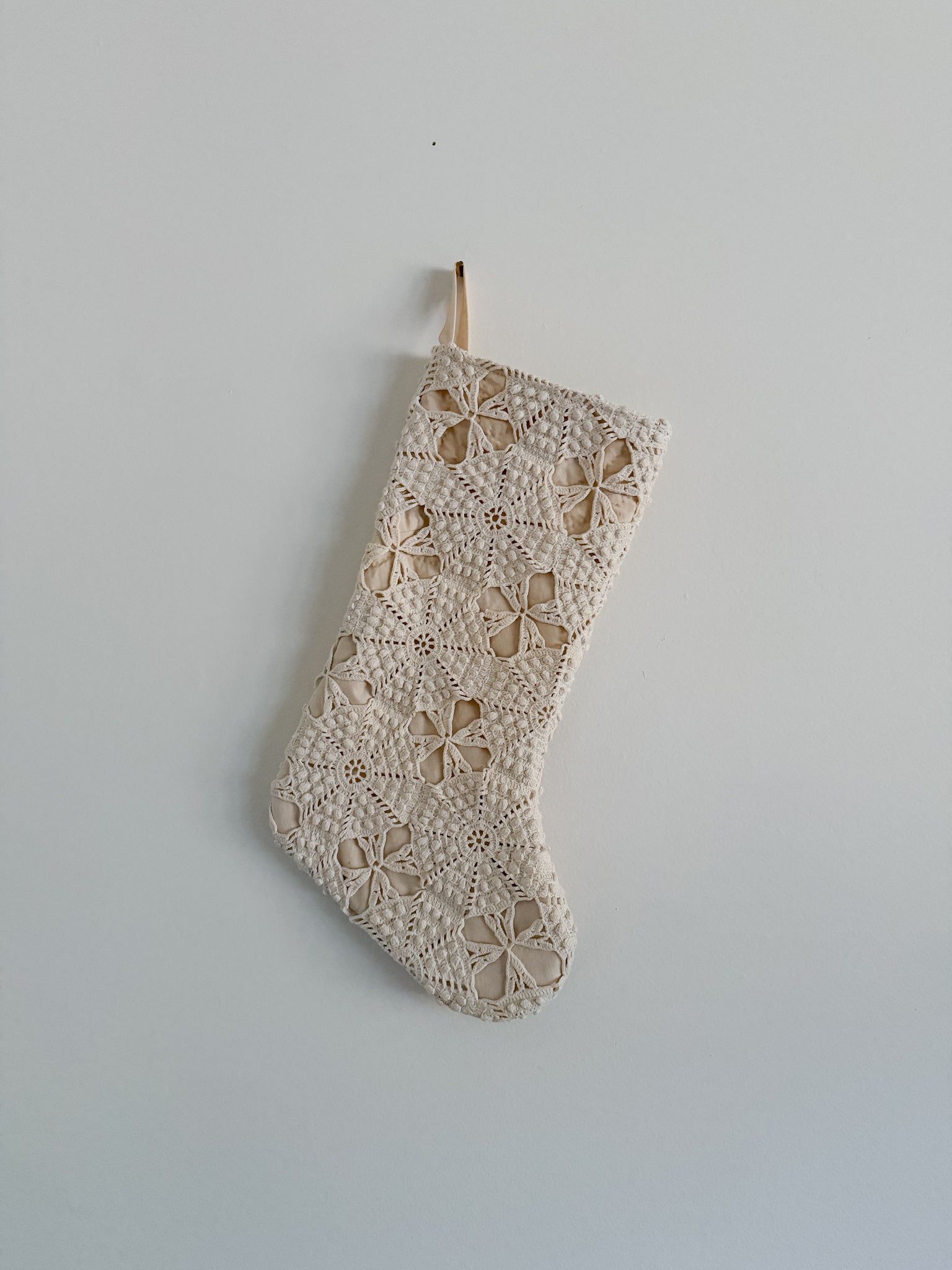 Cozy up your home for the holidays with an antique textile stocking or two! Each of these stockings features a portion of a hand crocheted coverlet, made meticulously by hand on a homestead in Vermont in the late 1800s. It has been backed with sturdy cream whole-cloth quilted fabric scraps, and fully lined. They have the perfect amount of stability and structure, and are ready to hold holiday treasures for years to come!