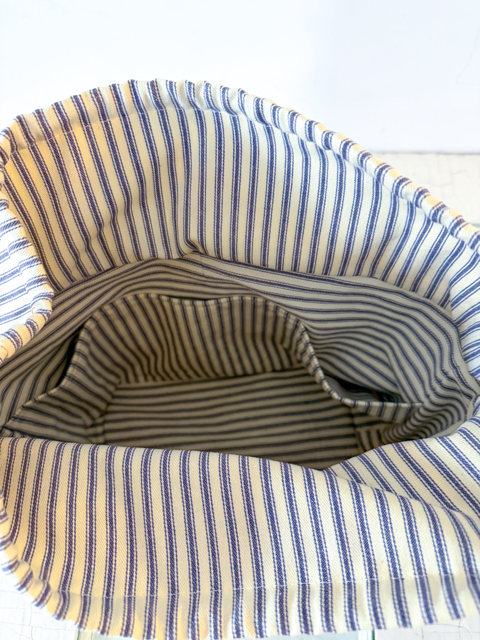 Introducing: The Project Bag with a detachable strap to wear crossbody, over the shoulder, or you can remove it to carry by the handles - this was created with the intention of corralling all your crafting bits and bobs, but doubles as a catch-all for whatever you need to bring with you wherever you go. This bag features an antique upper panel, leather handles and a detachable cotton webbing strap, waxed canvas bottom for durability that will age beautifully over time, and a drawstring cinch top for containing everything inside. This comfortably holds a couple skeins of yarn and whatever work in progress you might have (I've been using mine to hold a sweater I'm knitting!). The inside is fully lined in 100% cotton ticking stripe fabric and features 3 inside pockets.