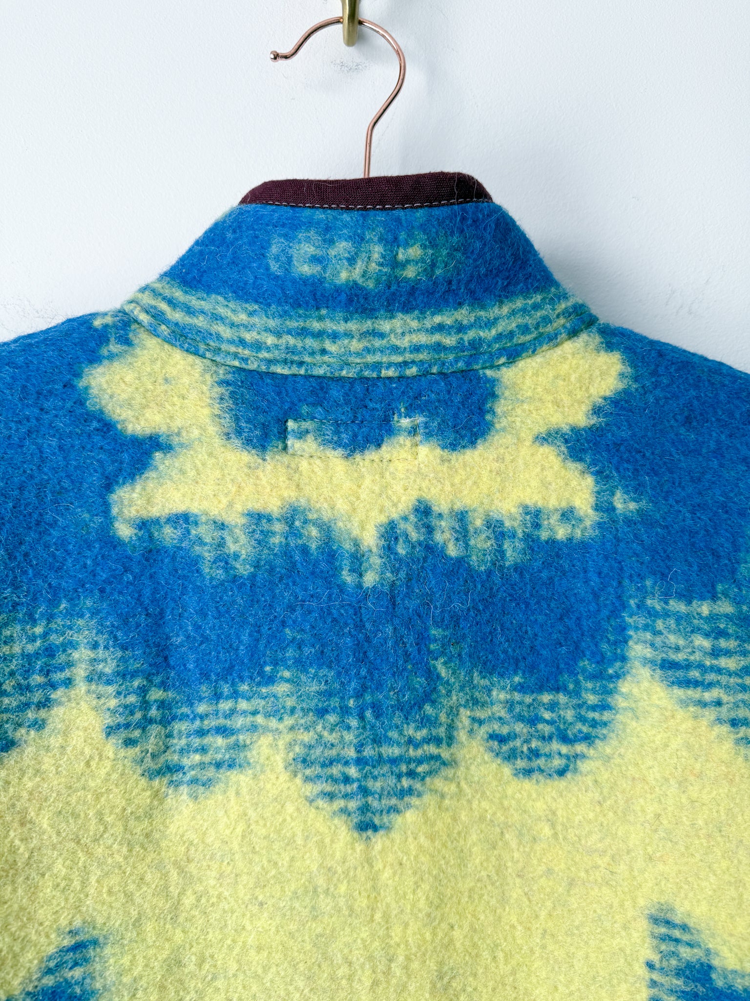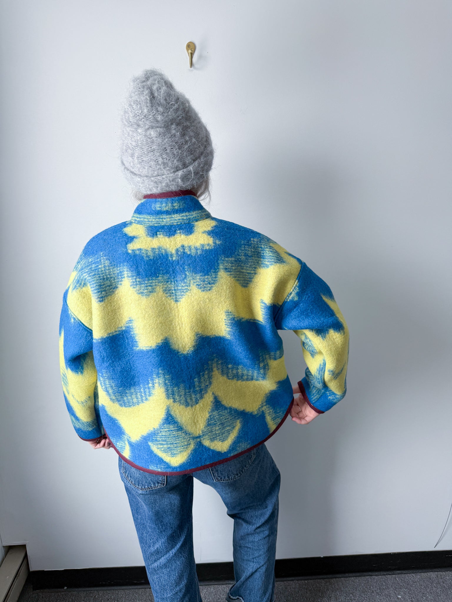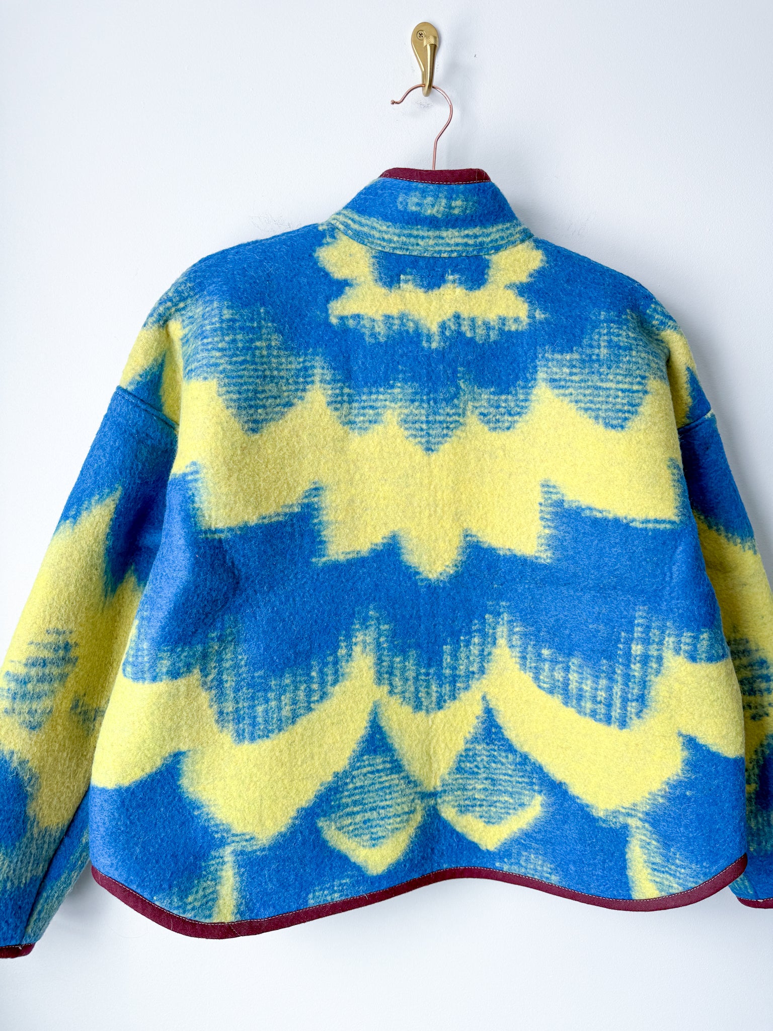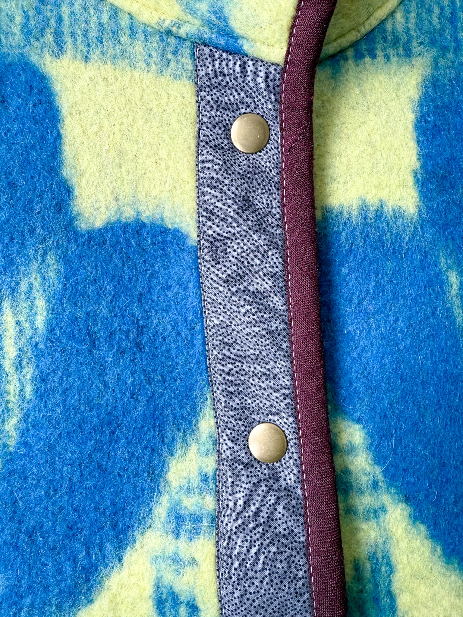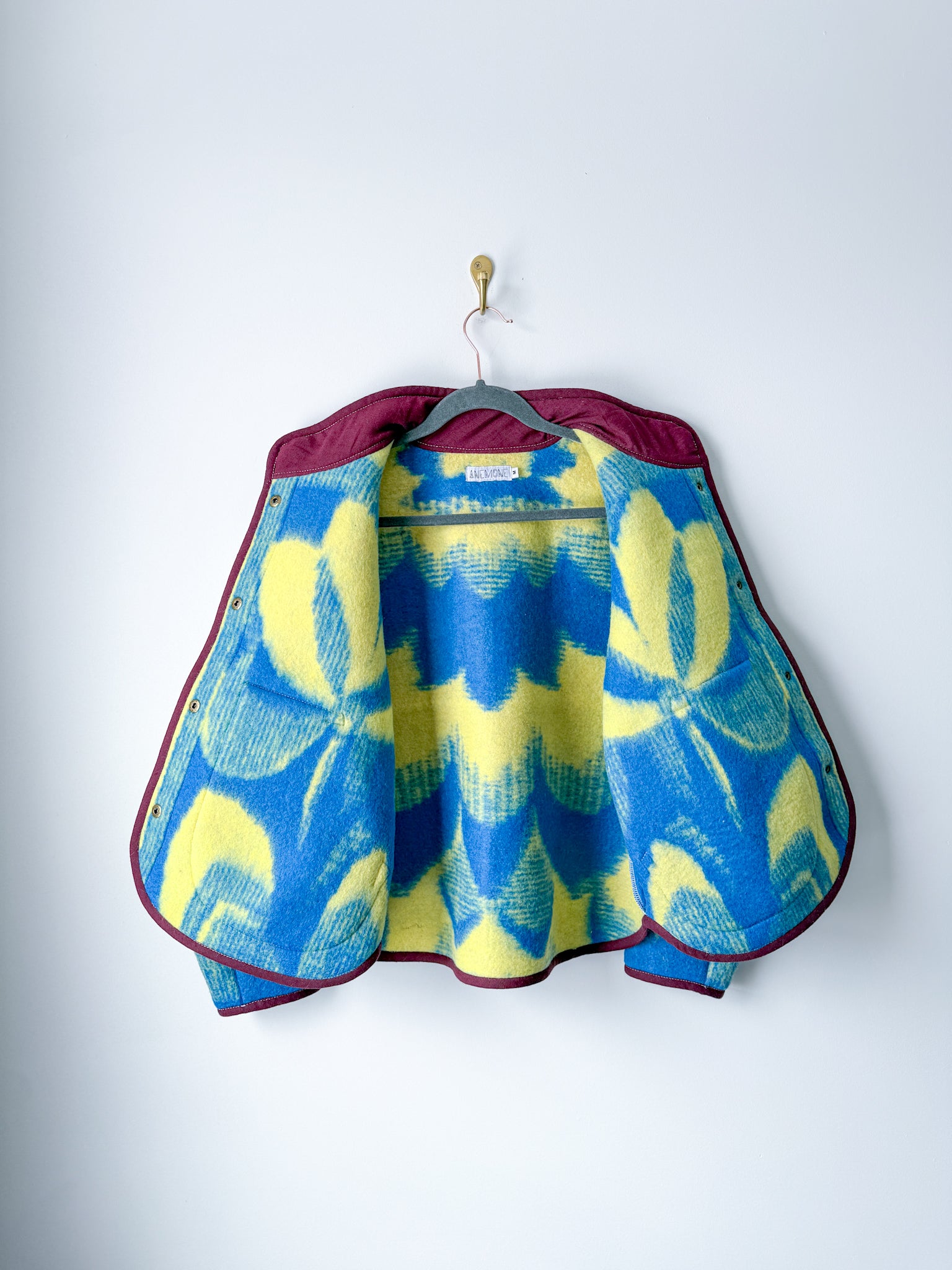This Flora Jacket is made from a vintage wool blanket sourced from Ukraine in a saturated blue and yellow large scale floral petal pattern!The front plackets and inner collar are pieced from a grayish purple cotton with ditsy dot print fabric, with the bound edges featuring a deep wine/burgundy linen.