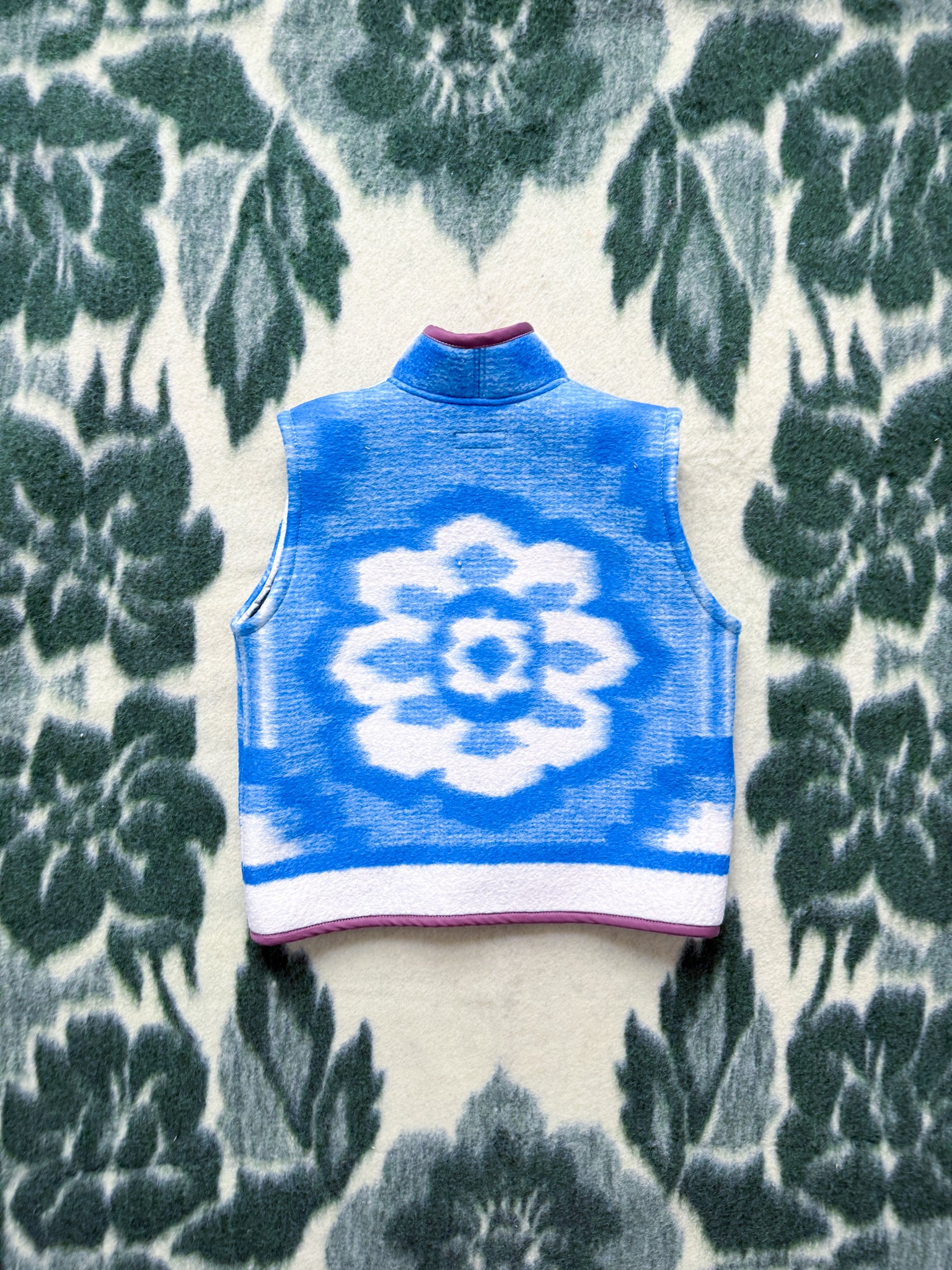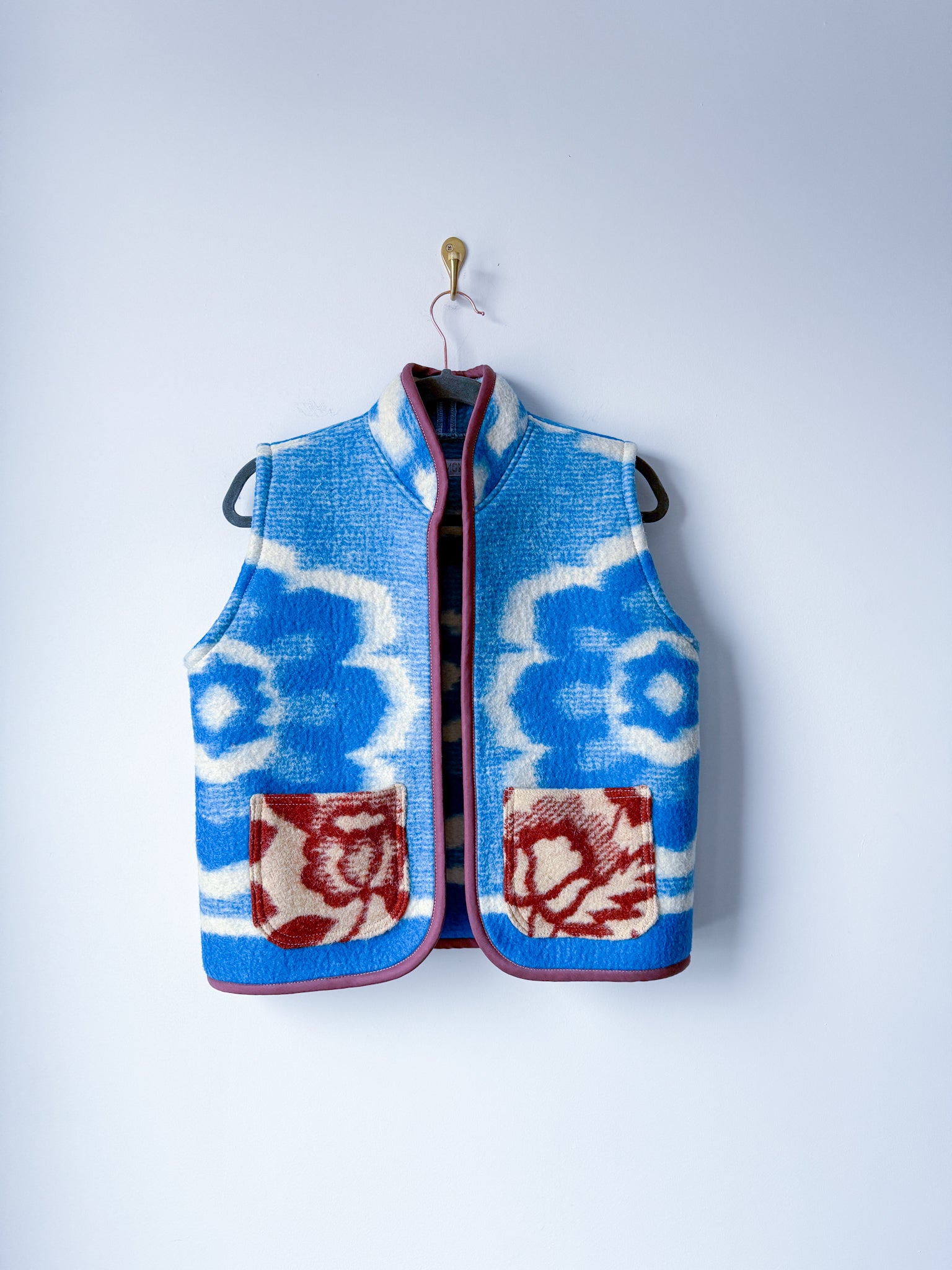This vest is made from a deadstock vintage wool blanket sourced from Ukraine, that is finished with plum-toned tencel twill binding, complete with contrast lined colorblock pockets that are made from the remnants of a rust colored wool blanket, also from Ukraine.