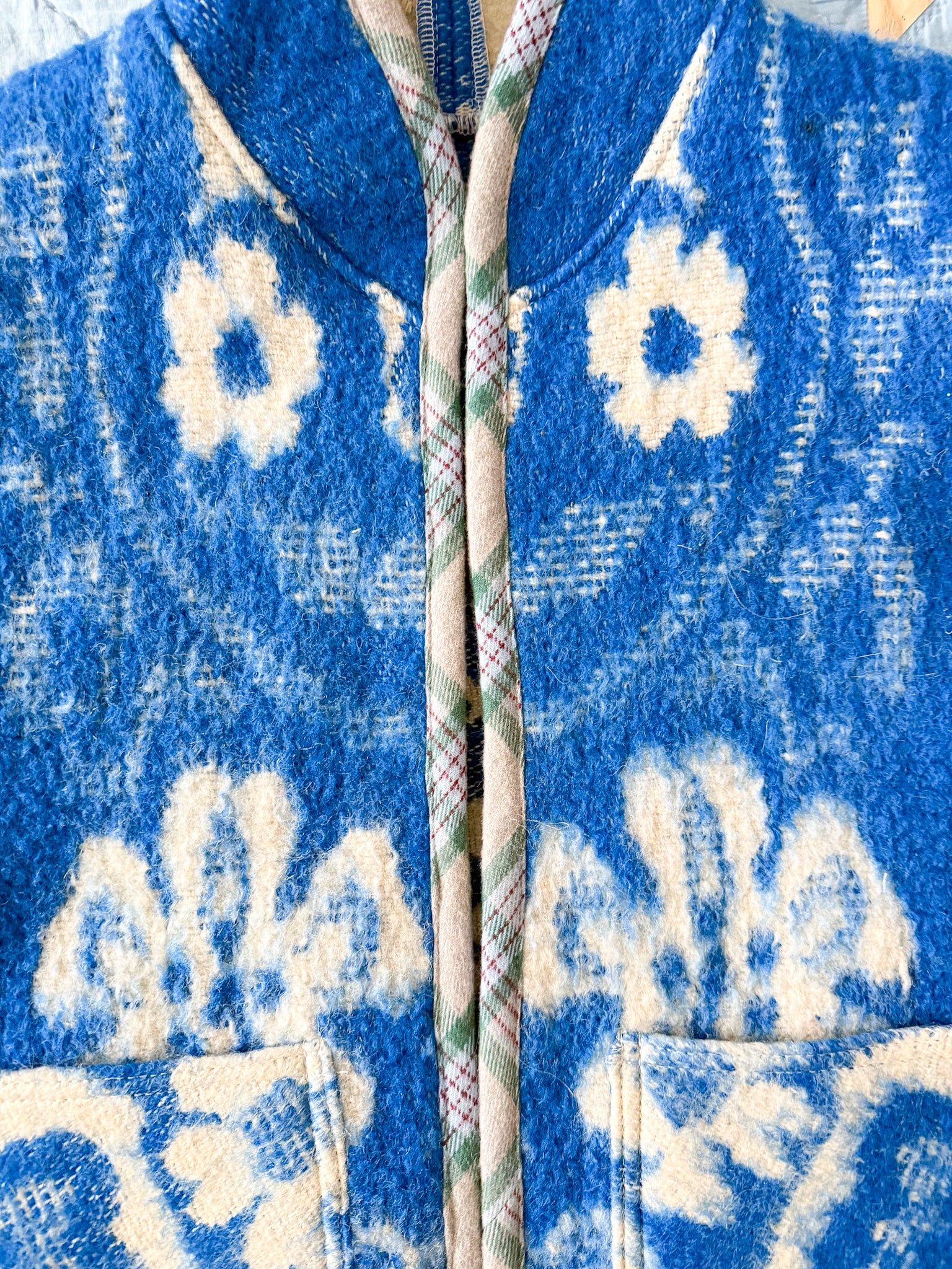 This vest features a vintage wool blanket sourced from a woman-owned business in Ukraine, with bound edges and fully-lined front patch pockets.