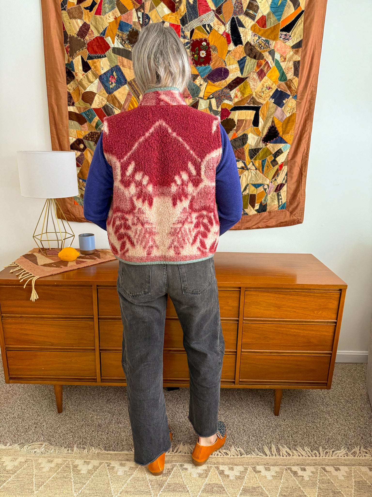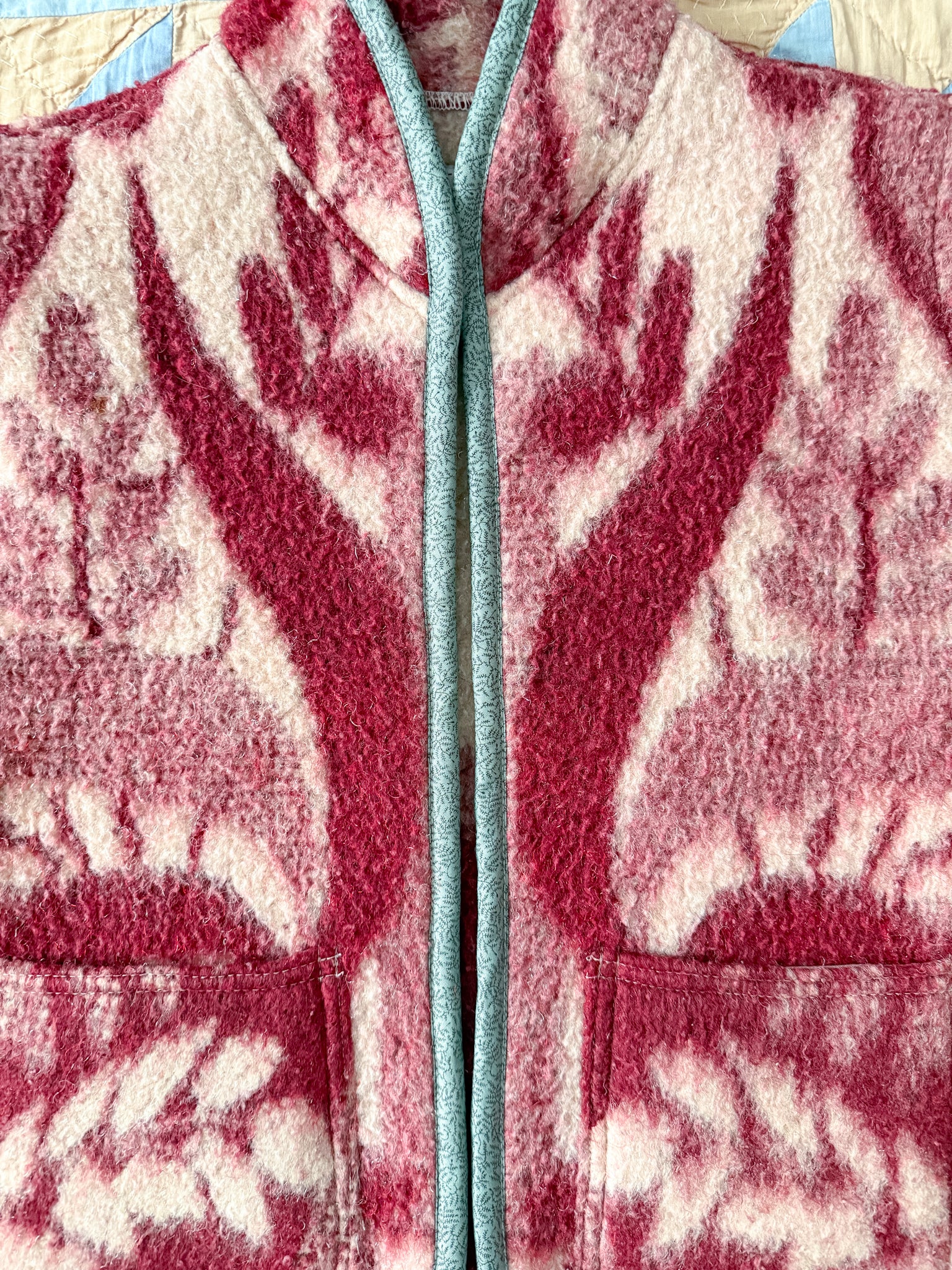 This vest features a vintage wool blanket sourced from a woman-owned business in Ukraine, with bound edges and fully-lined patch front pockets