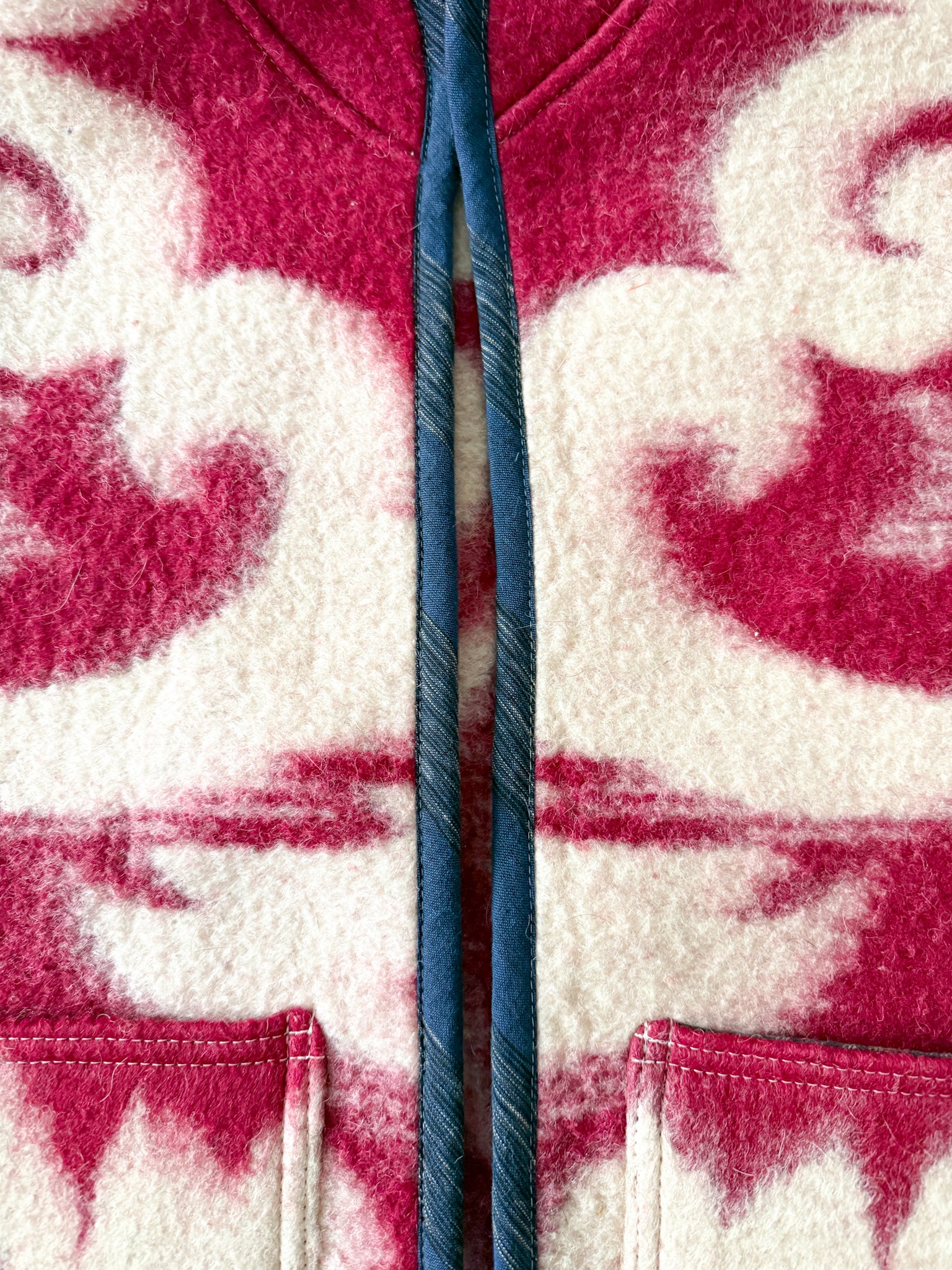 This vest features a vintage wool blanket sourced from a woman-owned business in Ukraine, with bound edges and fully-lined patch front pockets