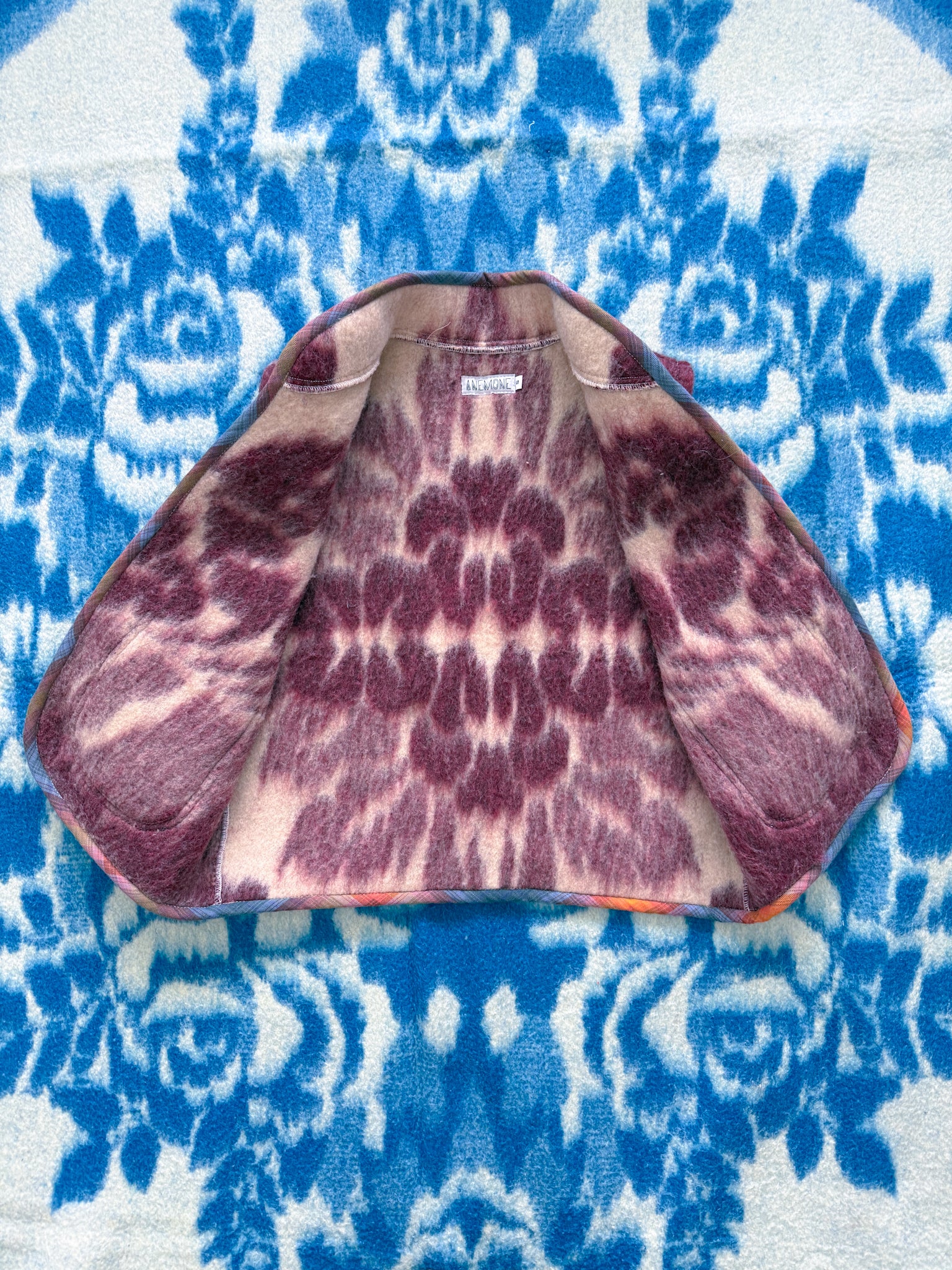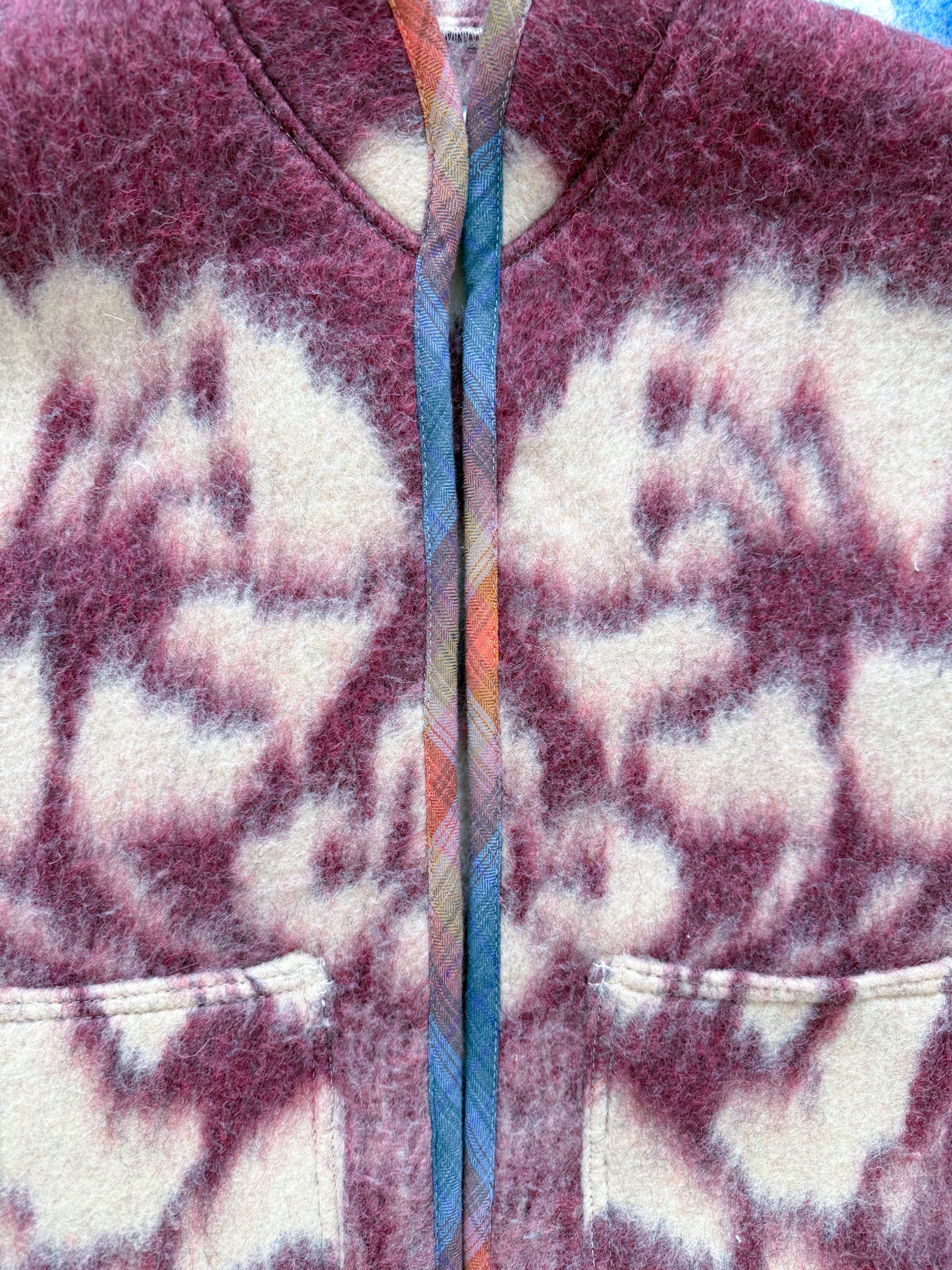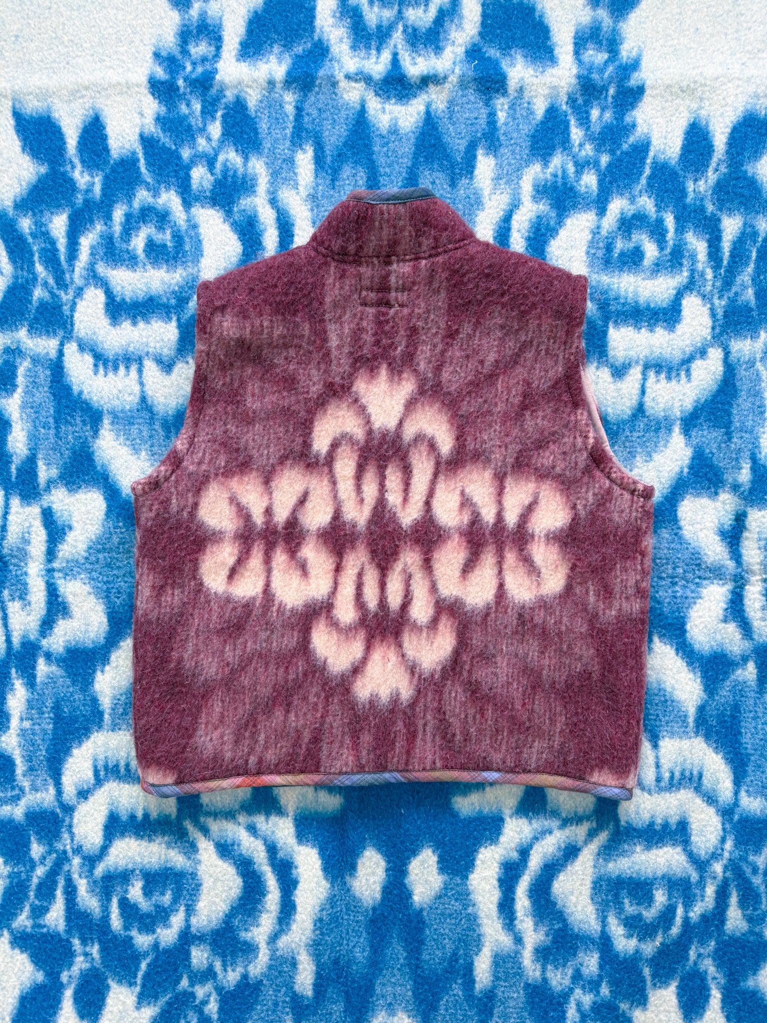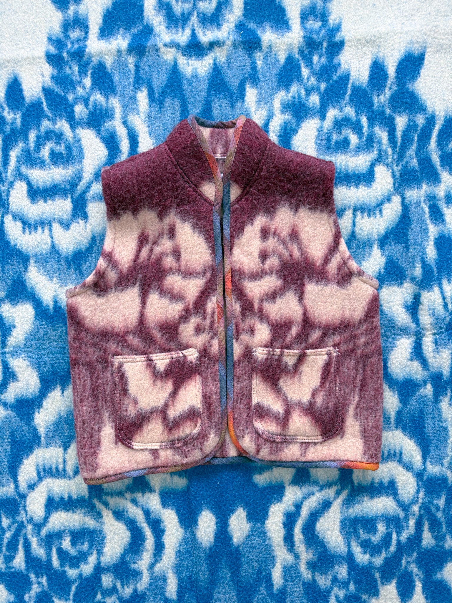 This vest features a vintage wool blanket sourced from a woman-owned business in Ukraine, with bound edges and fully-lined patch front pockets