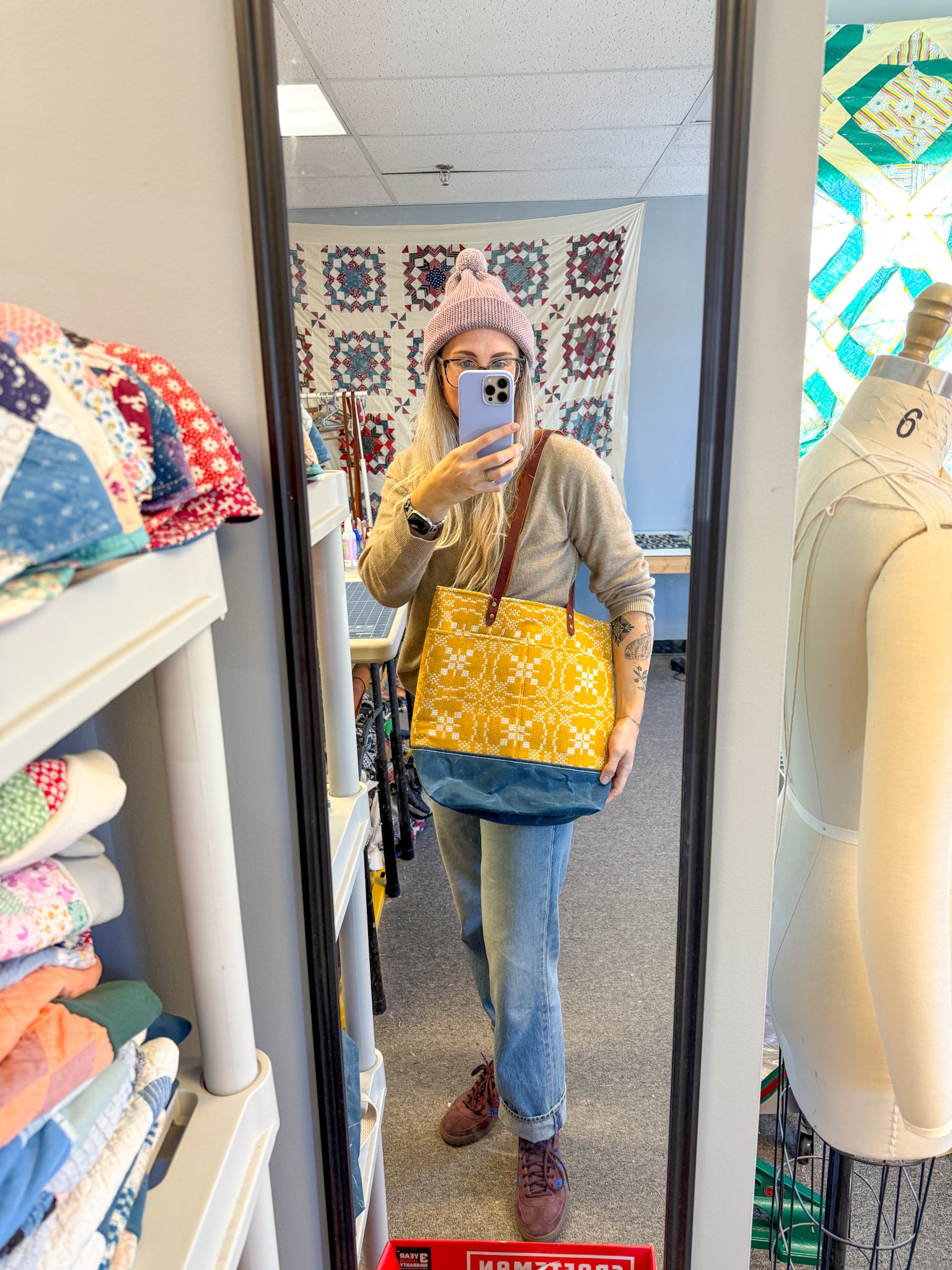 The tote bag is the answer for work, life, the beach, picnics, commuting, school, and snacks galore! This bag features an antique woven coverlet upper panel complete with two fully lined outer pockets, a waxed canvas bottom panel for durability that will age beautifully over time, and leather straps. The inside is fully lined in 100% cotton ticking stripe fabric and features an inside pocket measuring approximately 9" wide by 6" deep.