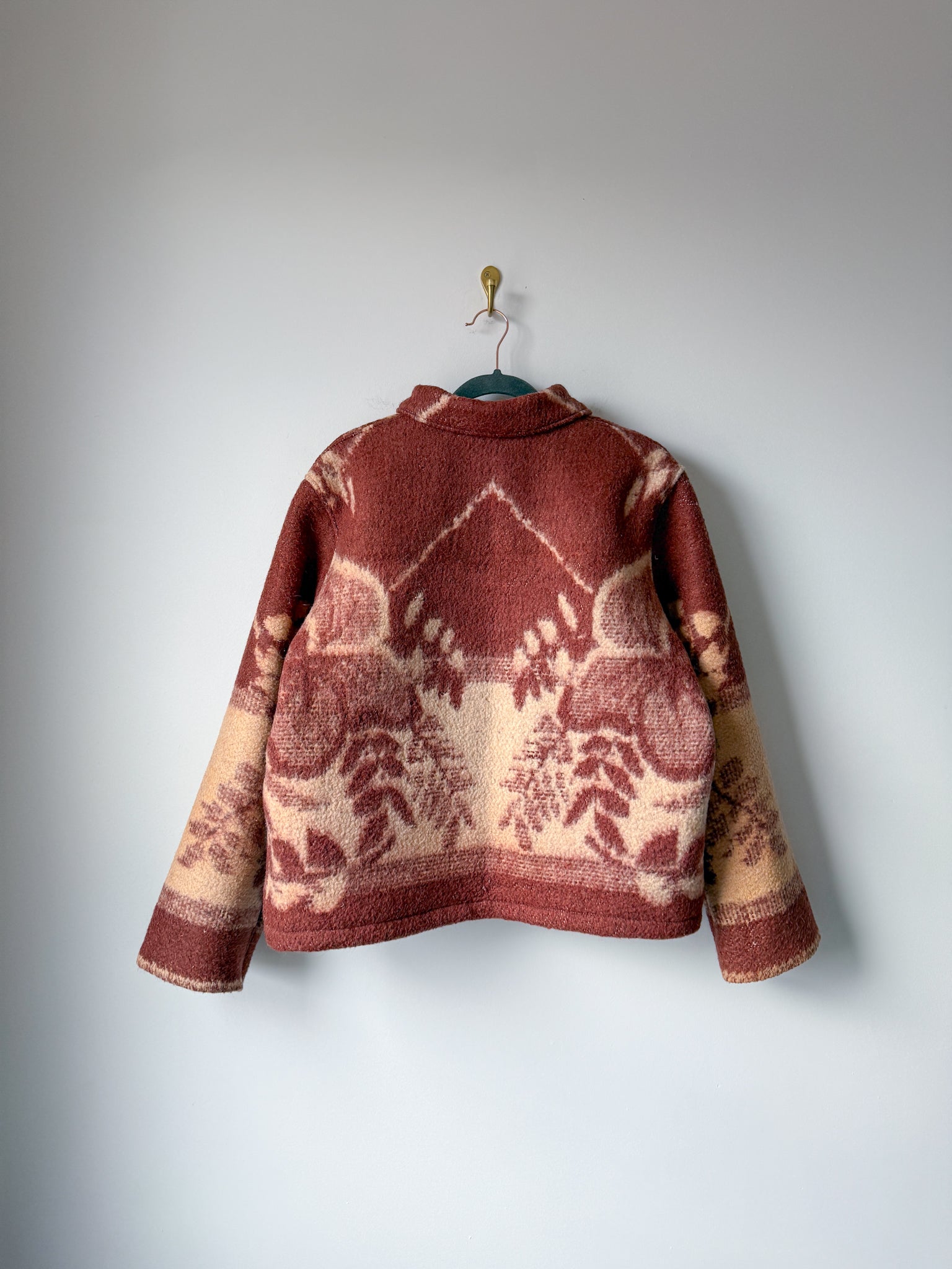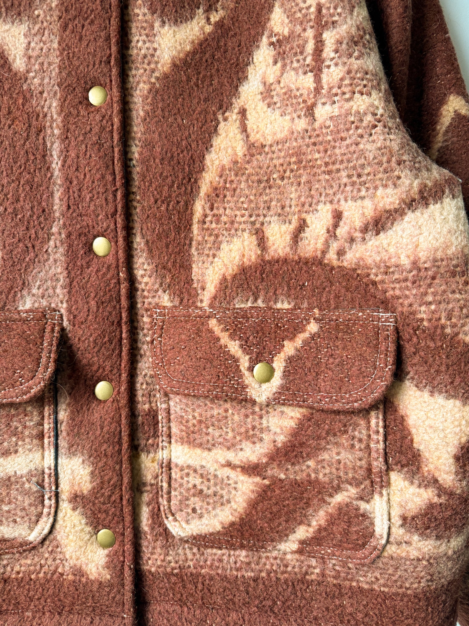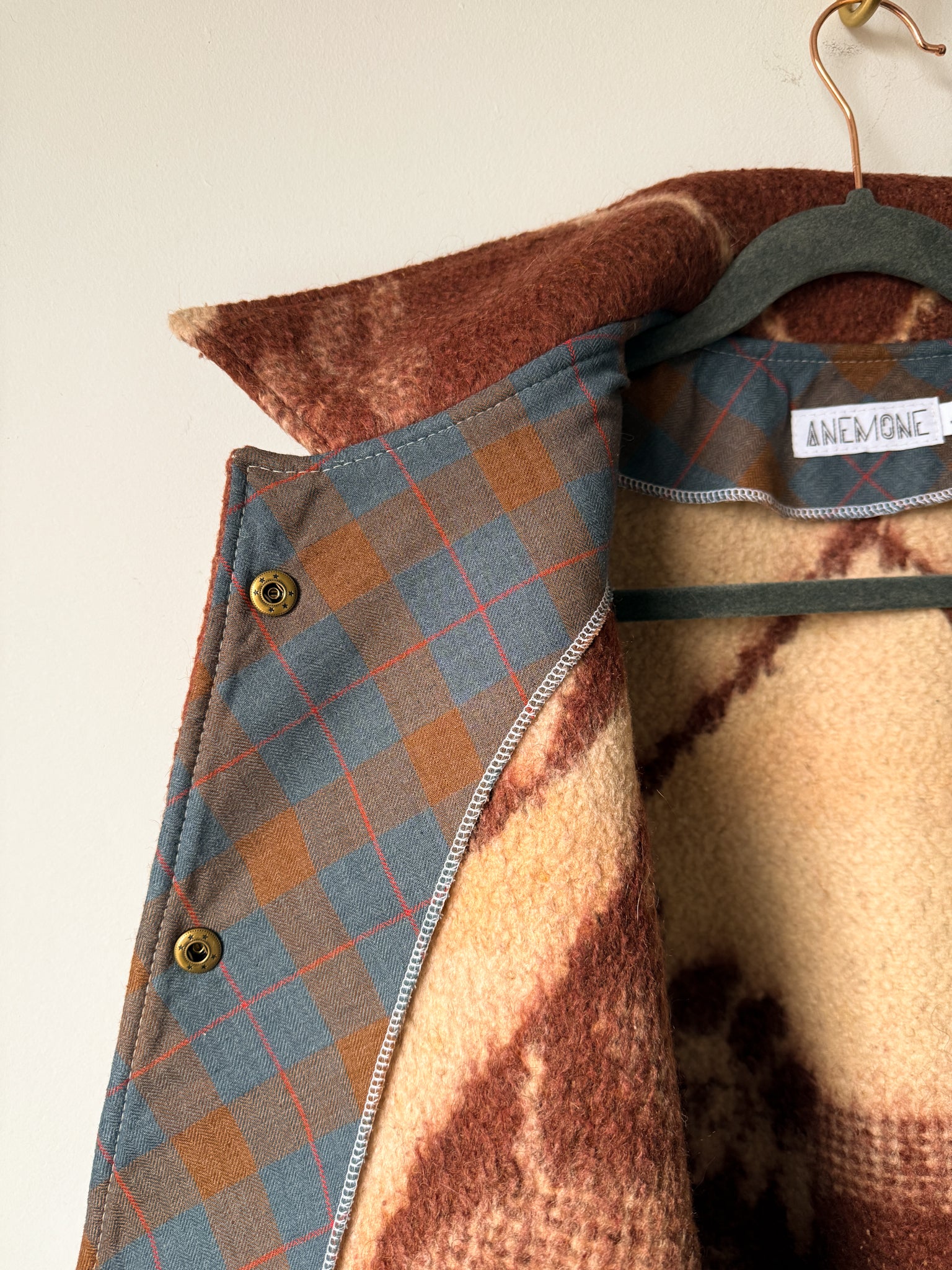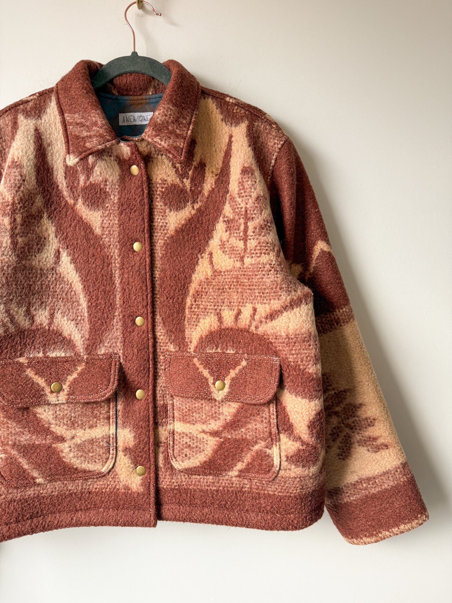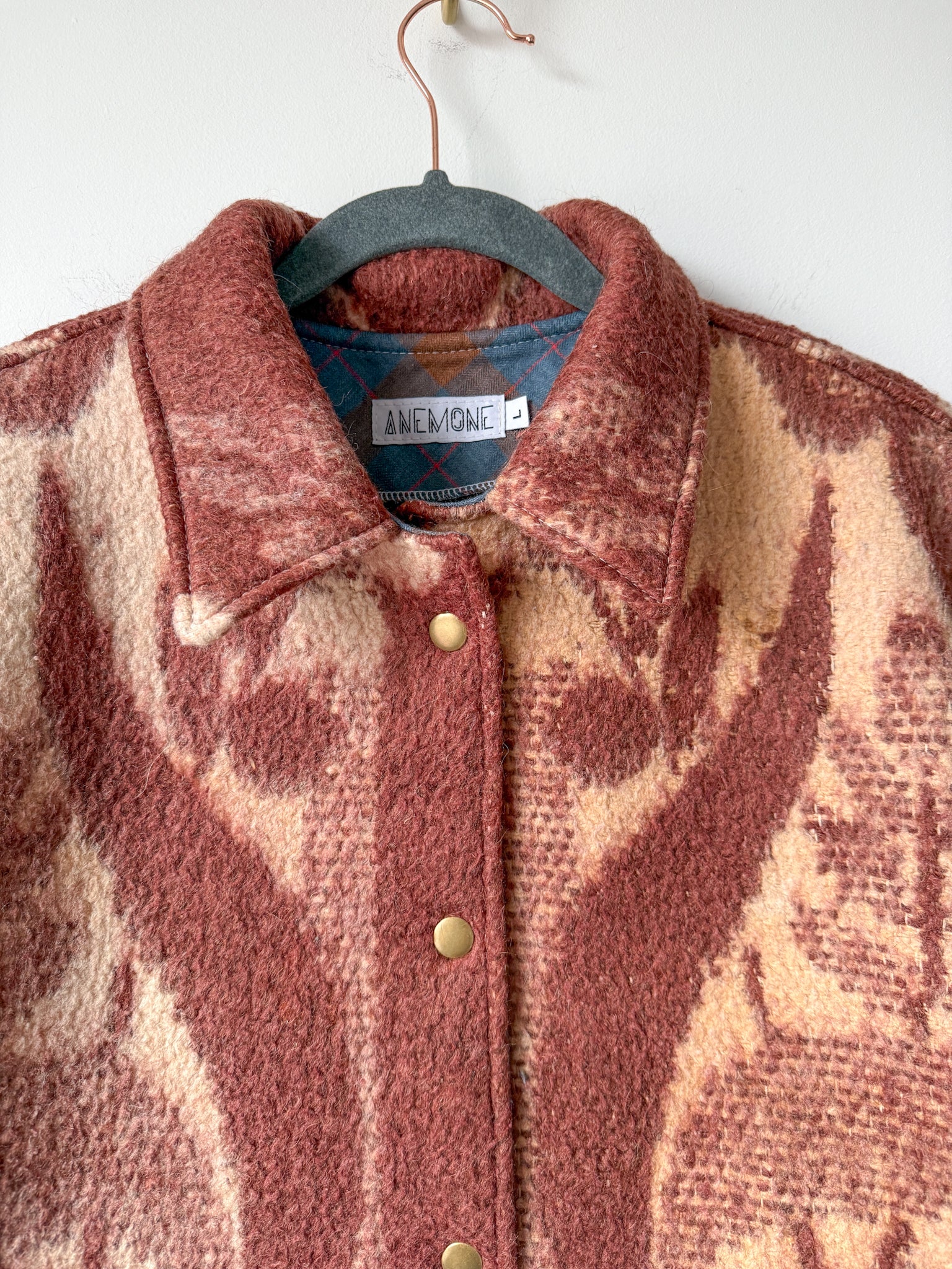 This vintage Ukrainian blanket (purchased from a woman-owned business in Ukraine!) has been reworked into a Field Jacket, which features a slight drop shoulder and tapered sleeve, with a straight silhouette, complete with lined snap front patch pockets and antique brass snaps.