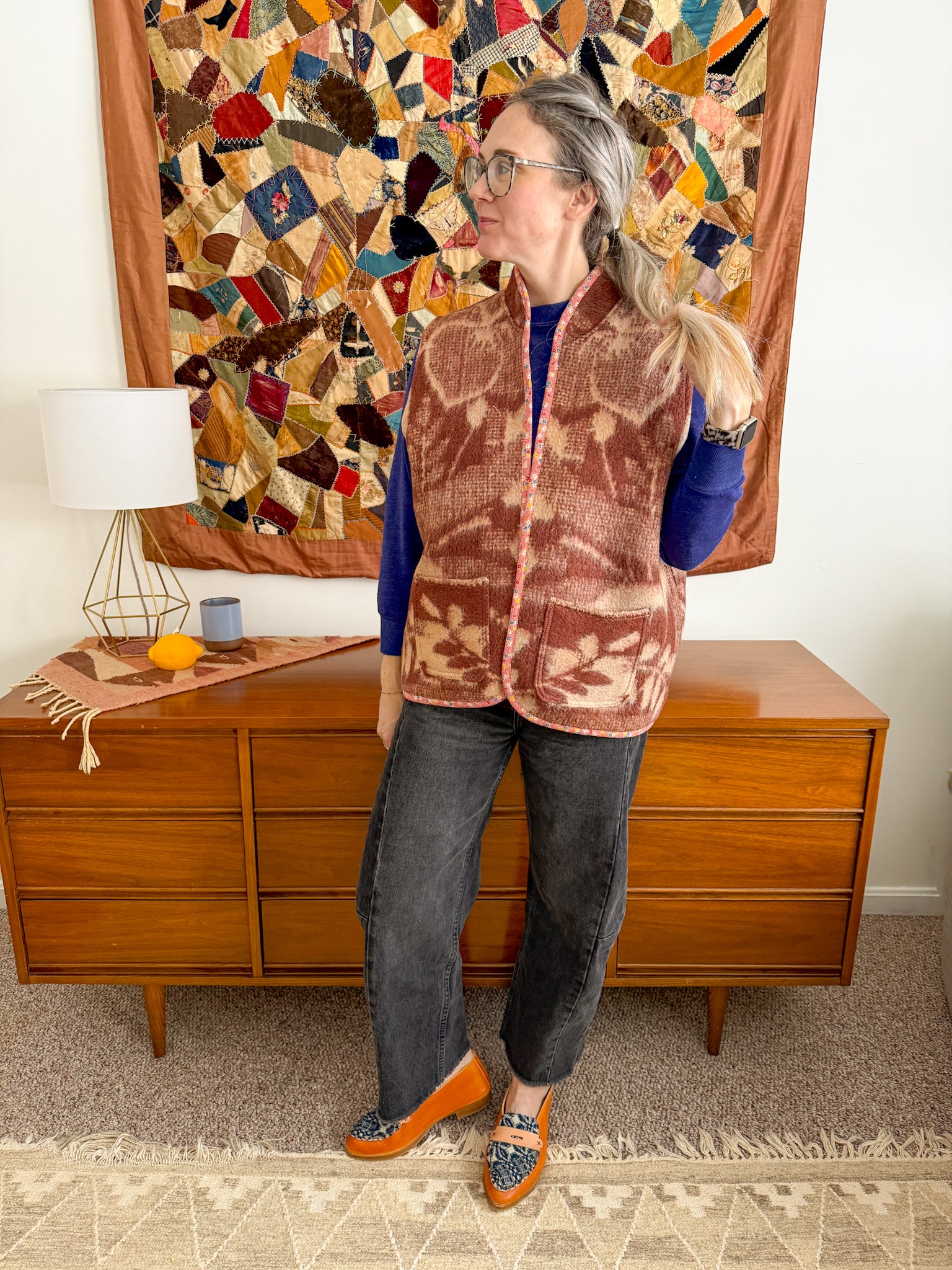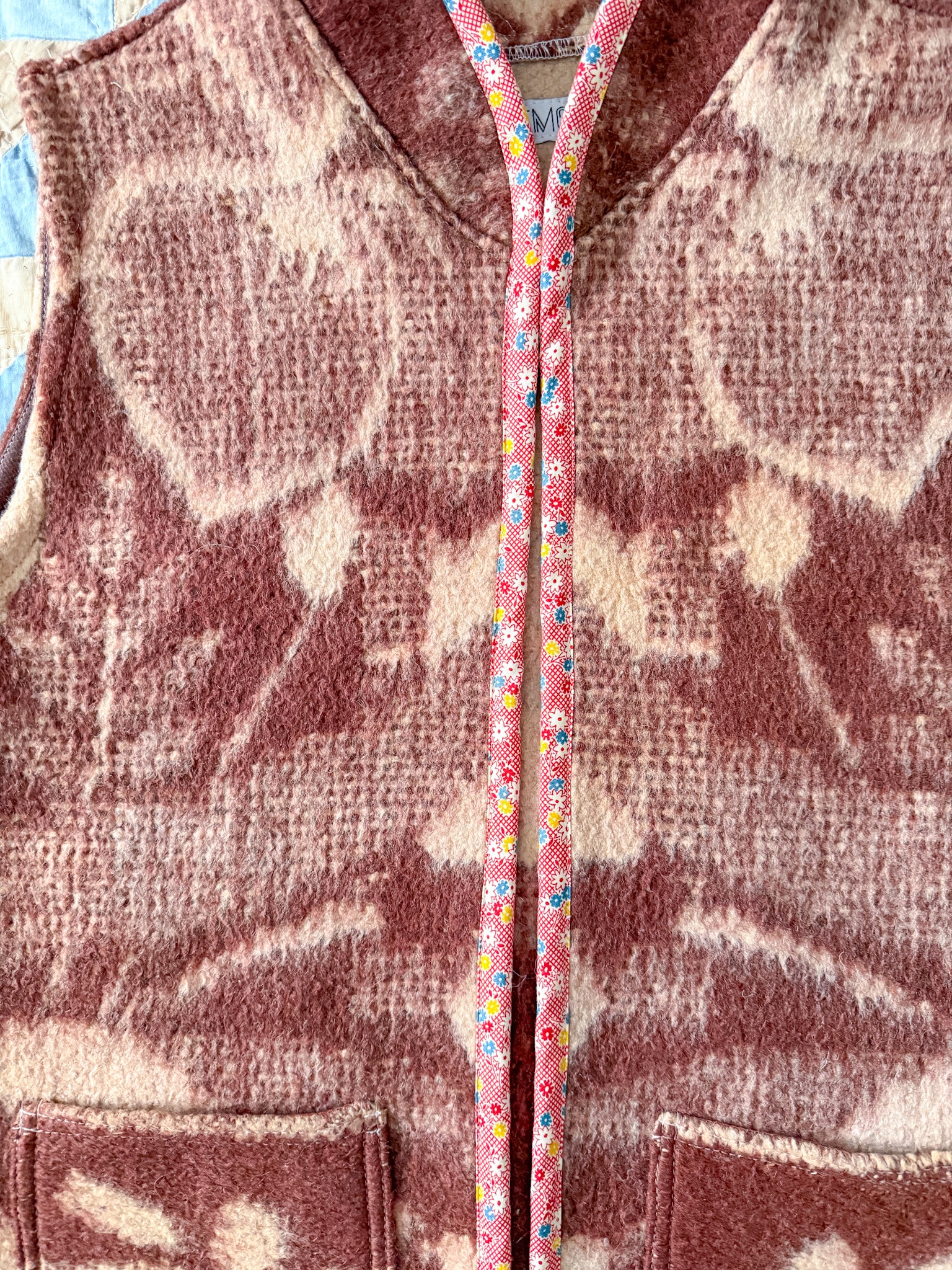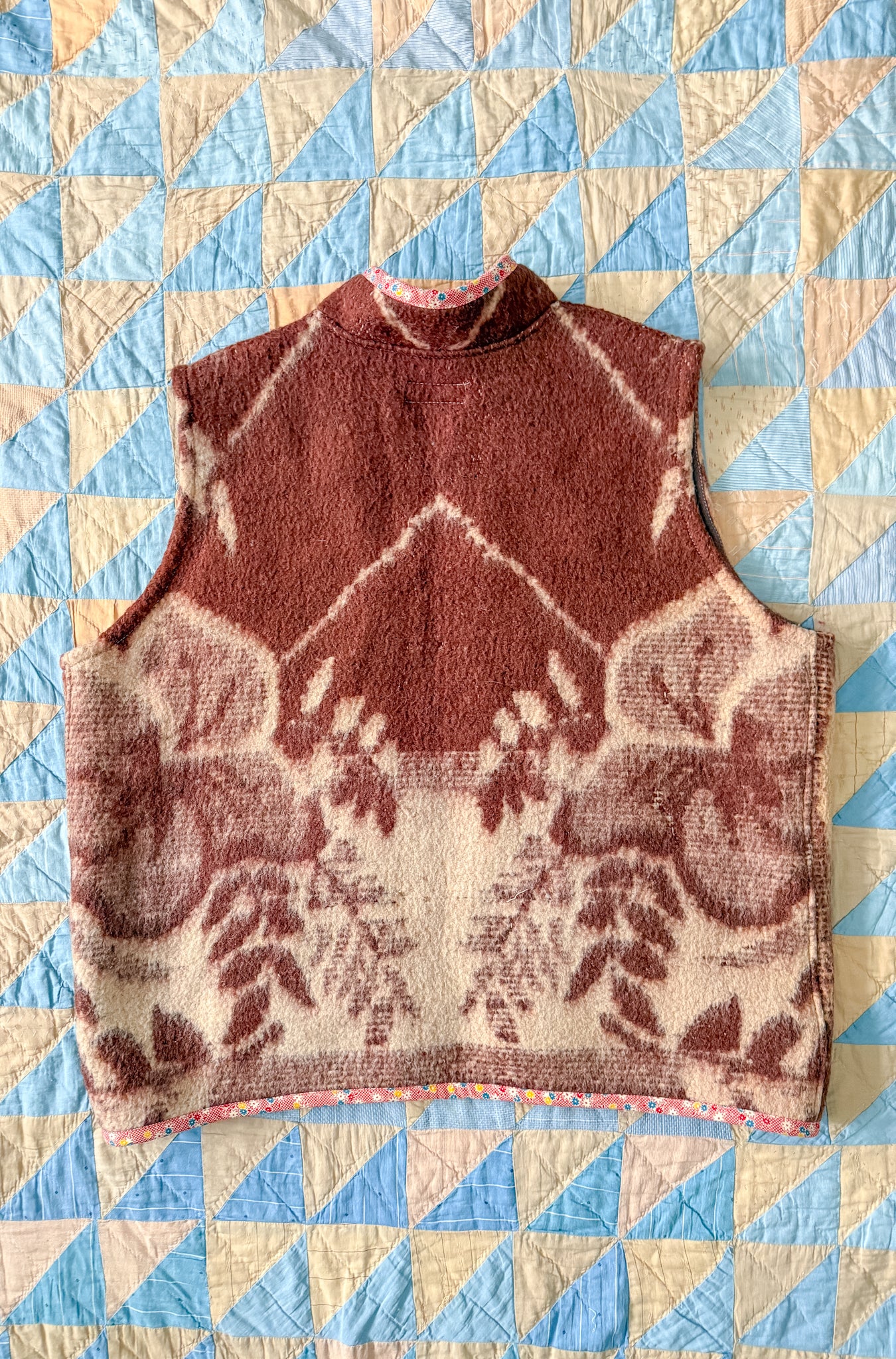 This vest features a vintage wool blanket sourced from a woman-owned business in Ukraine, with bound edges and fully-lined front patch pockets.