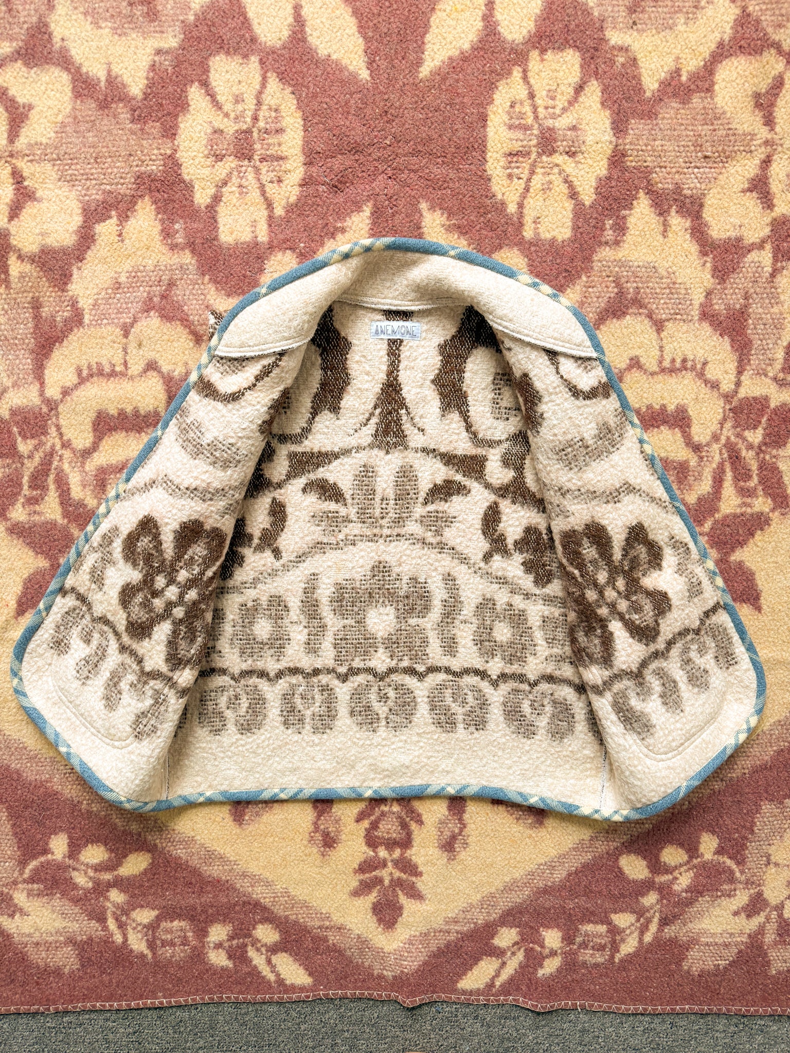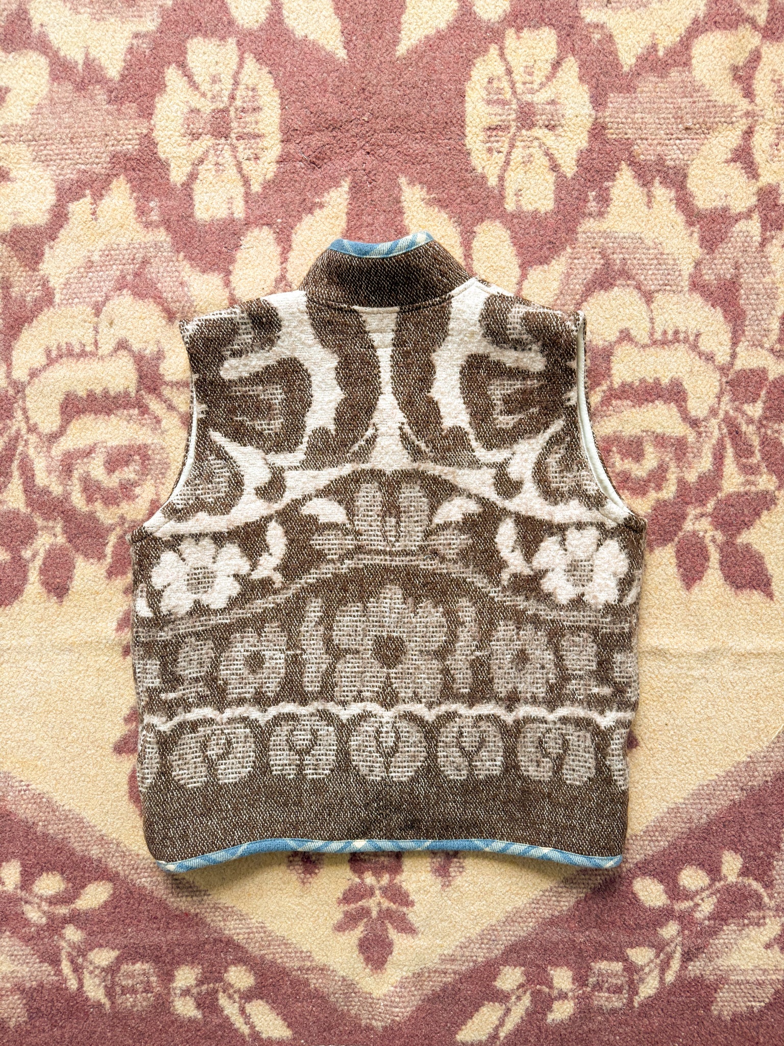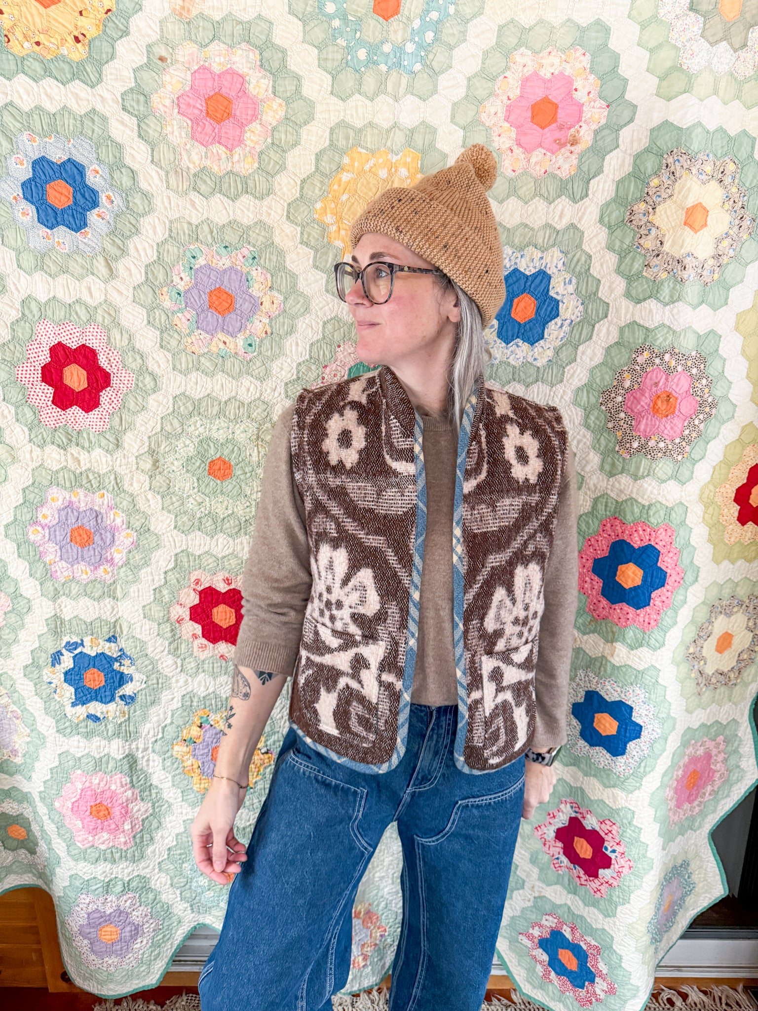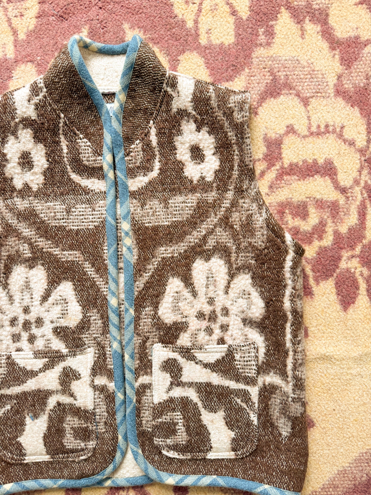 This vest features a vintage wool blanket sourced from a woman-owned business in Ukraine, with bound edges and fully-lined front patch pockets.