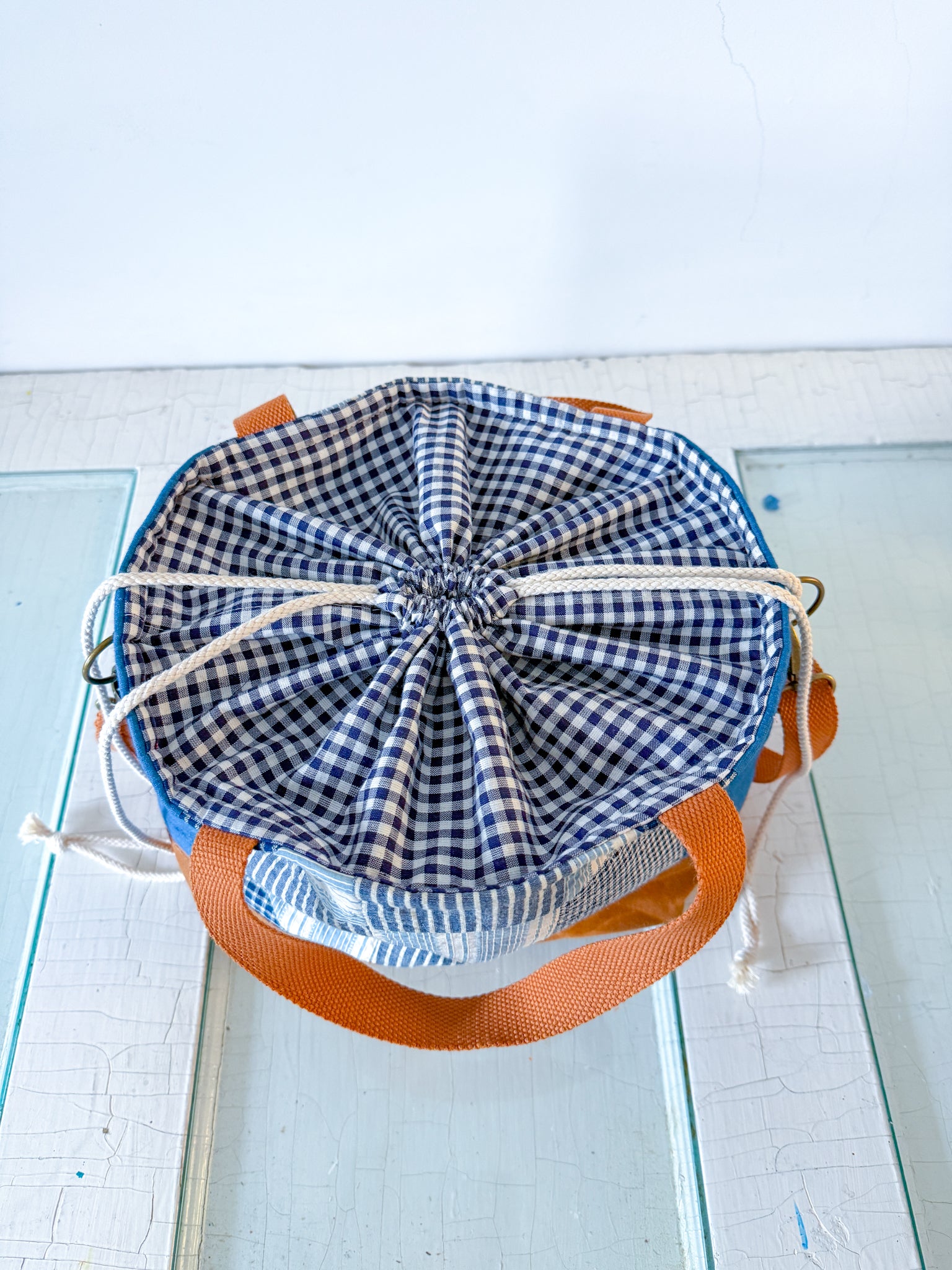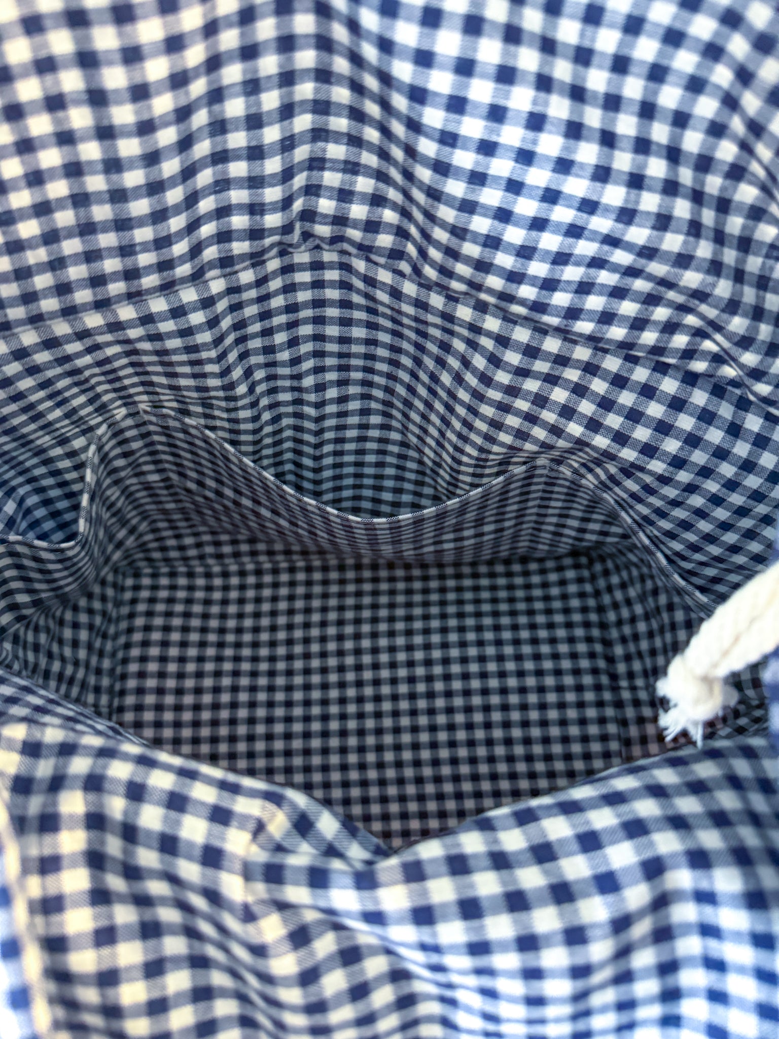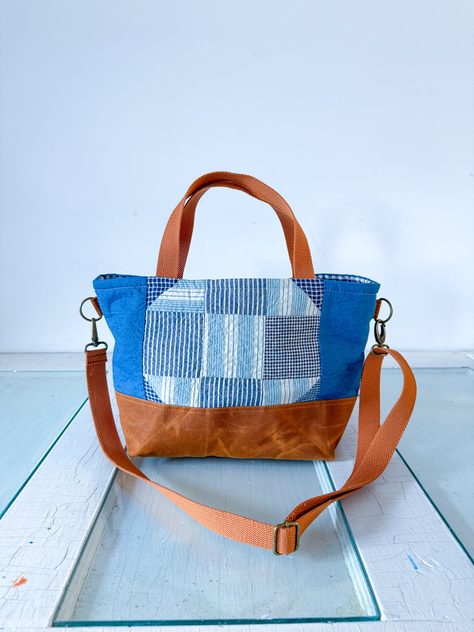 Introducing: The Project Bag with a detachable strap to wear crossbody, over the shoulder, or you can remove it to carry by the handles - this was created with the intention of corralling all your crafting bits and bobs, but doubles as a catch-all for whatever you need to bring with you wherever you go. This bag features an antique upper panel, waxed canvas bottom for durability that will age beautifully over time, and a drawstring cinch top for containing everything inside. This comfortably holds a couple skeins of yarn and whatever work in progress you might have (I've been using mine to hold a sweater I'm knitting!). The inside is fully lined in a lavender and white petite gingham cotton fabric and features 3 inside pockets.