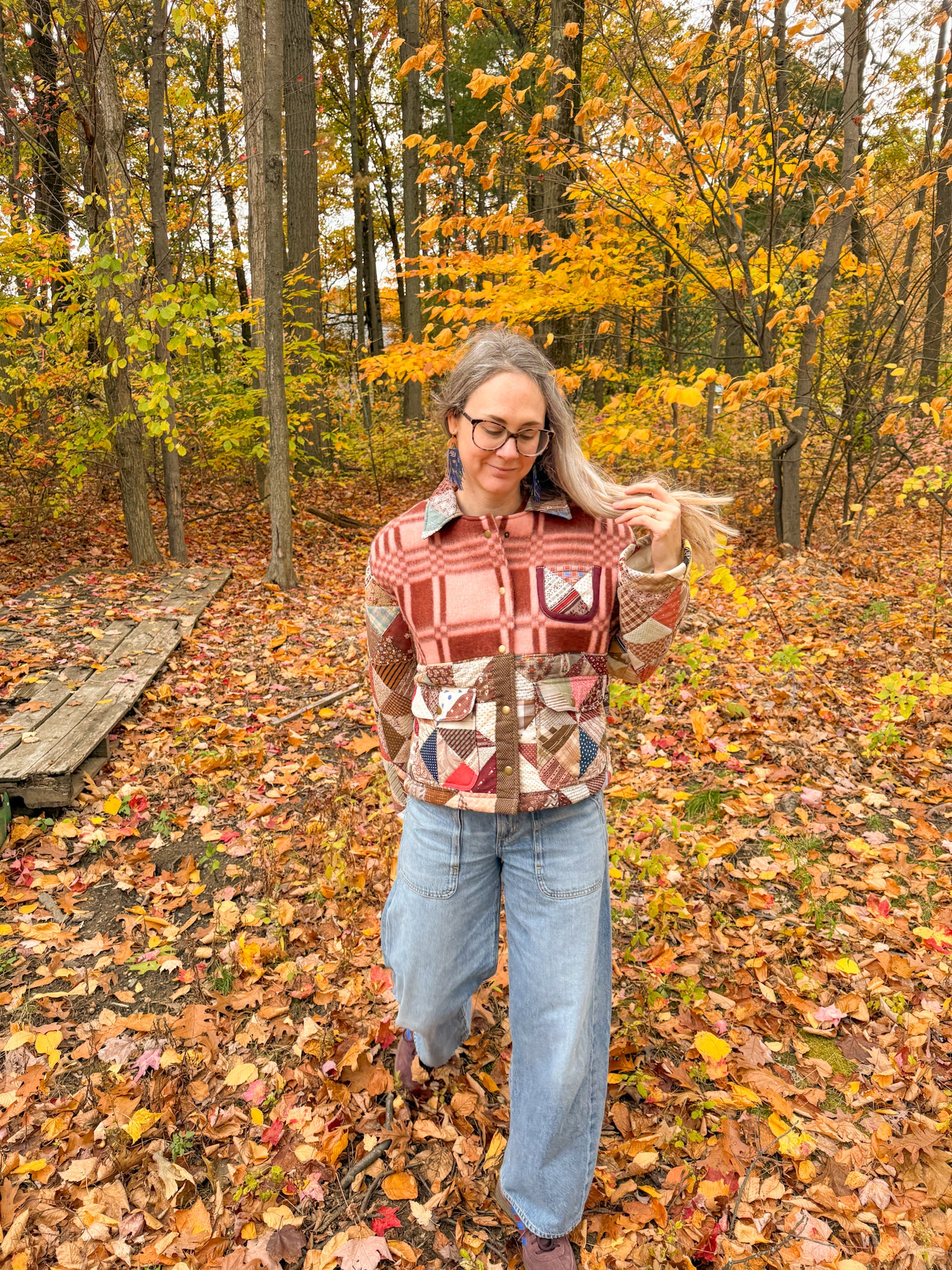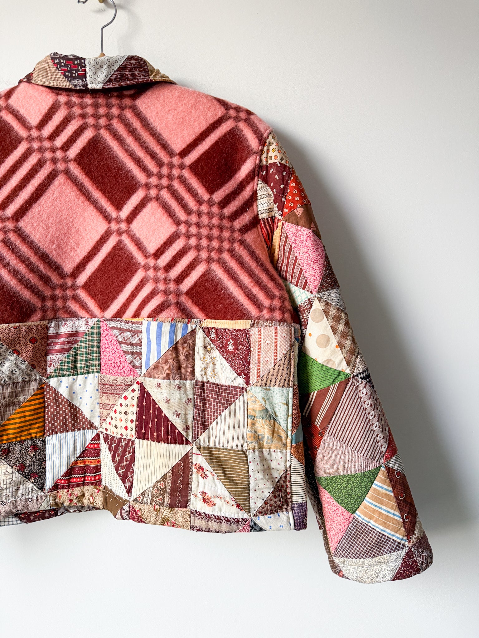 This special jacket has been a longtime coming! The upper panel of this colorblock jacket features a deadstock blanket purchsed from a woman-owned business in Ukraine, and the bottom portion from a vintage/antique pinwheel quilt in perfect autumnal hues that has been reworked into a Field Jacket, which features a slight drop shoulder and tapered sleeve, with a straight silhouette, complete with flap front patch pockets and antique brass snaps. The inner facings, back of the neck, under-collar, and pockets feature a solid burgundy linen fabric.