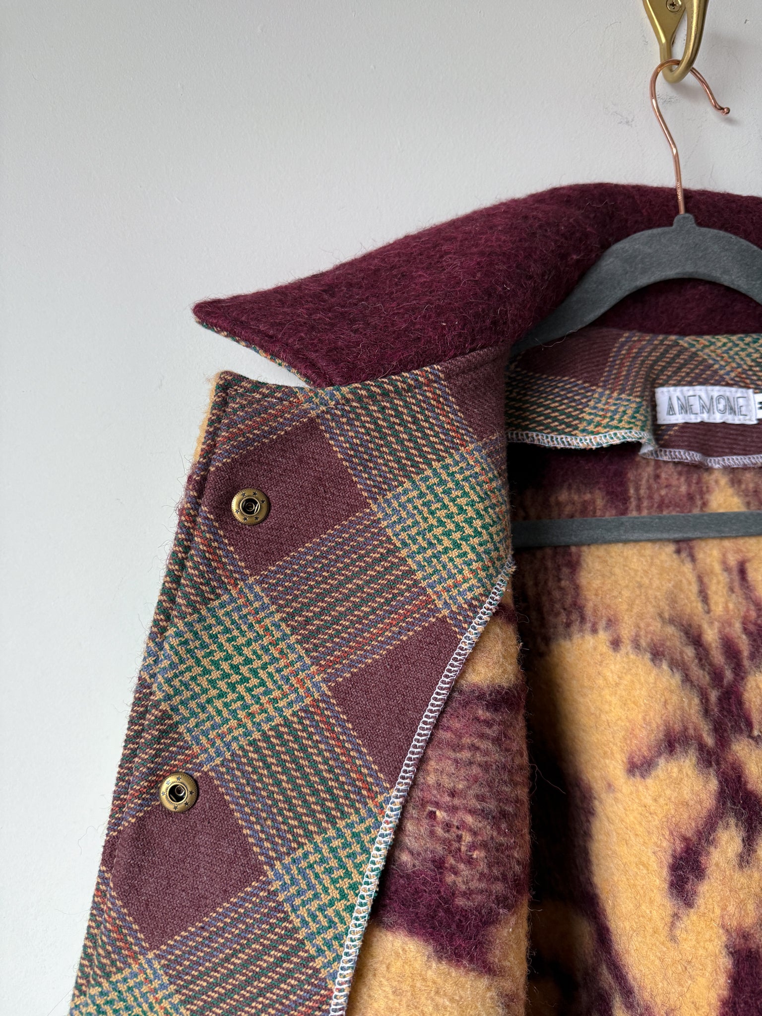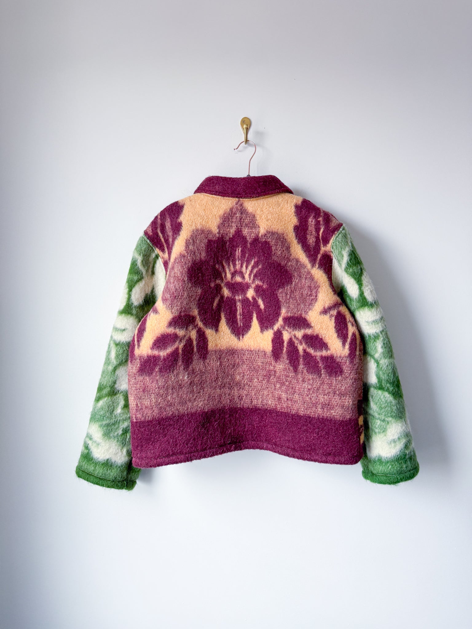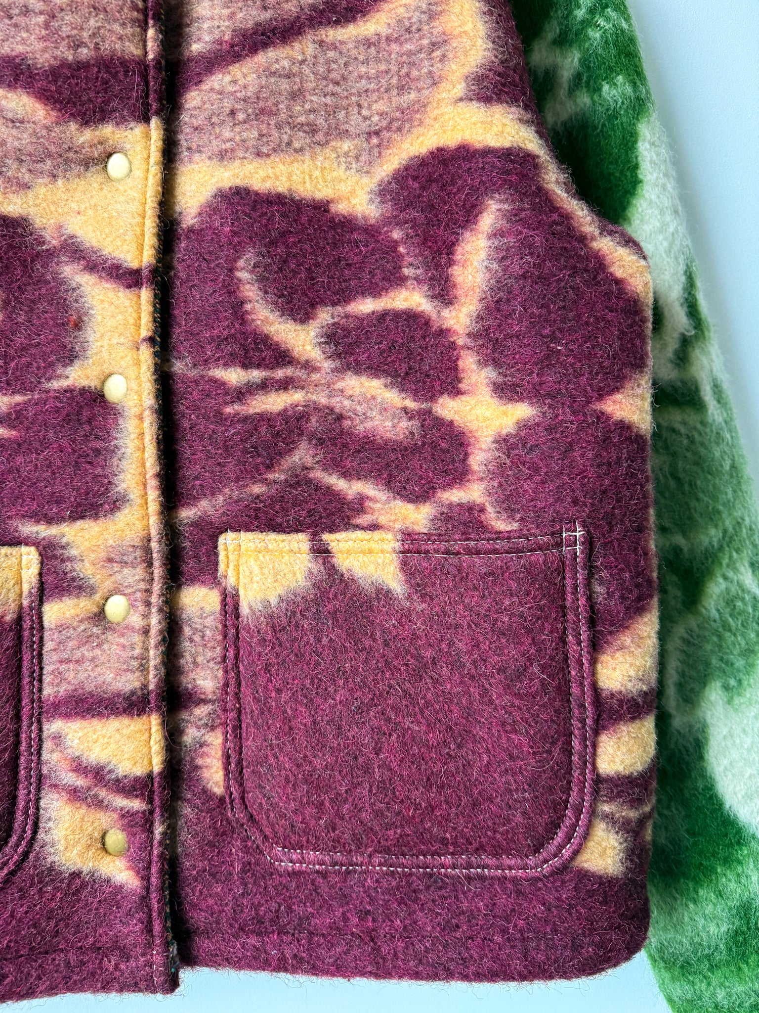 These vintage Ukrainian blankets (purchased from a woman-owned business in Ukraine!) hAve been reworked into a Field Jacket, which features a slight drop shoulder and tapered sleeve, with a straight silhouette, complete with lined front patch pockets and antique brass snaps.