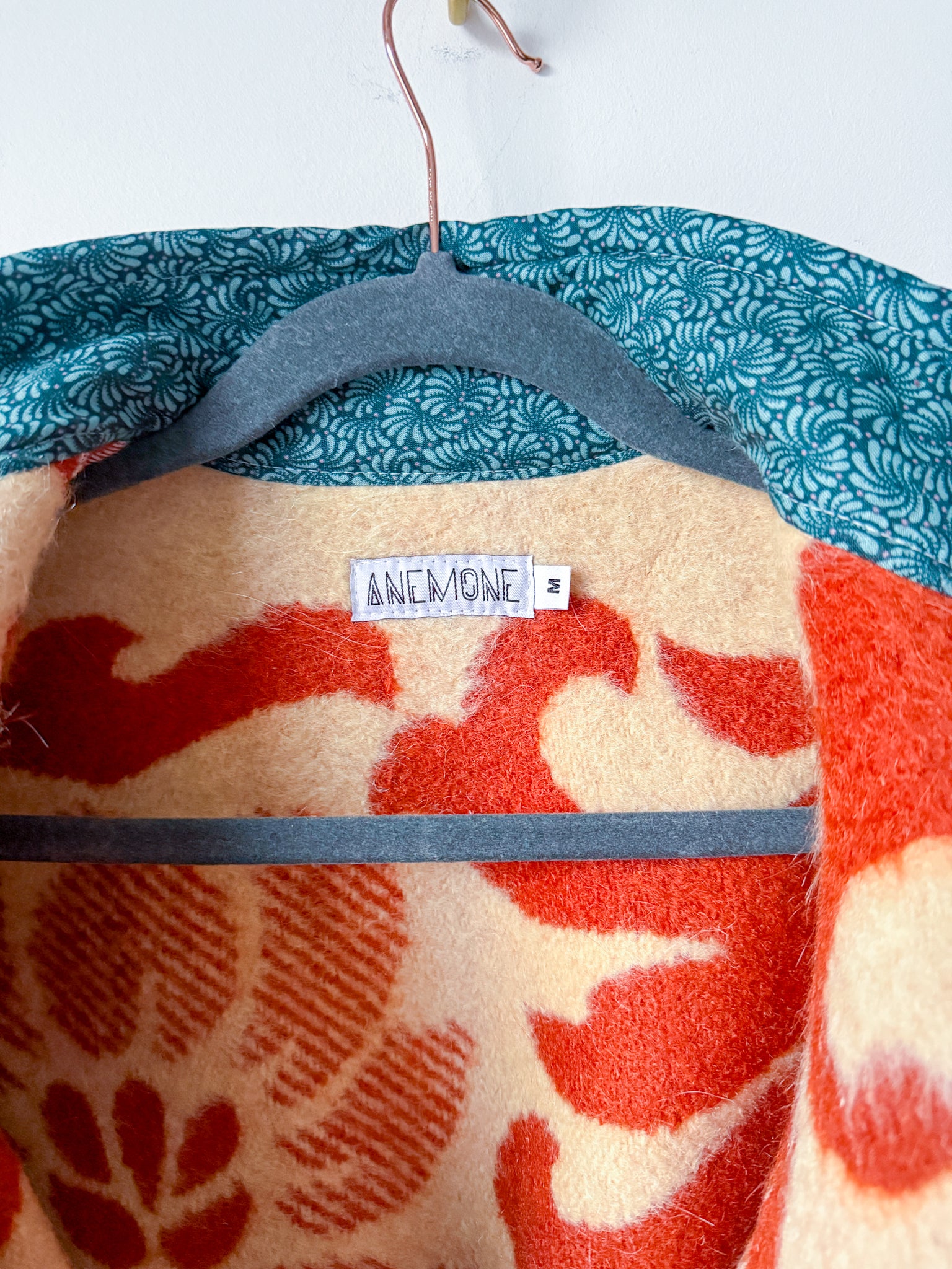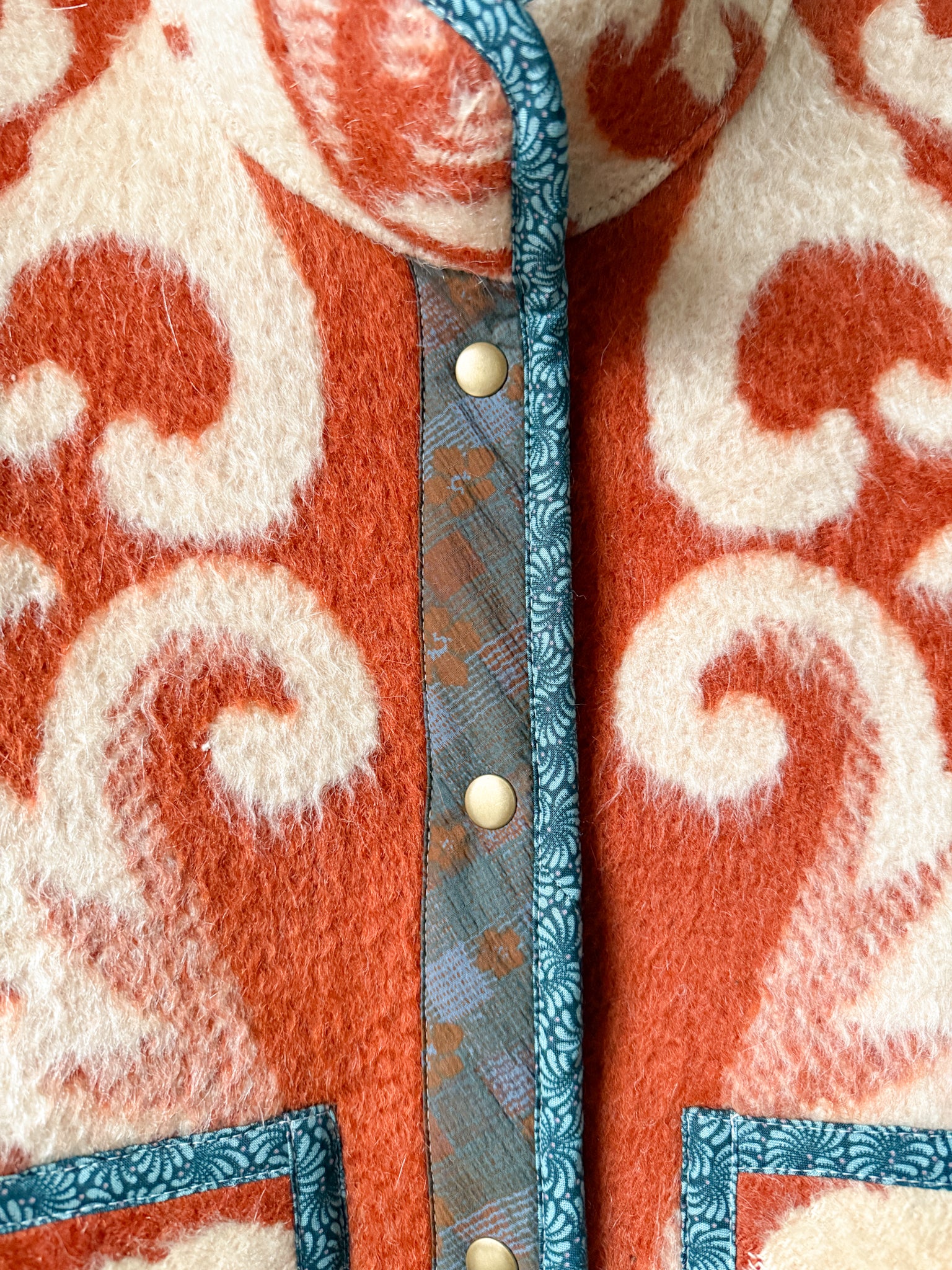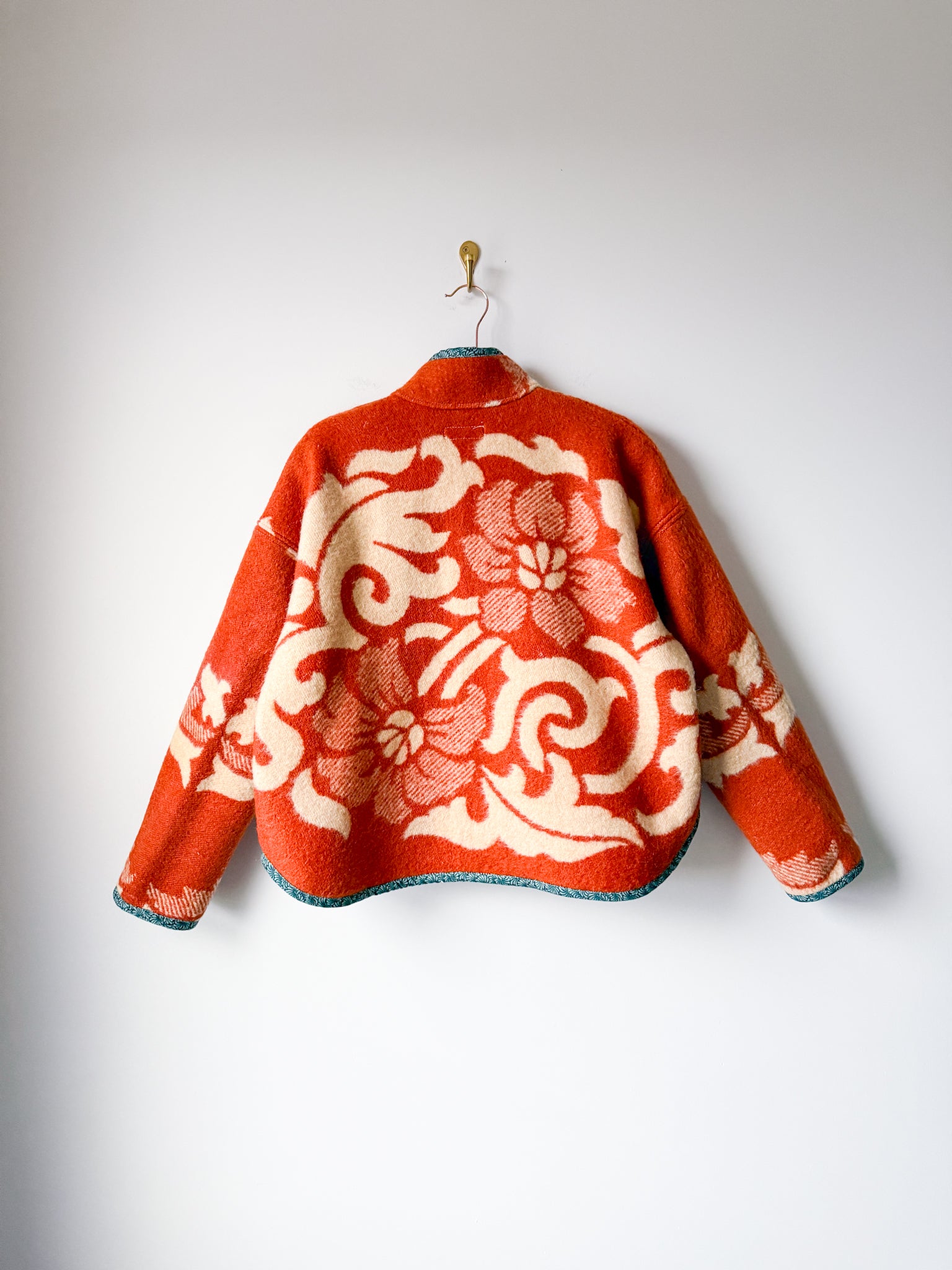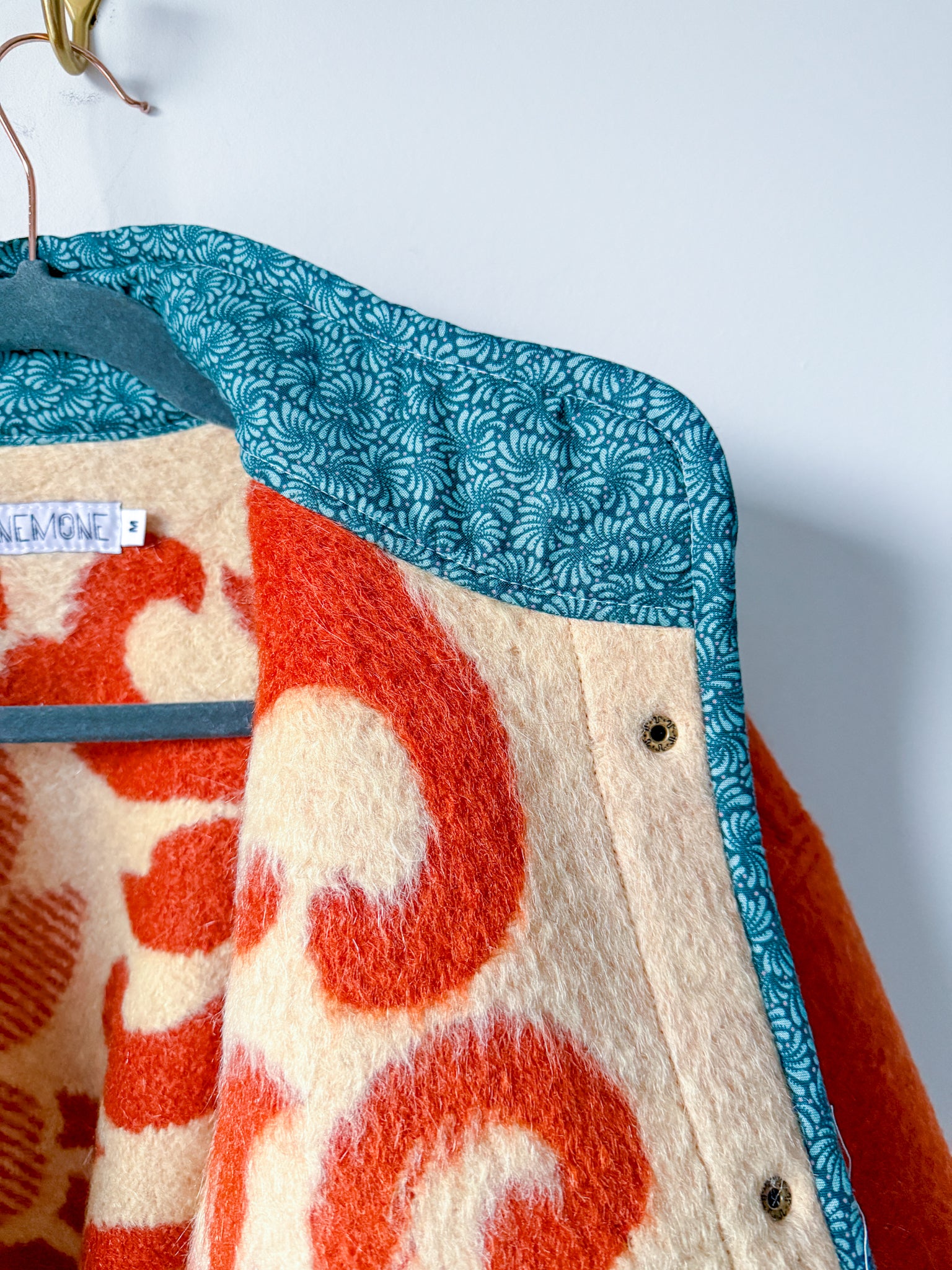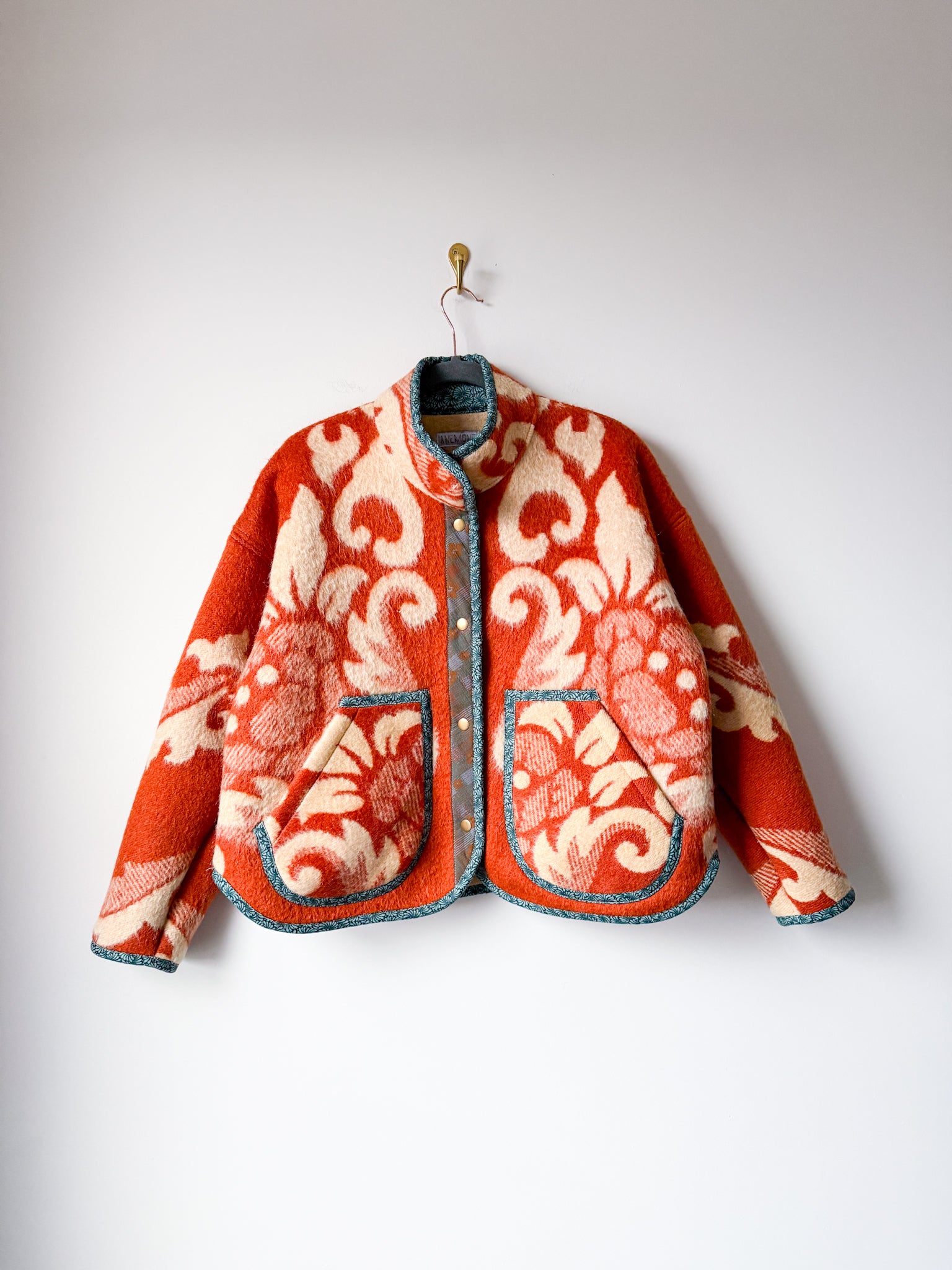 This Flora Jacket is made from a vintage blanket sourced from a woman-owned business in Ukraine. This style jacket features a straight side hem, bound edges, plackets and inner collar, antique brass snaps and rounded patch front pockets. This is the Flora Jacket pattern by Brightside Pattern Company that I pattern tested for them, and they were kind enough to grant me permission to make finished coats available to you! The fit is oversized through the body with slimmer arms, and a stand up collar - a truly amazing fit!