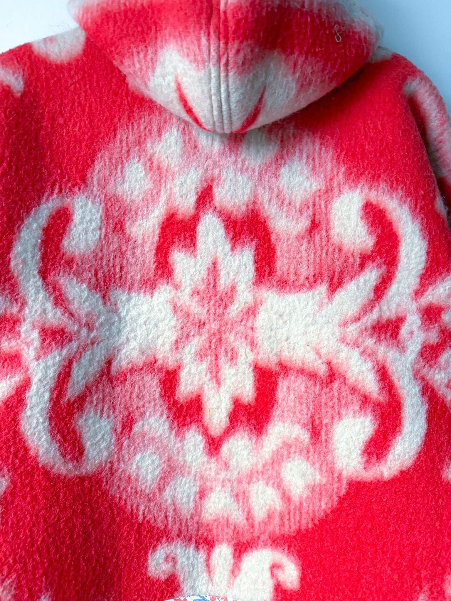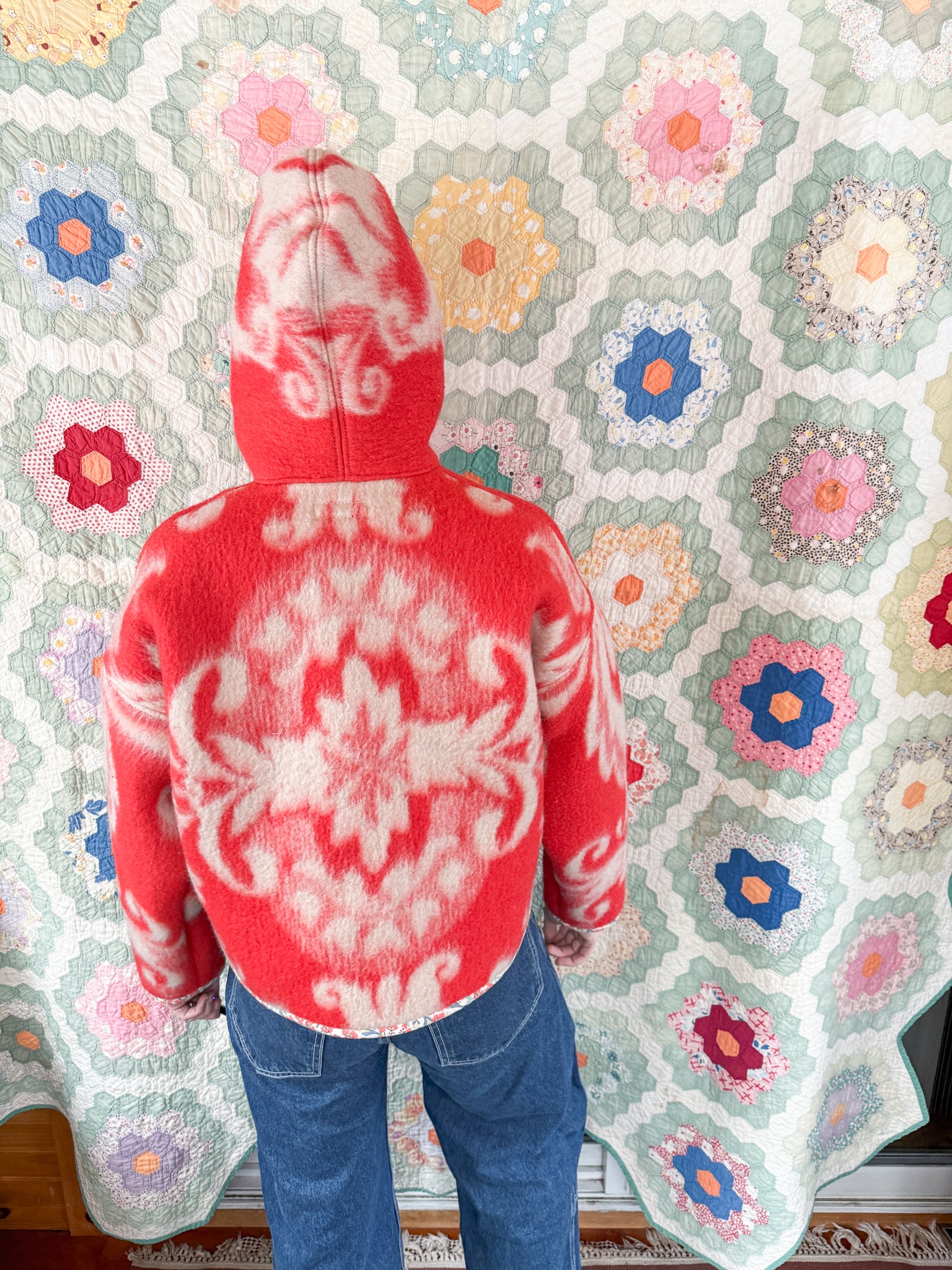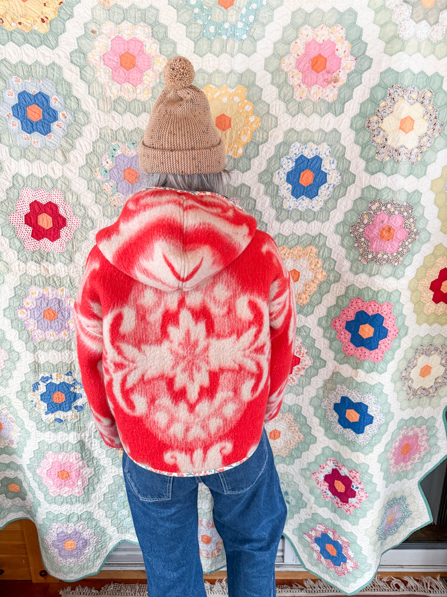 This Flora Jacket is made from a vintage blanket sourced from a woman-owned business in Ukraine. The front plackets are constructed from very special plaid wool coating fabric that I found at a local estate sale here in Vermont. The hood lining, pockets, and outer edges are bound in a deep burgundy linen/cotton blend.
