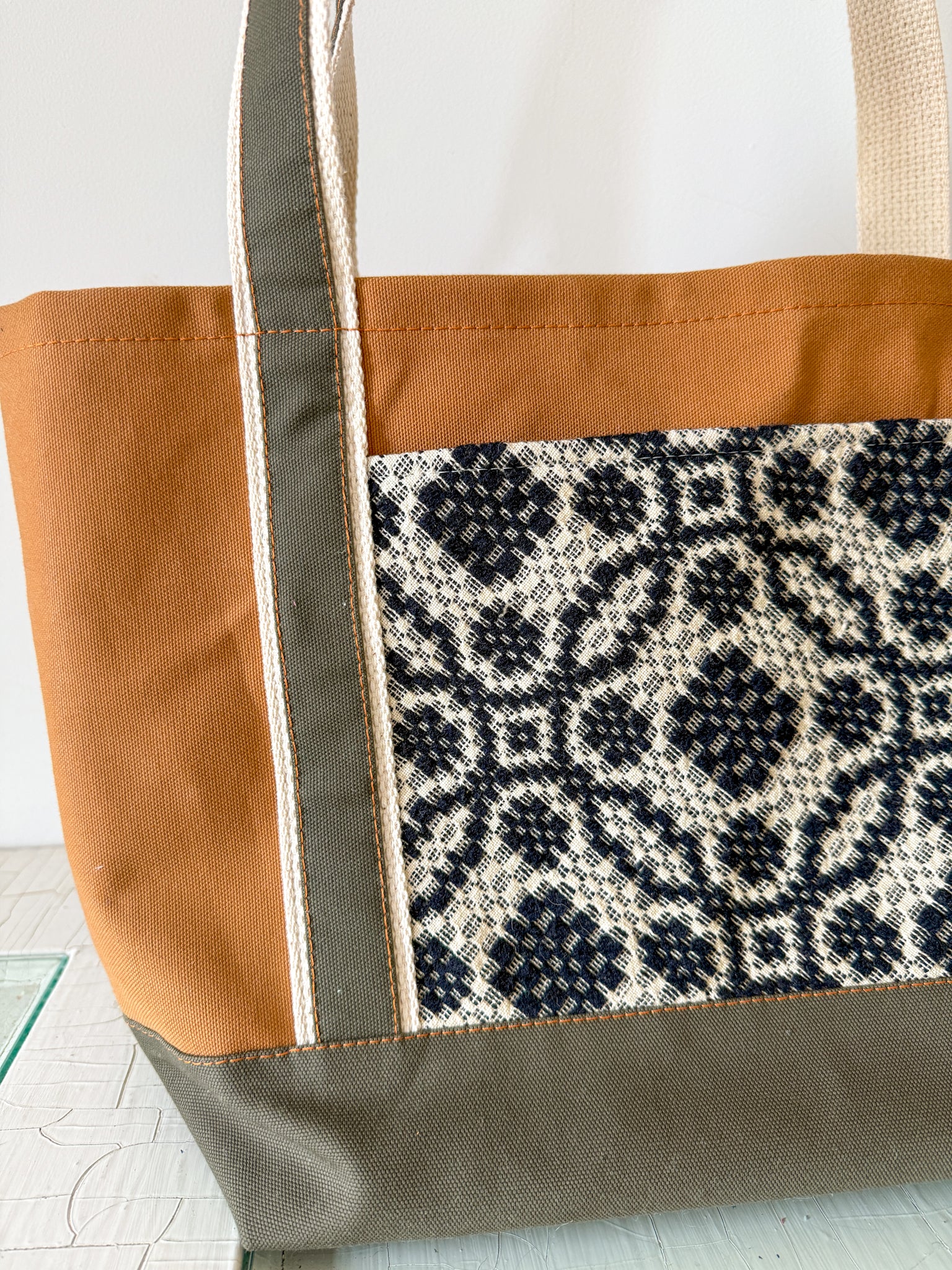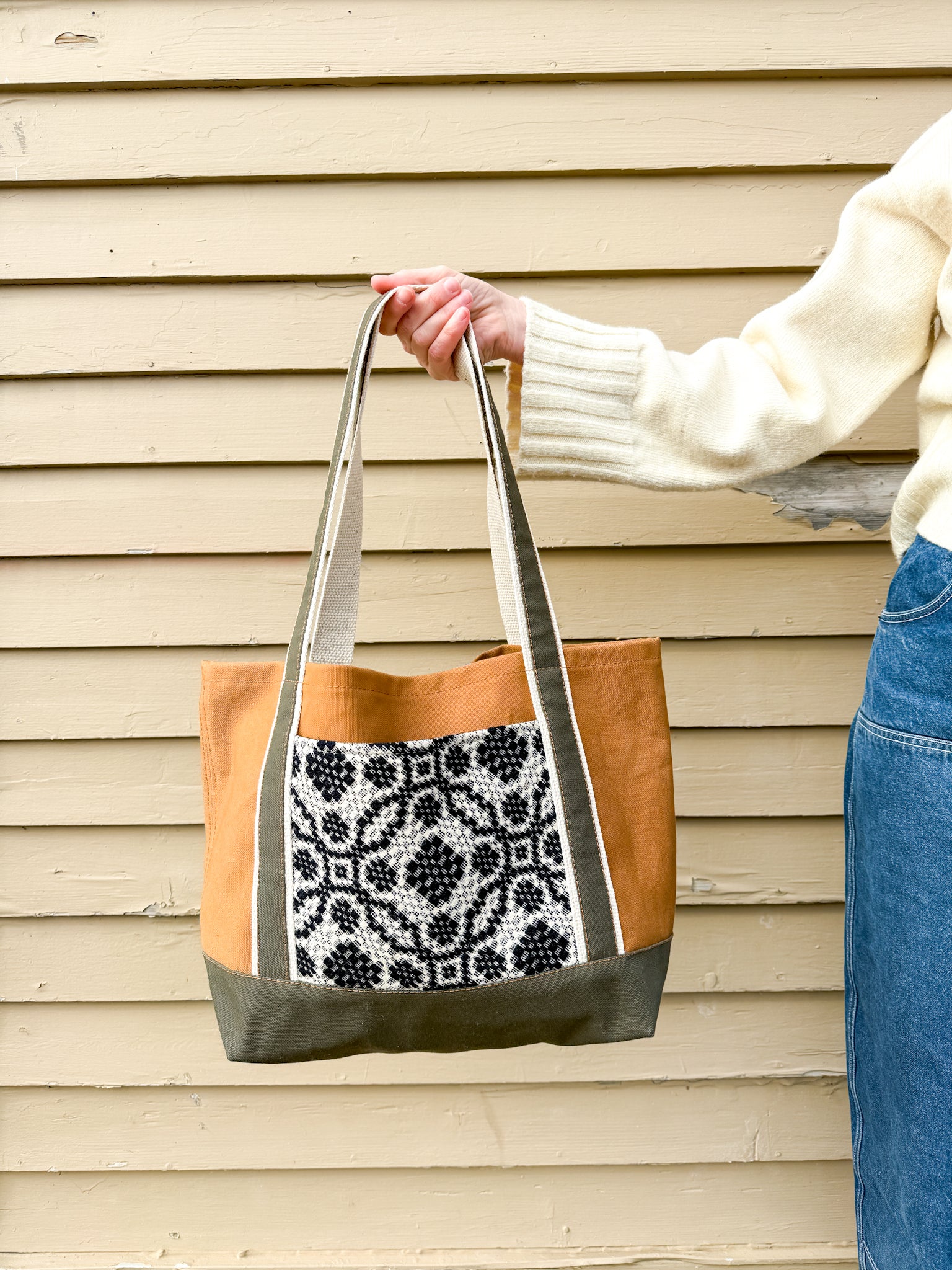 This bag features a canvas body in classic Carhartt brown, with a contrast, double layered bottom for durability in olive green canvas, with an accent front pocket made from a handwoven coverlet blanket(it has been batted and lined). These are truly beautiful, and such labors of love, we always strive to use up every last bit (it has been lined, as well as visual interest, of course). The inside of the tote is unlined, and the top edge features an antique brass lobster clasp to keep your keys from wandering off.