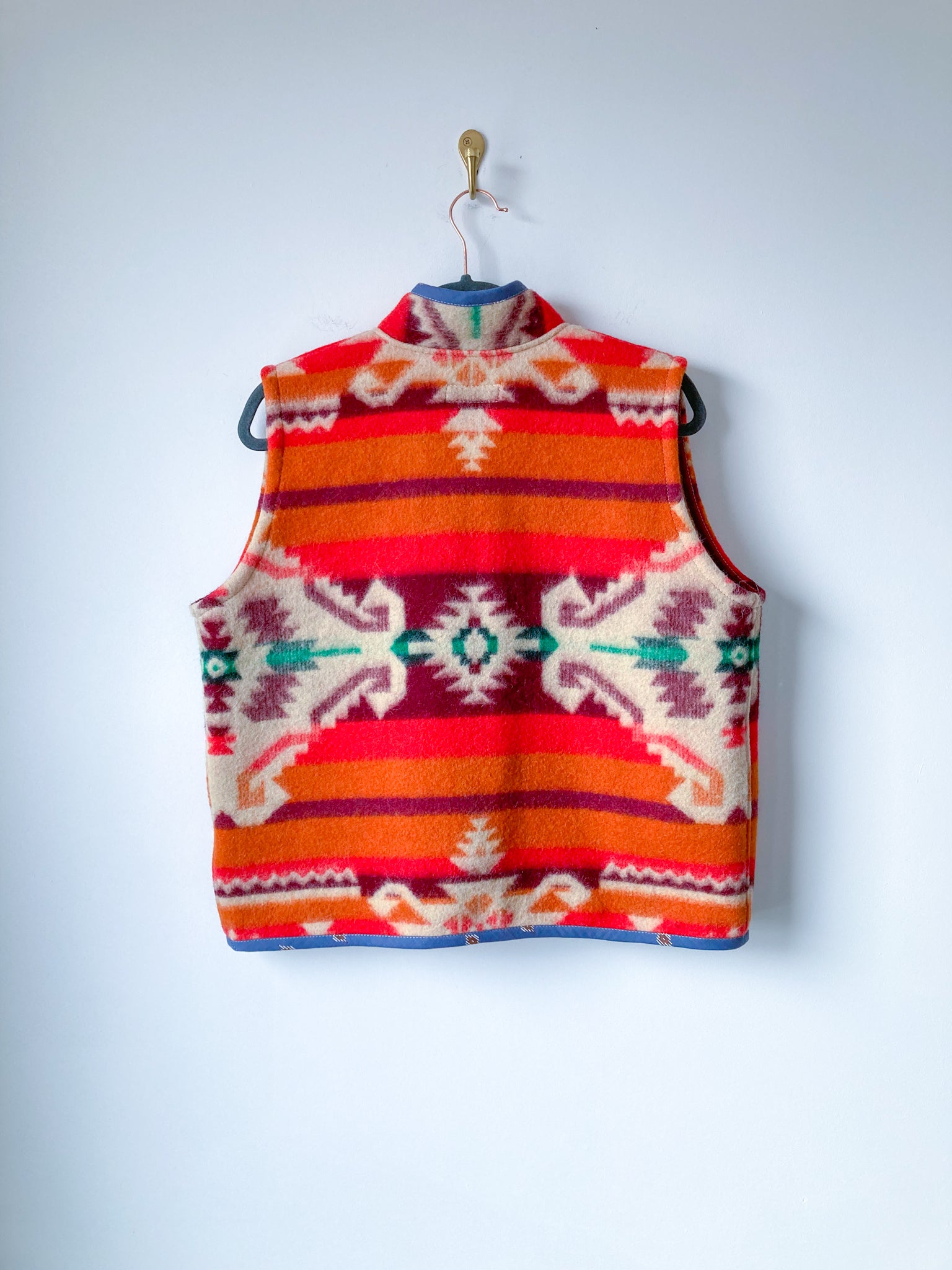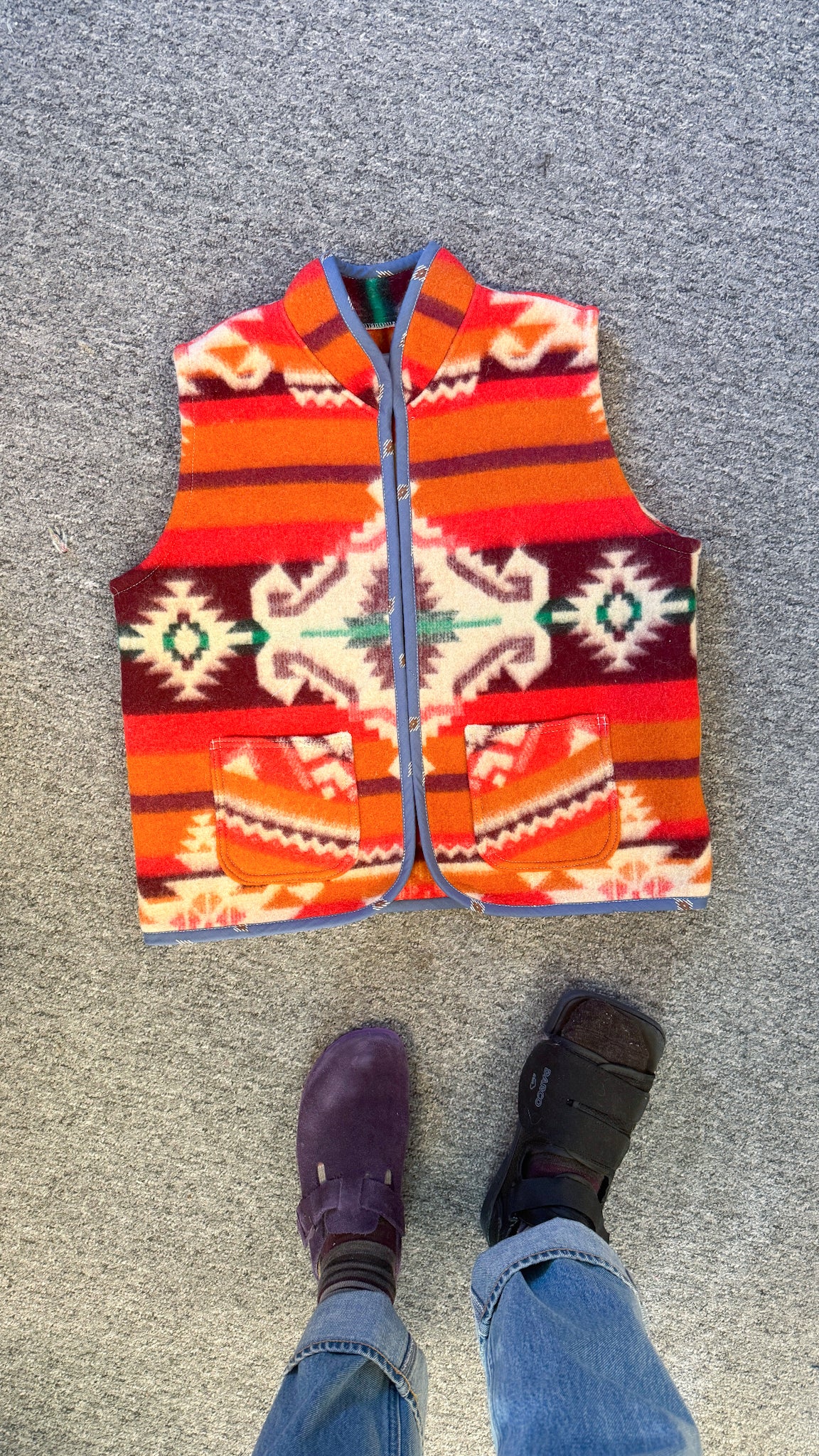 This vest features a deadstock vintage blanket sourced from a woman-owned business in Ukraine, with bound edges and fully-lined patch front pockets