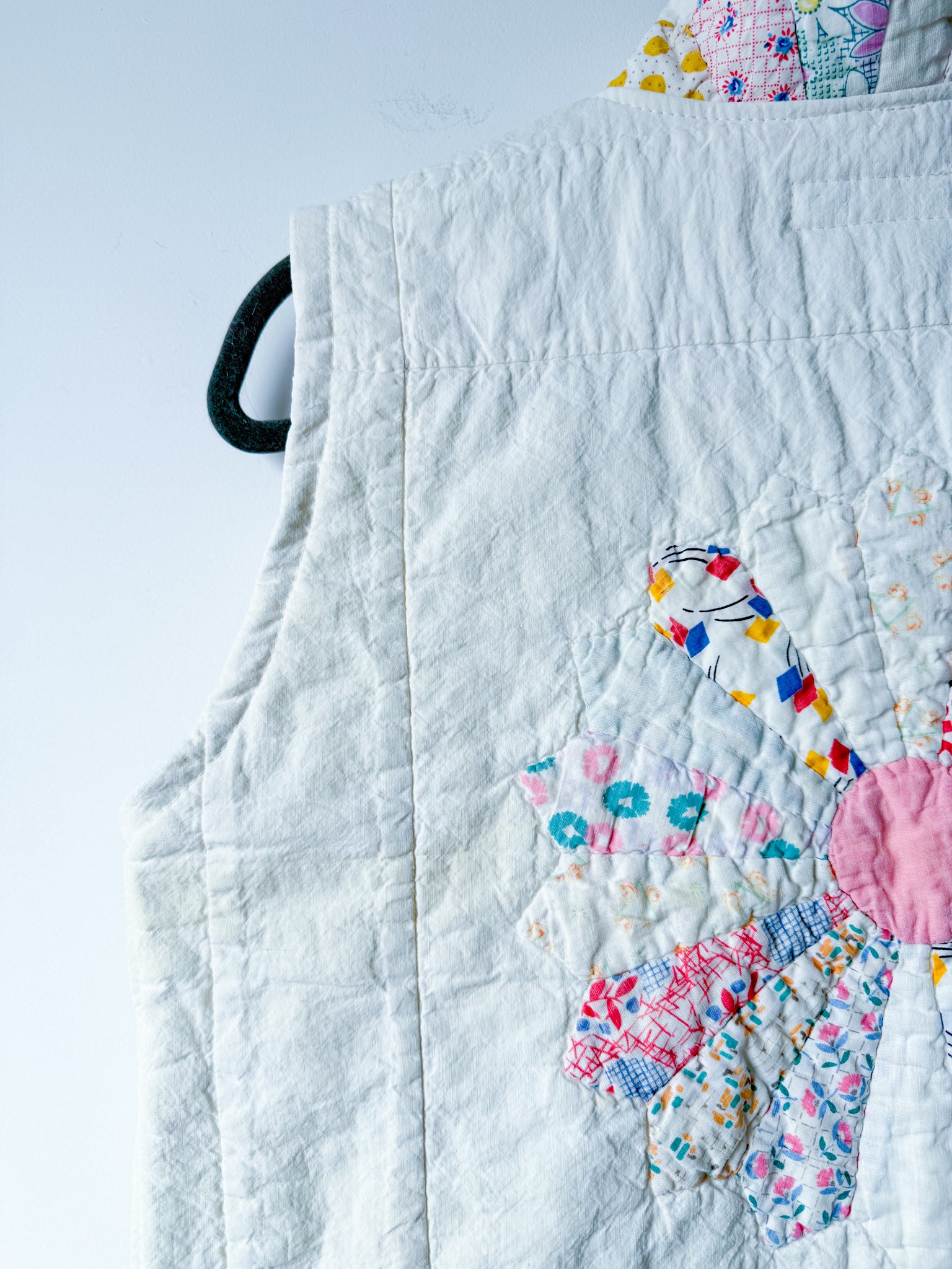 This vest features a lightweight quilt featuring many feedsack fabrics that have been brought together into Dresden Plate blocks, with bound edges and fully-lined patch front pockets