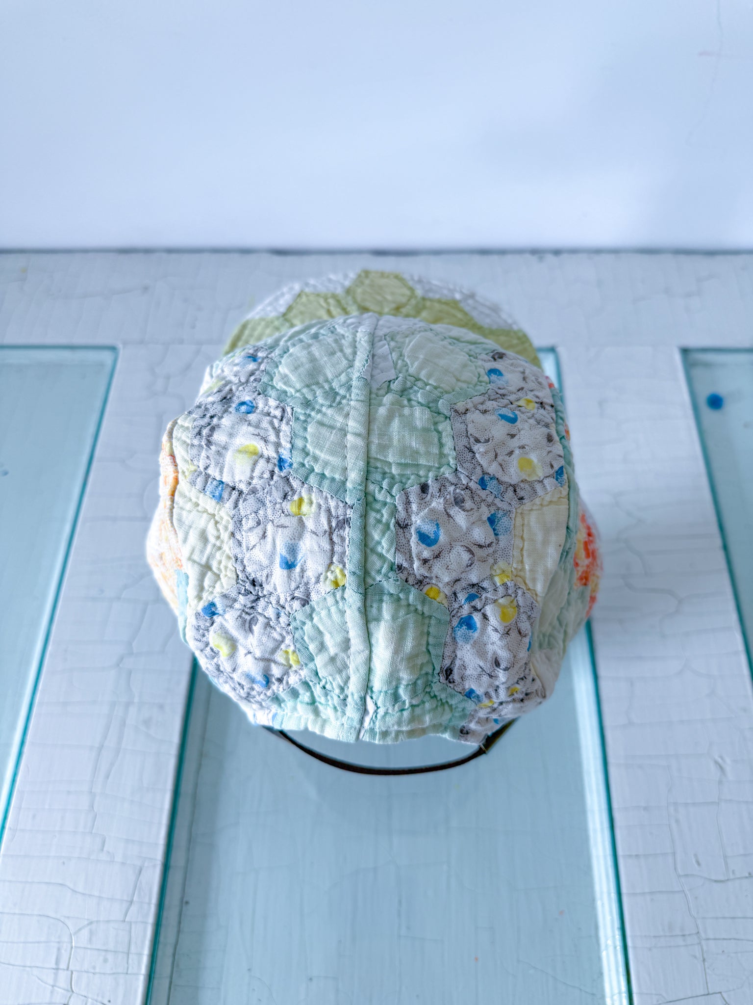 As this is a vintage/antique quilt that has lived a full life before becoming a hat, it is possible it shows its history in the form of minor discolorations, and/or wear, these are not viewed as flaws but as characteristics of its past - sold AS IS. Please see photos as returns are not accepted.