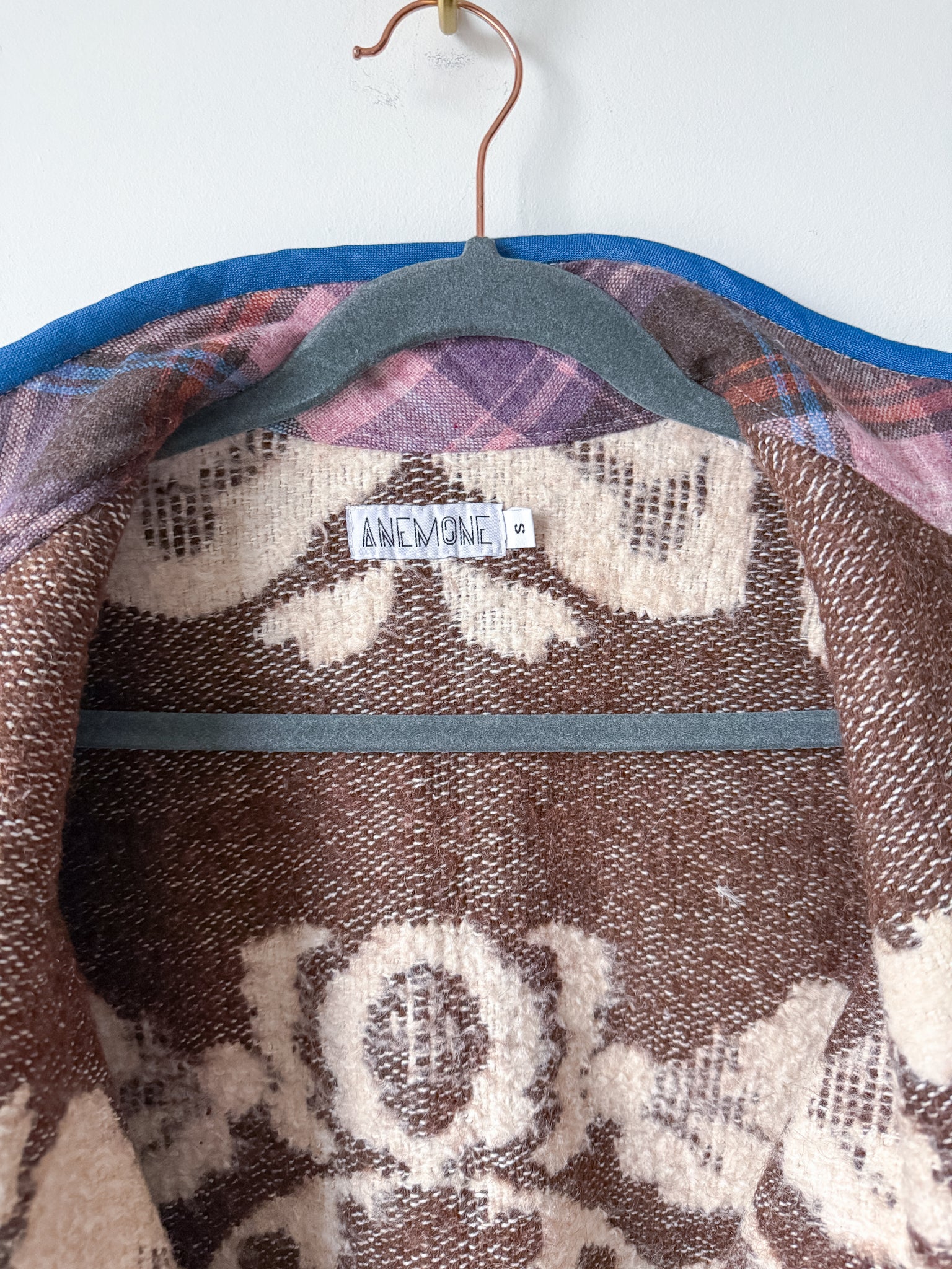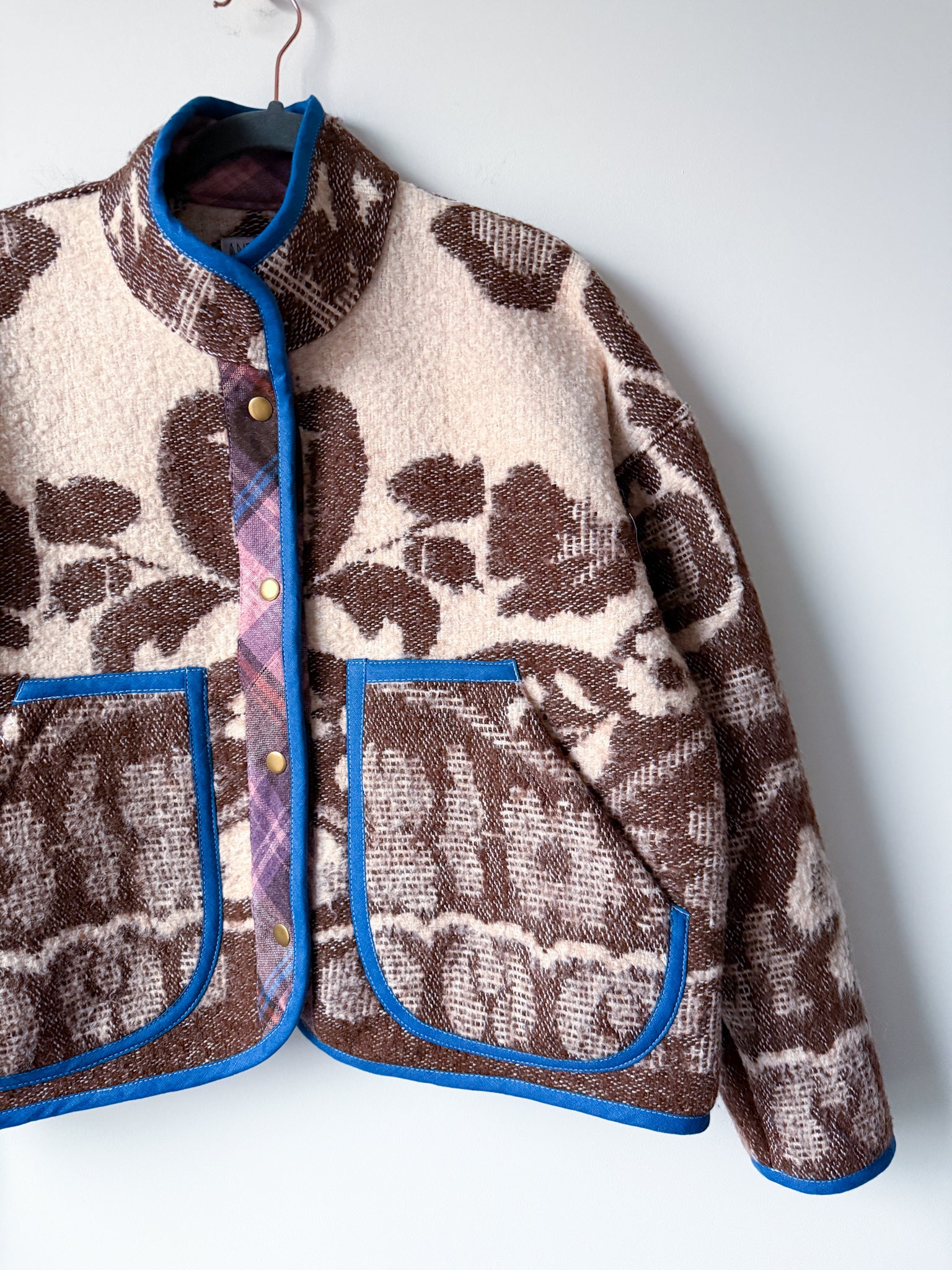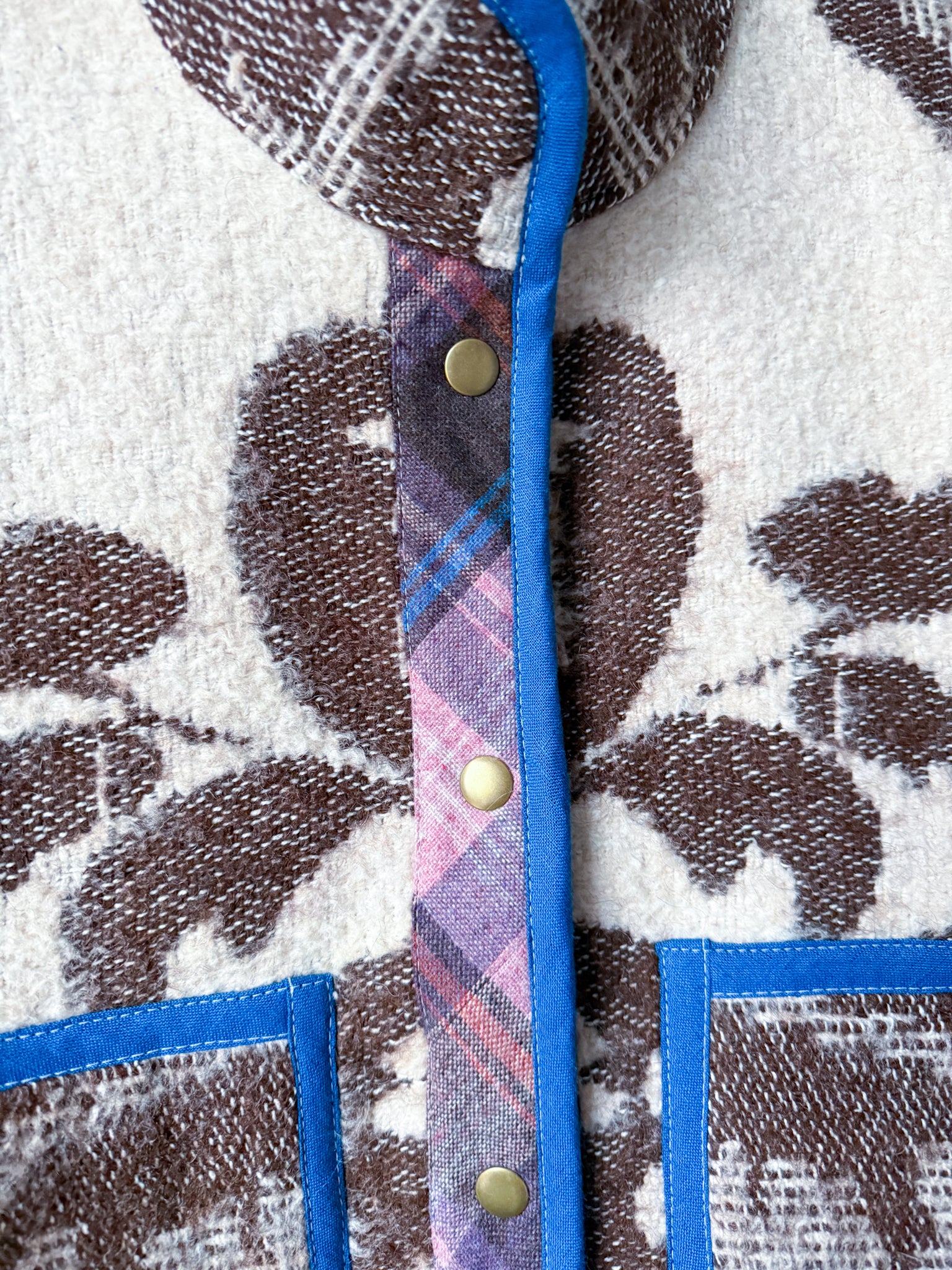 This Flora Jacket is made from a vintage blanket sourced from a woman-owned business in Ukraine. This style jacket features a straight side hem, bound edges, plackets and inner collar, antique brass snaps and rounded patch front pockets. The inner collar and front plackets are made from beautiful deadstock Pendleton wool shitting fabric that I found at a local estate sale, and the outer edges are bound in cobalt blue linen.