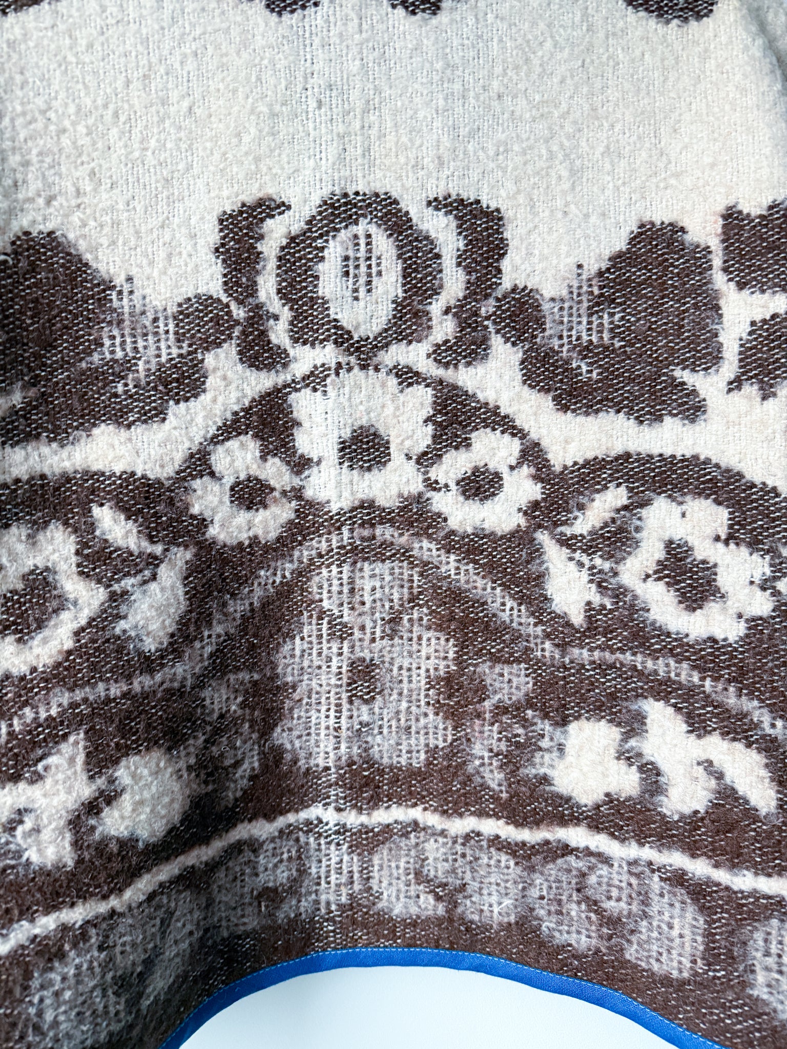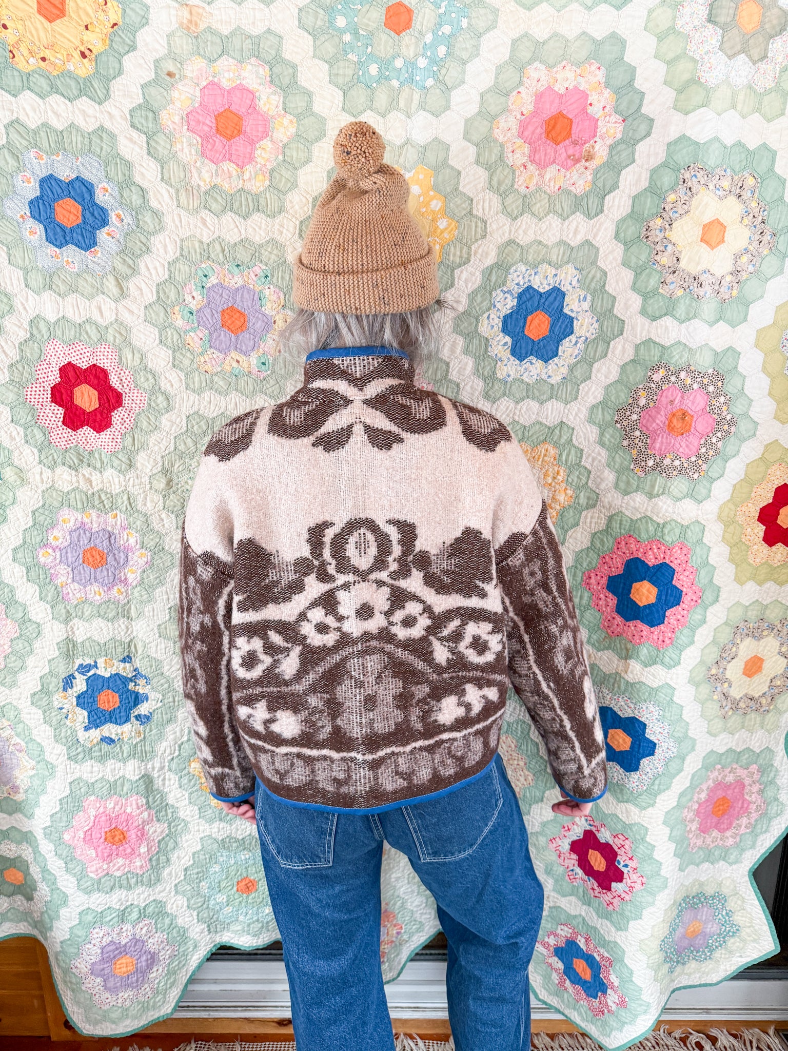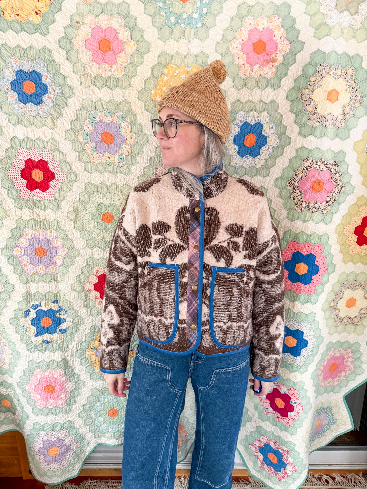 This Flora Jacket is made from a vintage blanket sourced from a woman-owned business in Ukraine. This style jacket features a straight side hem, bound edges, plackets and inner collar, antique brass snaps and rounded patch front pockets. The inner collar and front plackets are made from beautiful deadstock Pendleton wool shitting fabric that I found at a local estate sale, and the outer edges are bound in cobalt blue linen.