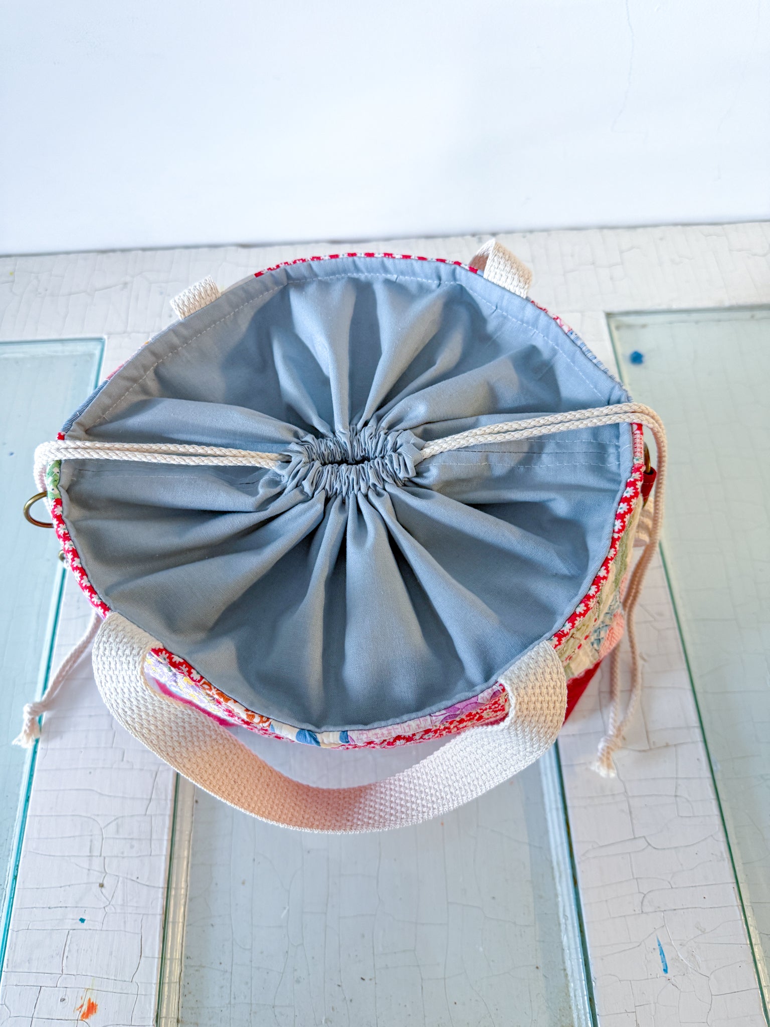 Introducing: The Project Bag with a detachable strap to wear crossbody, over the shoulder, or you can remove it to carry by the handles - this was created with the intention of corralling all your crafting bits and bobs, but doubles as a catch-all for whatever you need to bring with you wherever you go. This bag features an antique upper panel, waxed canvas bottom for durability that will age beautifully over time, and a drawstring cinch top for containing everything inside. This comfortably holds a couple skeins of yarn and whatever work in progress you might have (I've been using mine to hold a sweater I'm knitting!). The inside is fully lined in a lavender and white petite gingham cotton fabric and features 3 inside pockets.