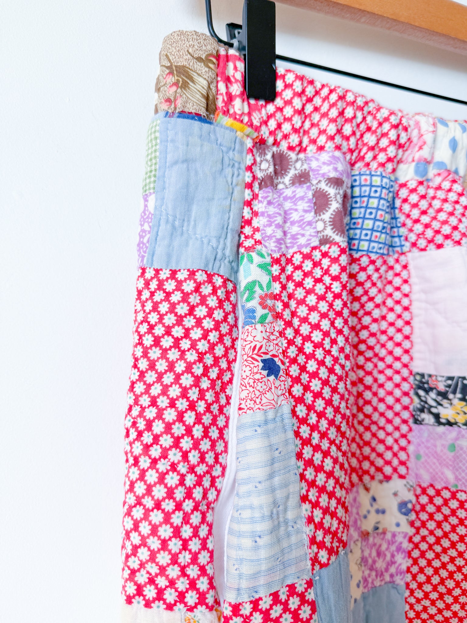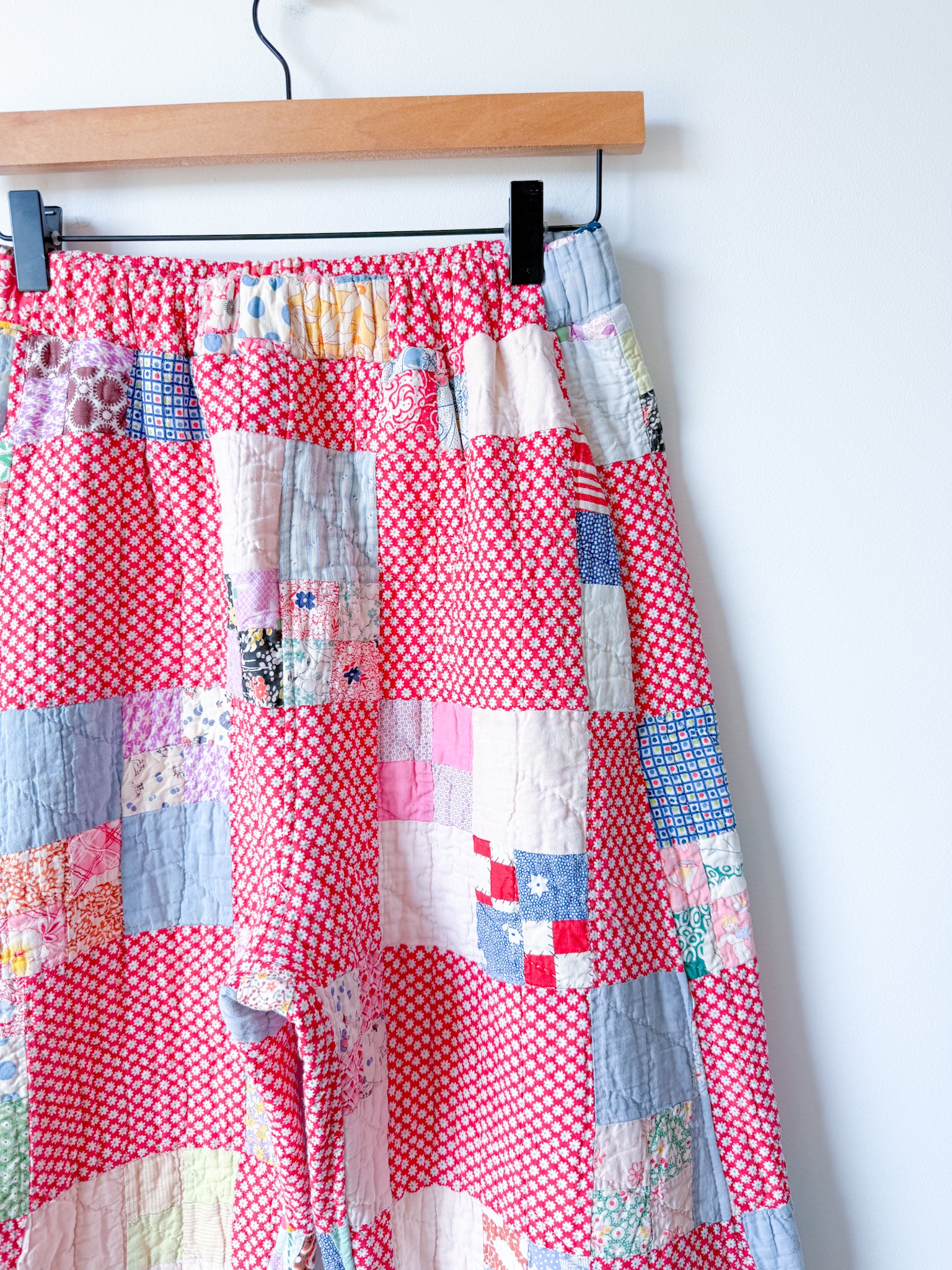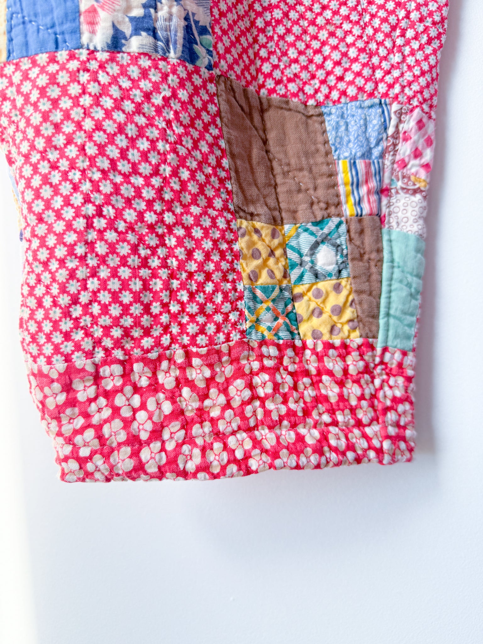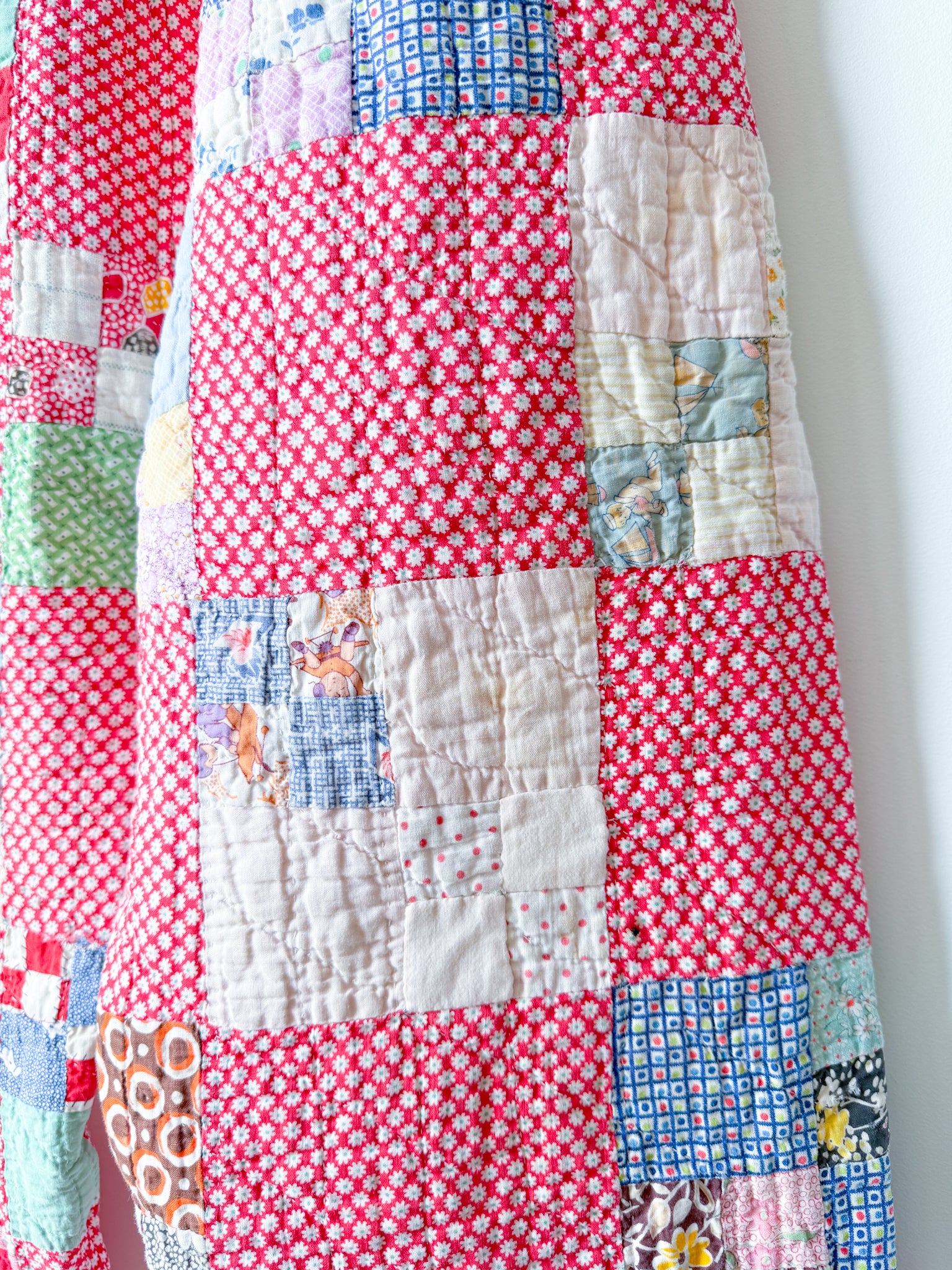 This pair was reworked from a lightweight quilt that is both hand-pieced and quilted in a traditional Nine Patch Block pattern with a variety of cheery feedsacks and plaid fabrics.