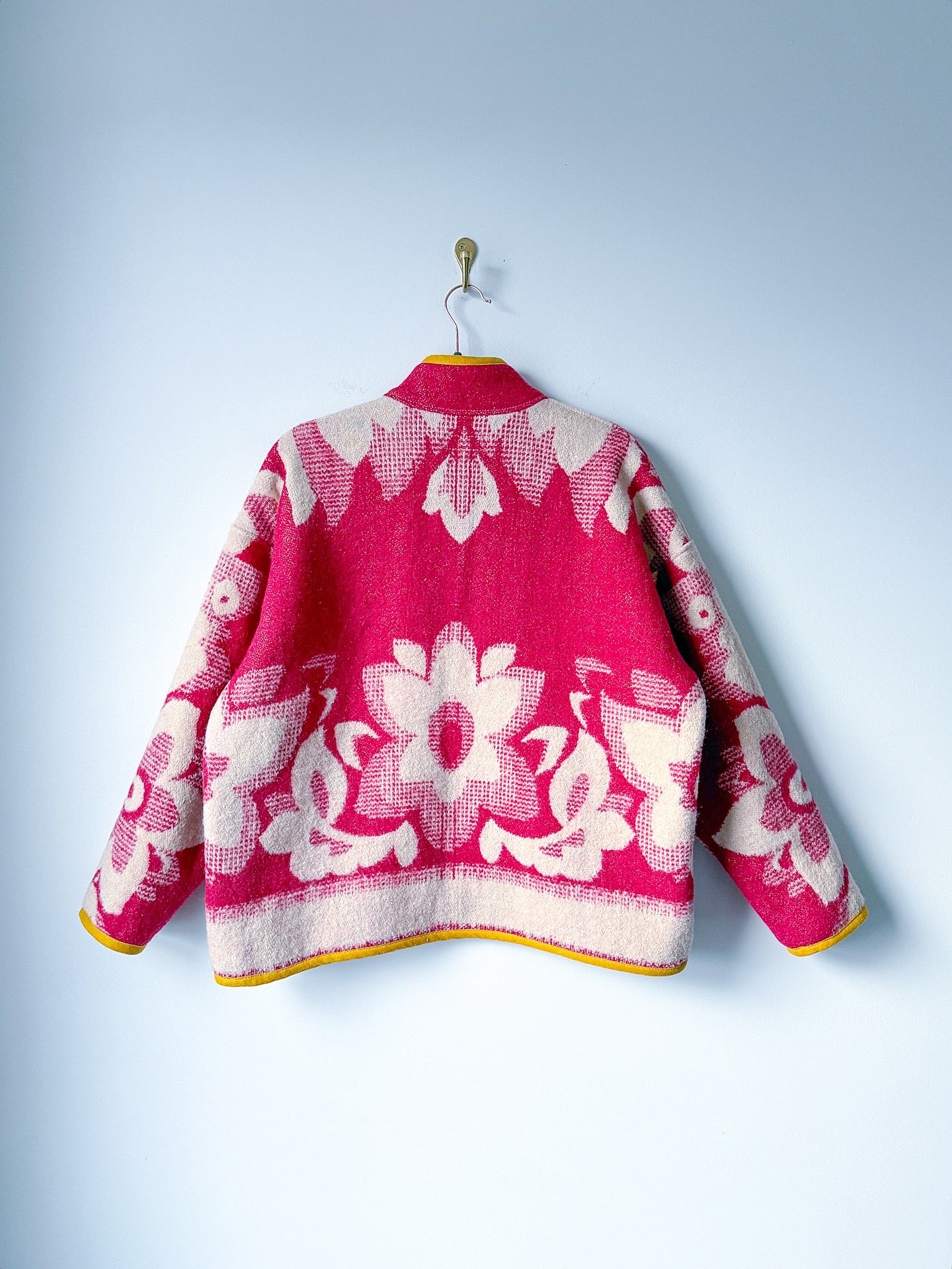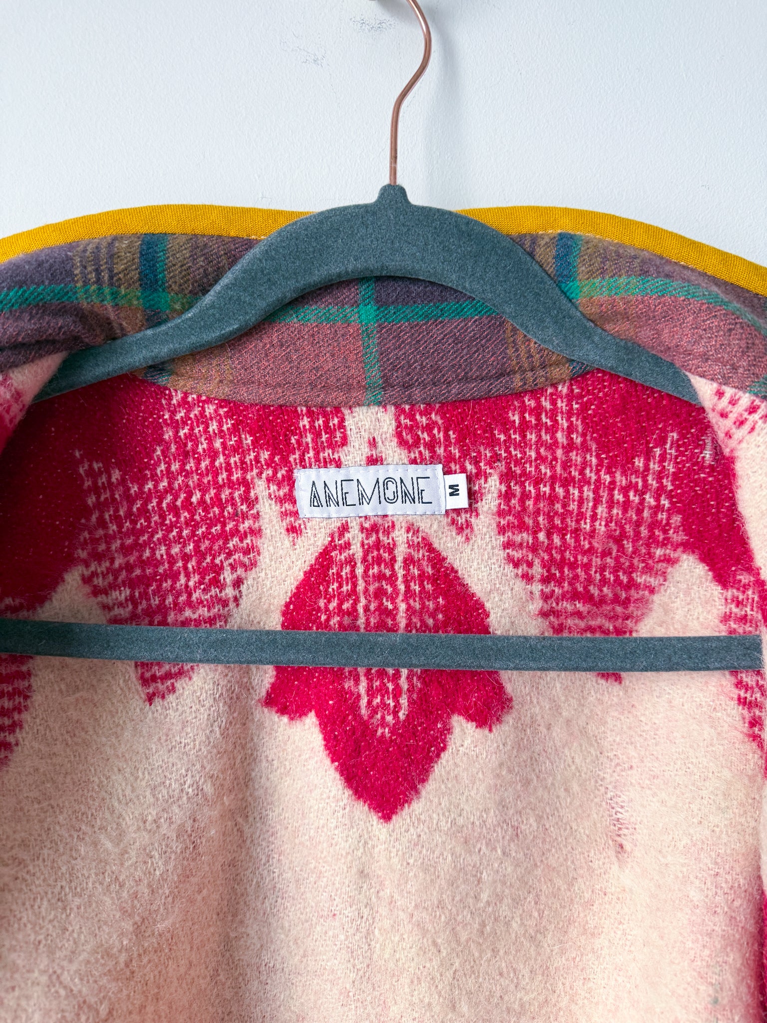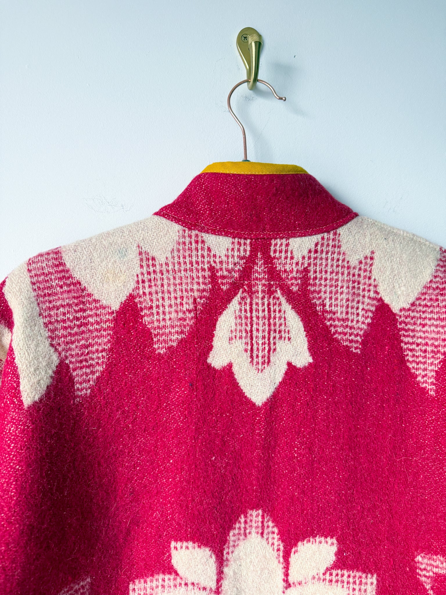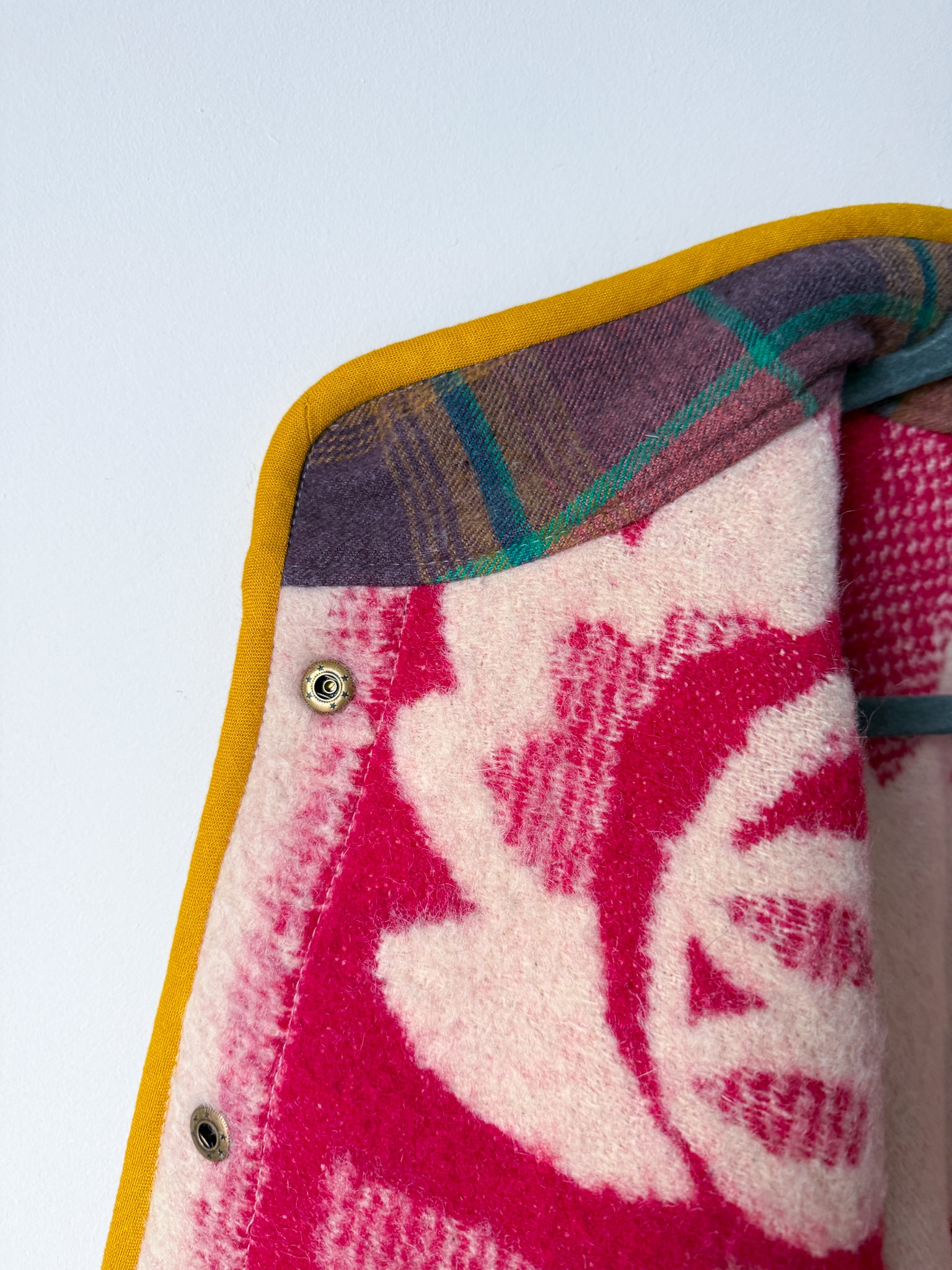 This Flora Jacket is made from a vintage blanket sourced from a woman-owned business in Ukraine. This style jacket features a straight side hem, bound edges, plackets and inner collar, antique brass snaps and rounded patch front pockets. This is the Flora Jacket pattern by Brightside Pattern Company that I pattern tested for them, and they were kind enough to grant me permission to make finished coats available to you! The fit is oversized through the body with slimmer arms, and a stand up collar - a truly amazing fit!