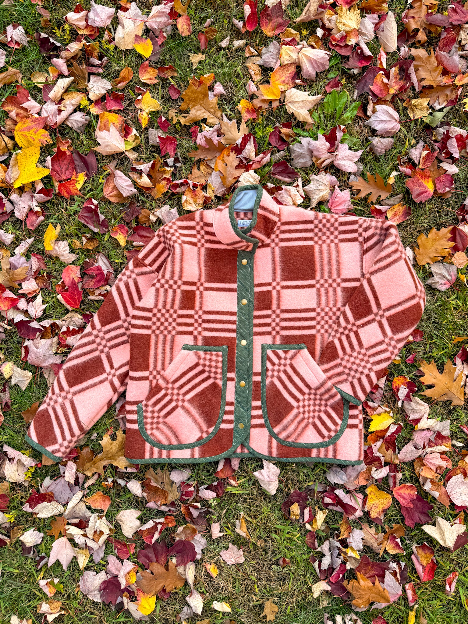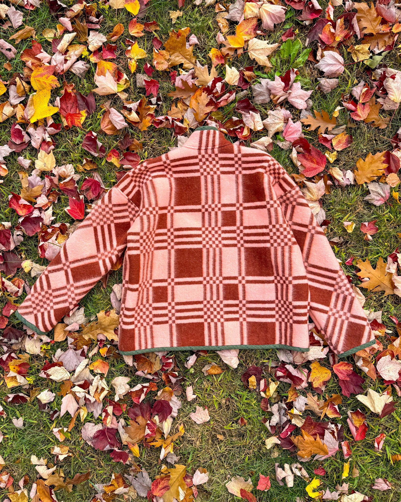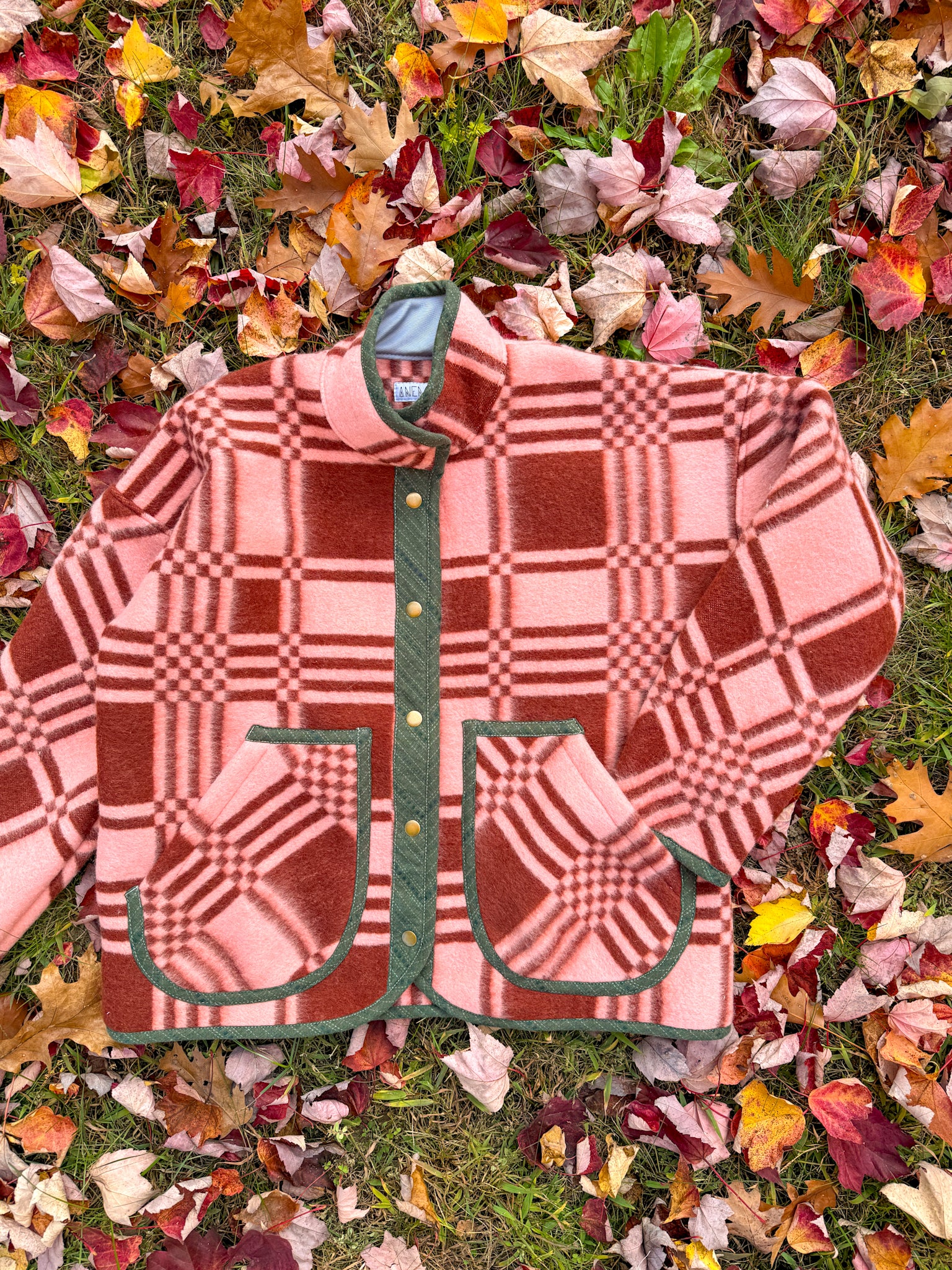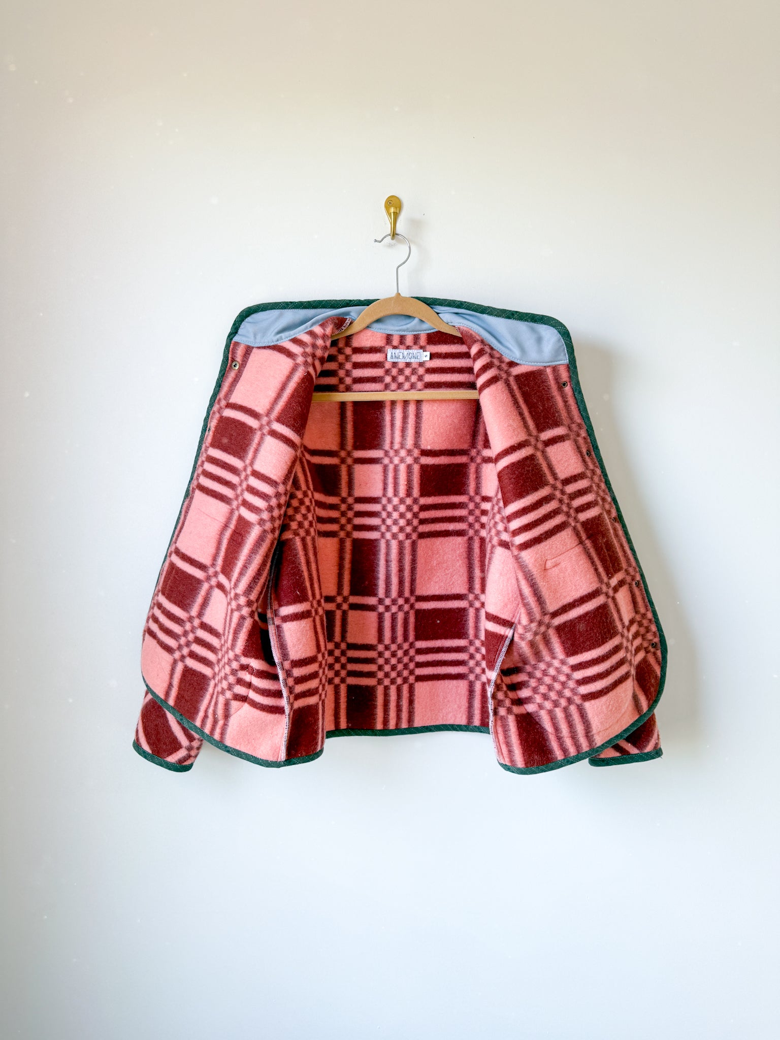 This Flora Jacket is made from a deadstock blanket sourced from Ukraine. The front plackets, inner collar lining, and edges are bound in forest green toned woven cotton sample fabric from our friends at Toad&Co.