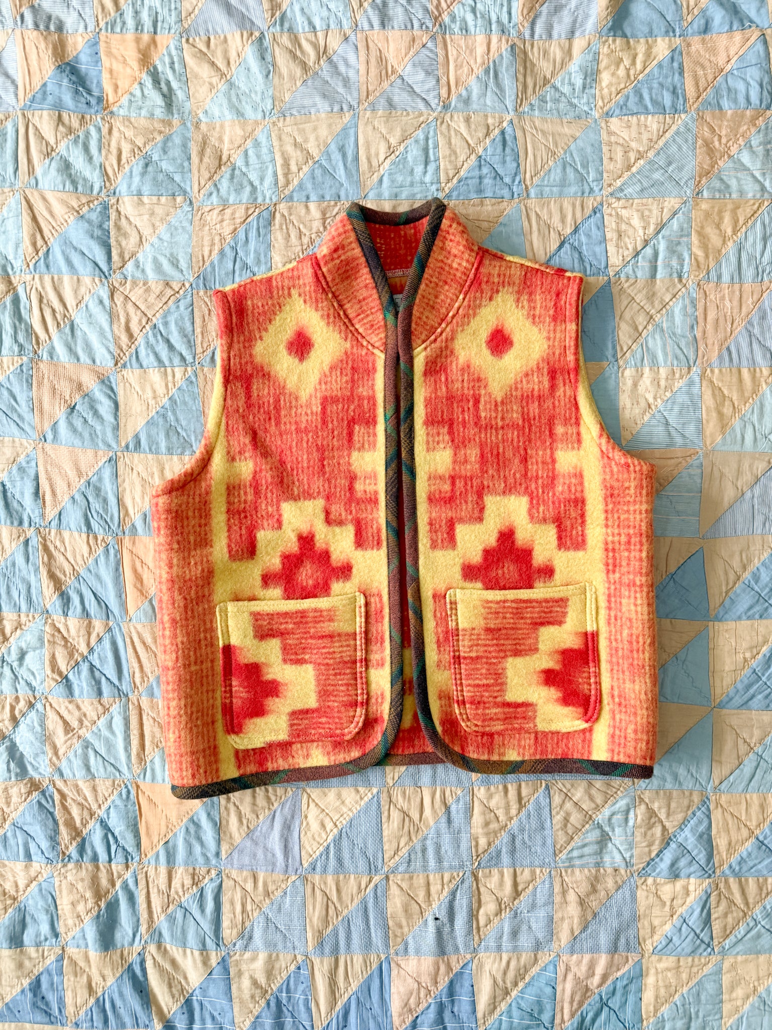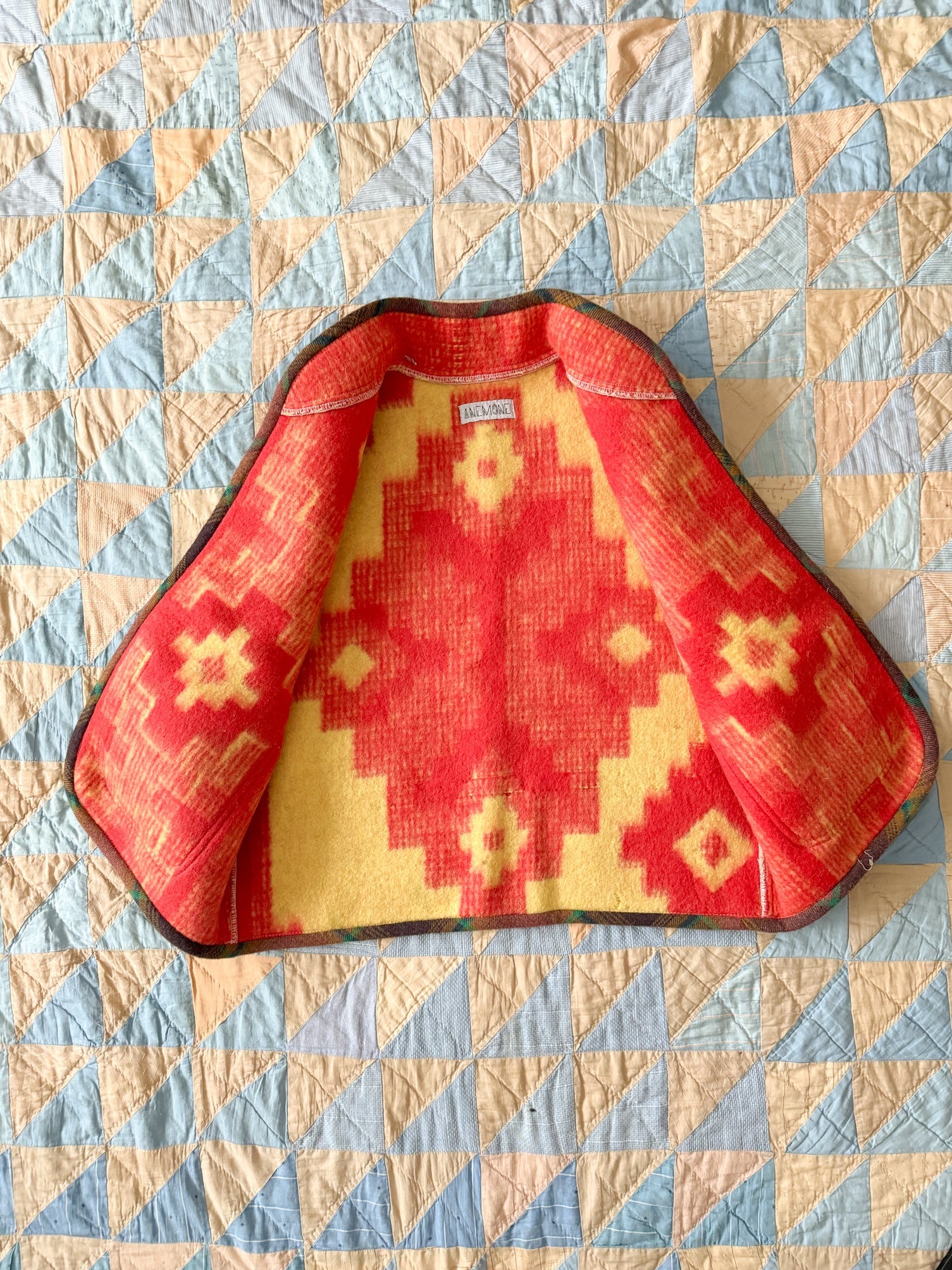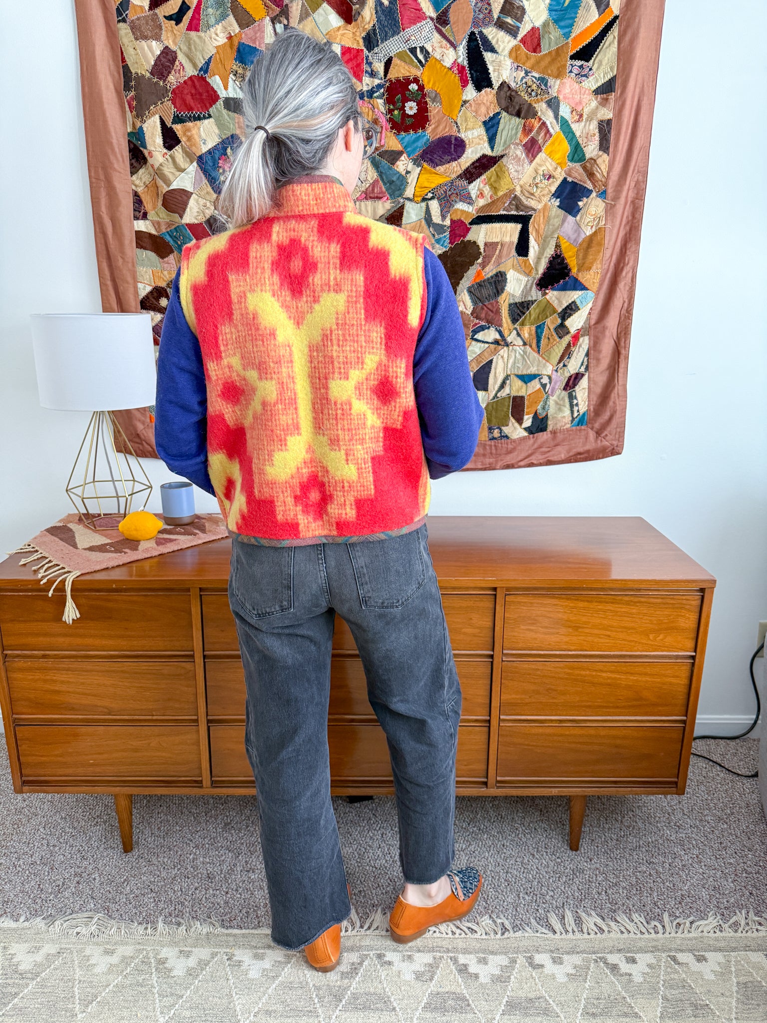 This vest features a vintage wool blanket sourced from a woman-owned business in Ukraine, with bound edges and fully-lined patch front pockets