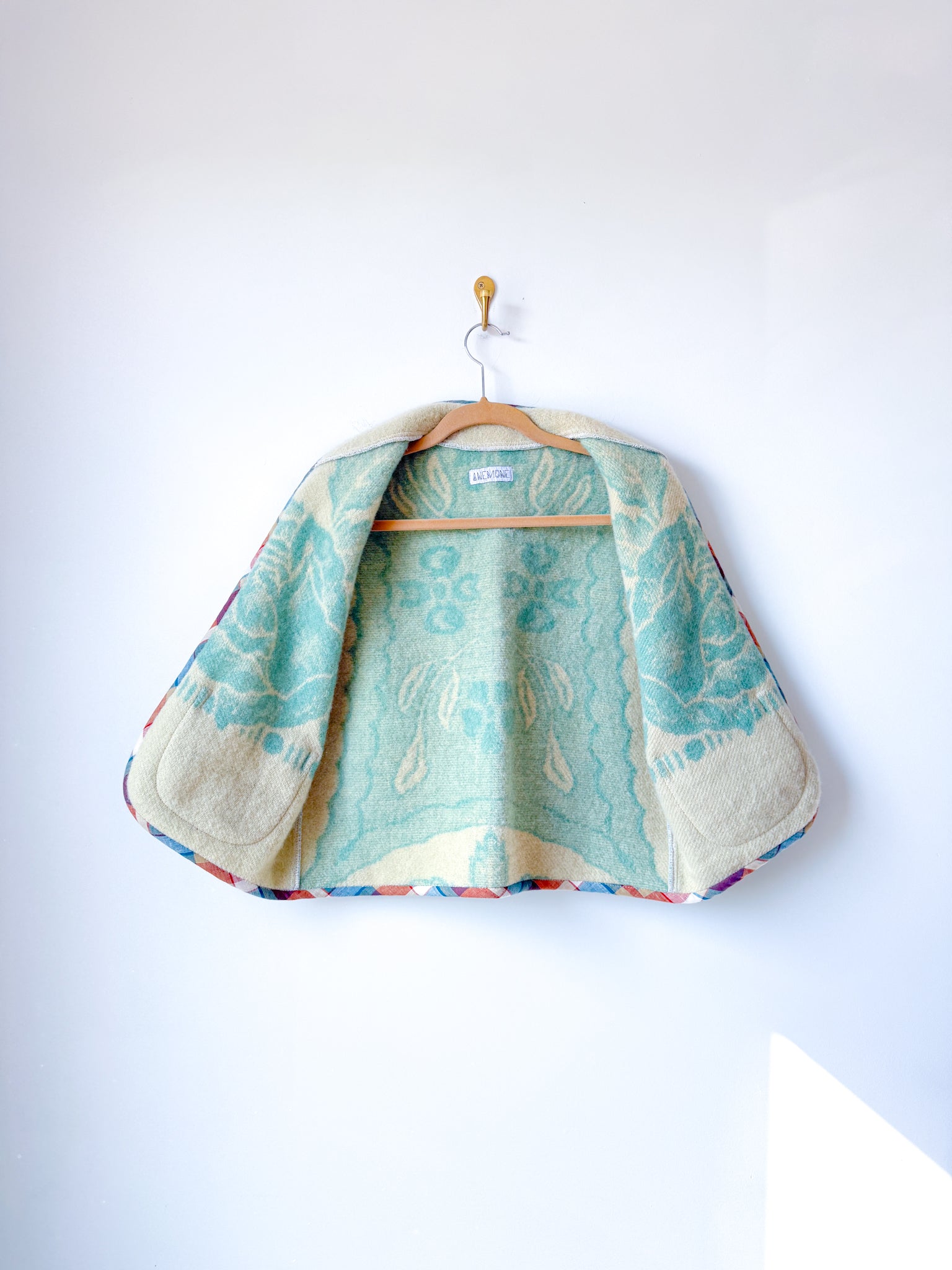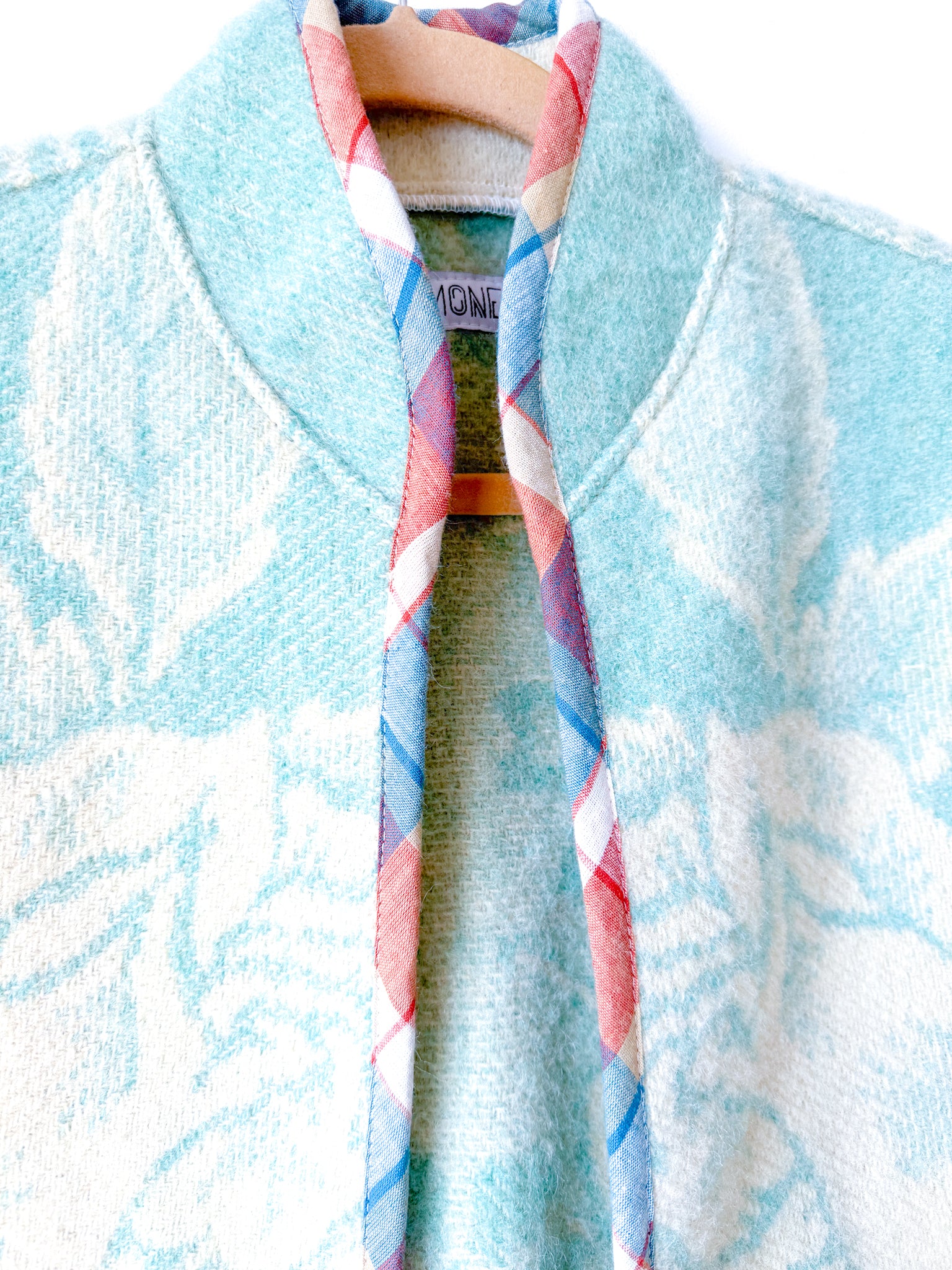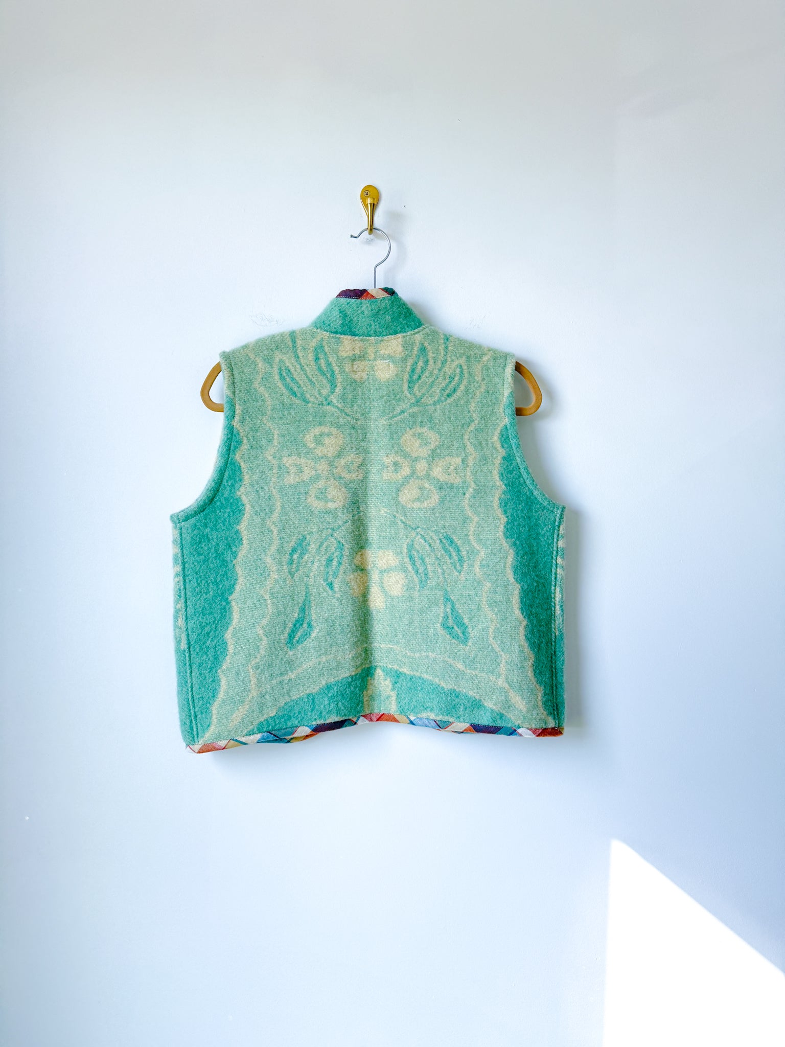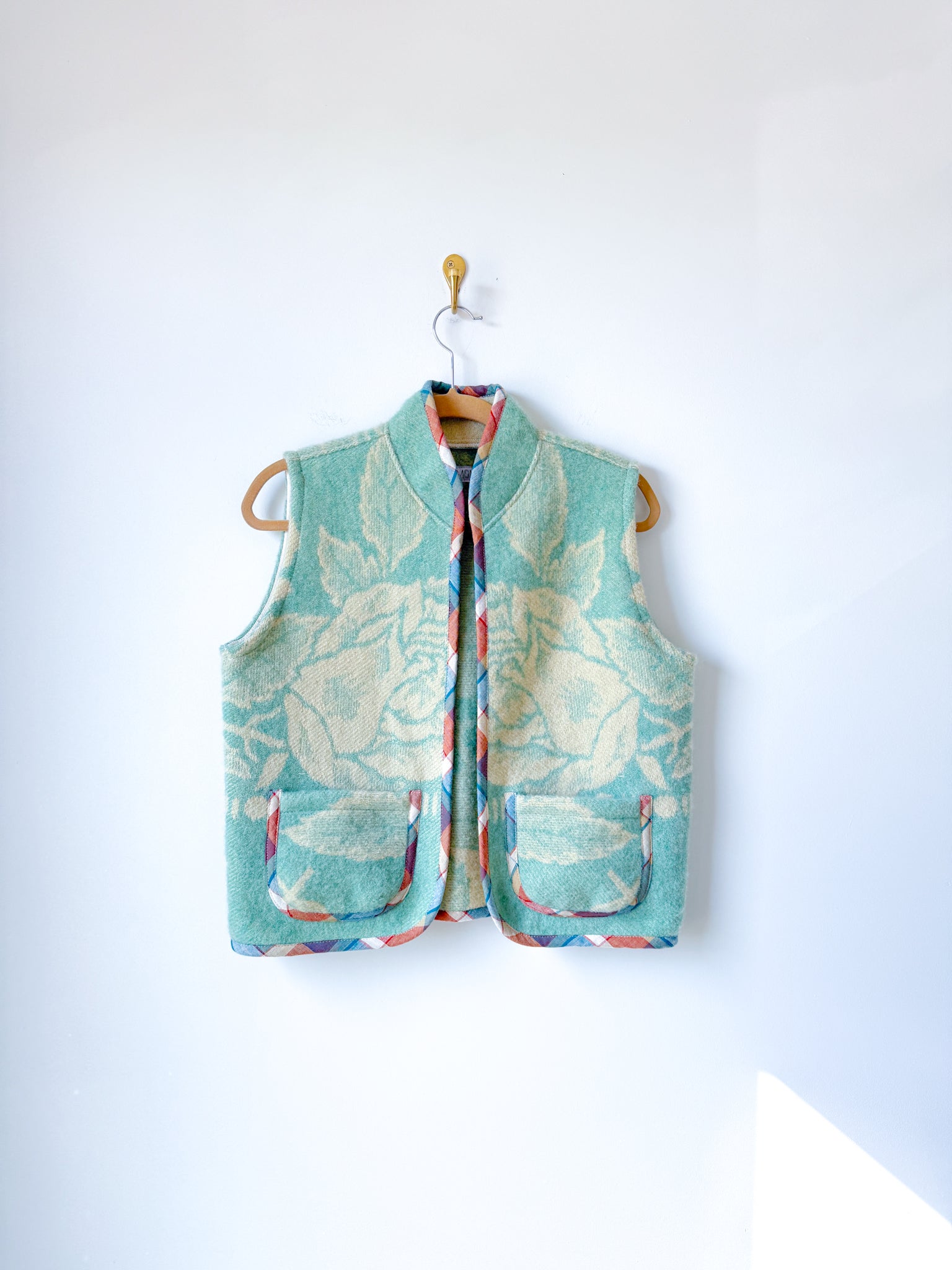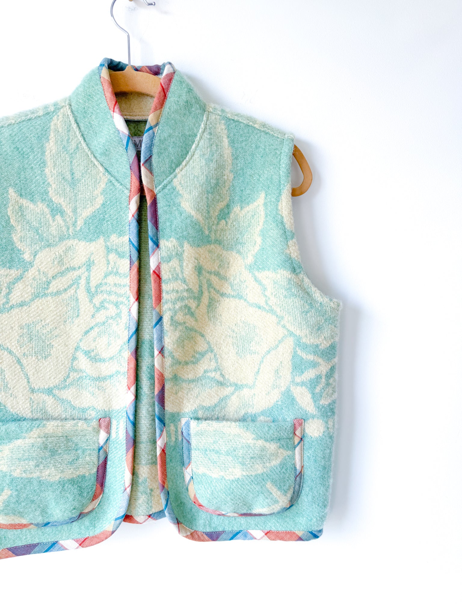 This vest features a vintage Orr Health 100% wool blanket with a contrast plaid cotton binding from Toad&Co. fabric scraps, complete with rounded patch pockets.
