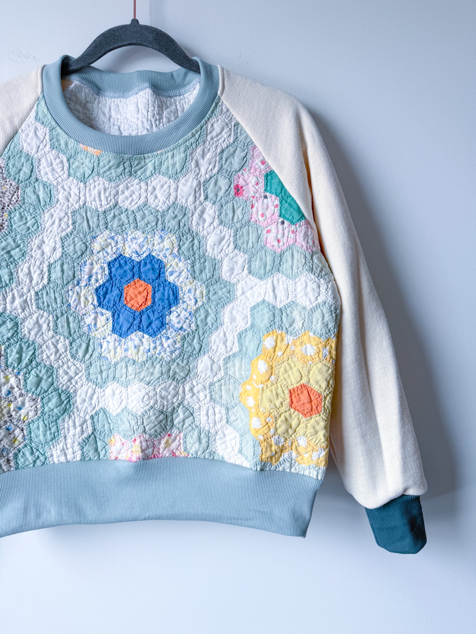 The Raglan Pullover features a classic crewneck with raglan sleeves (perfect for those who love lots of room for movement through the shoulder!) and runs true to size, but I also like sizing up for a roomier fit. The front and back have been made from a lightweight quilt that is hand-pieced and quilted in a classic Grandmother's Flower Garden pattern, with the arms constructed with 100% organic cotton French Terry, and contrast ribbing - both made in the USA.