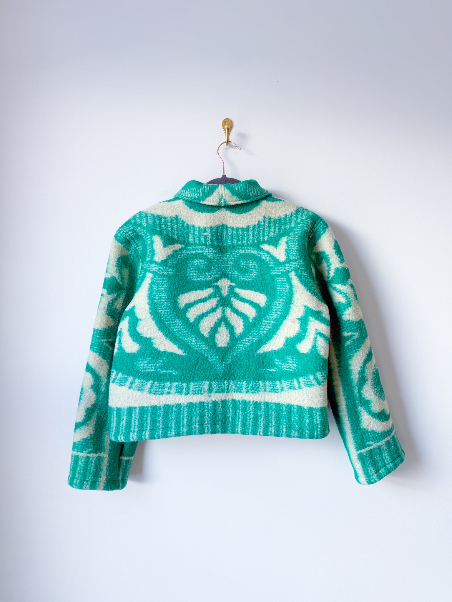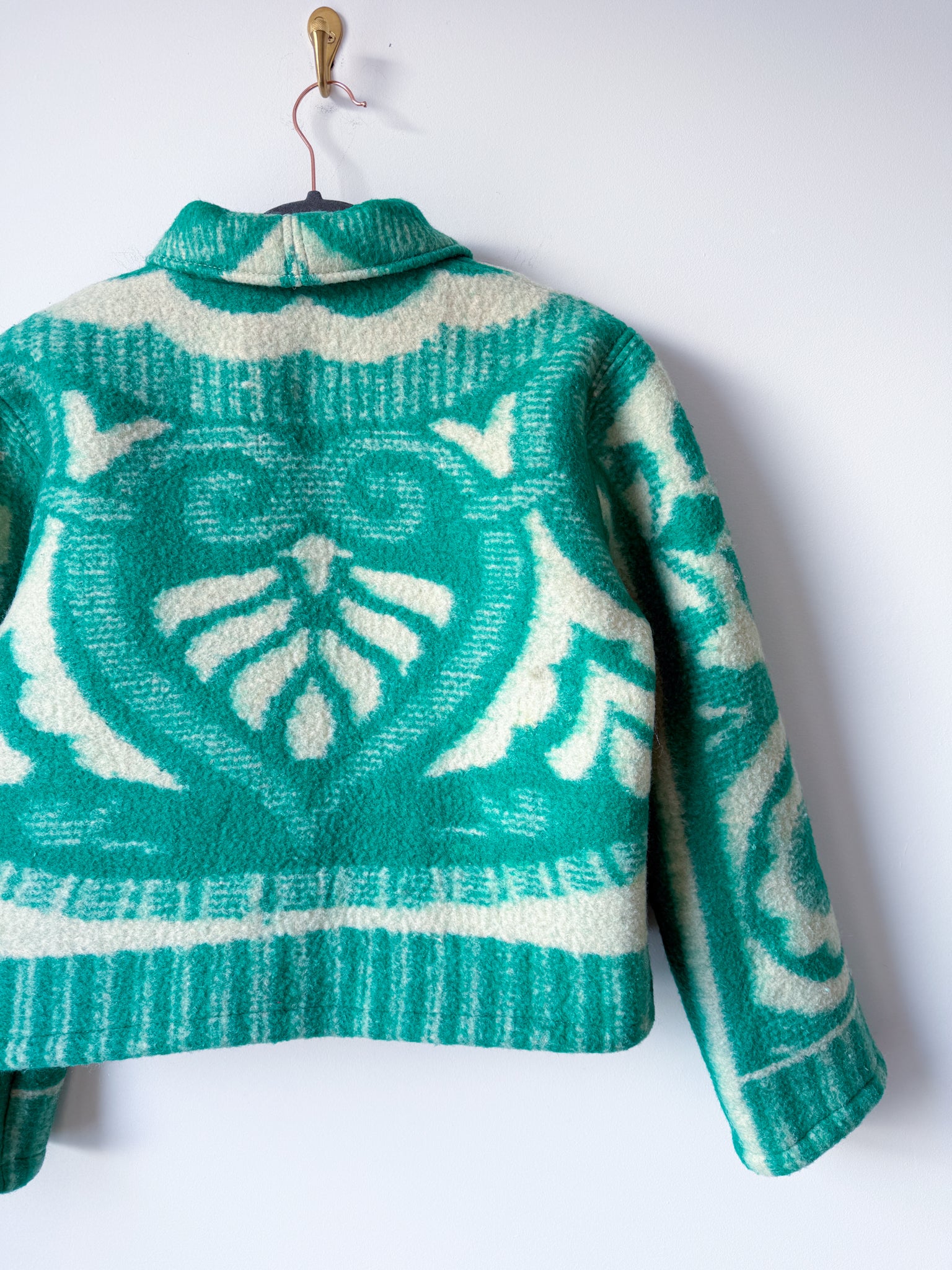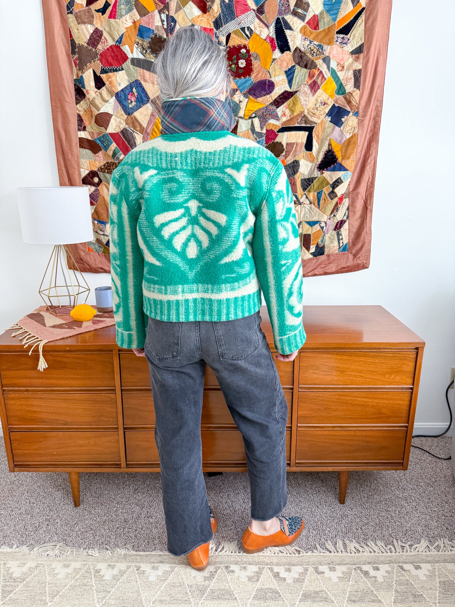 This vintage Ukrainian blanket (purchased from a woman-owned business in Ukraine!) has been reworked into a Field Jacket, which features a slight drop shoulder and tapered sleeve, with a straight silhouette, complete with lined front patch pockets and antique brass snaps. The under collar and inner facings are a cozy plaid flannel sample fabric from our friends at Toad&Co.