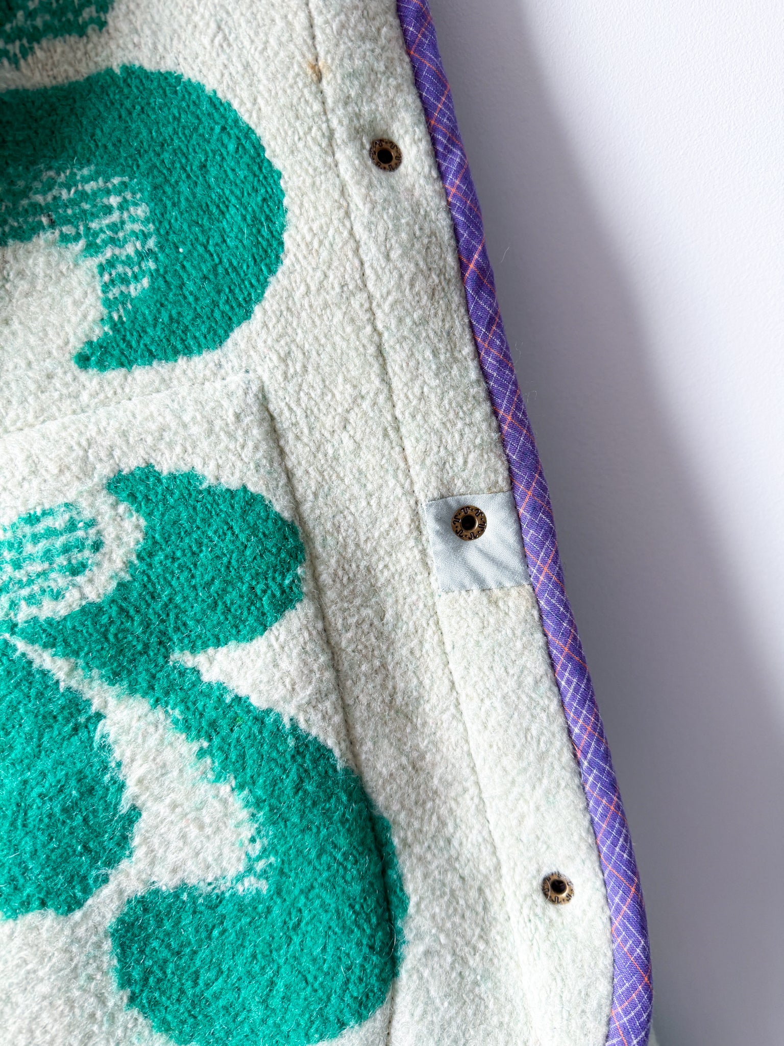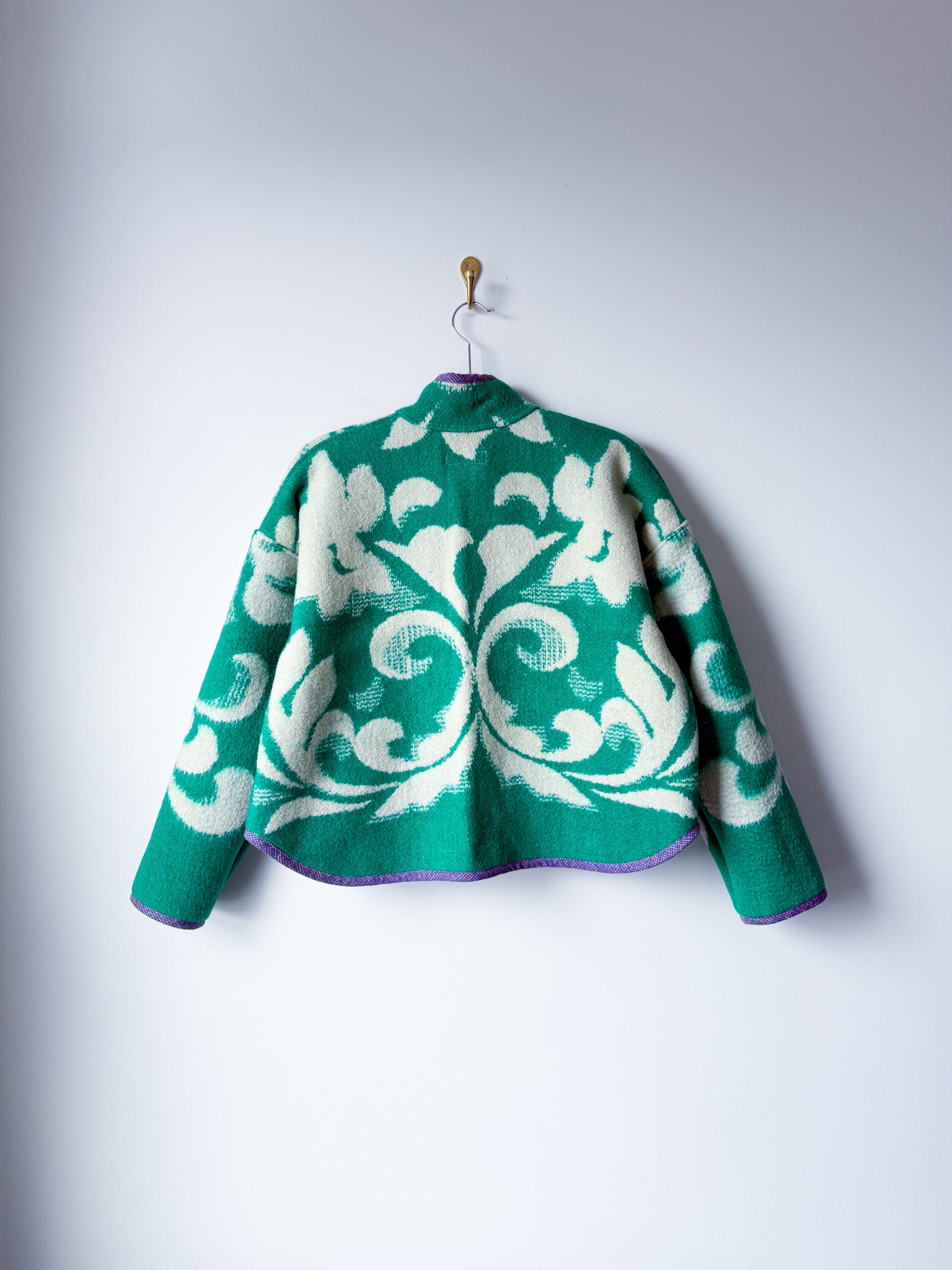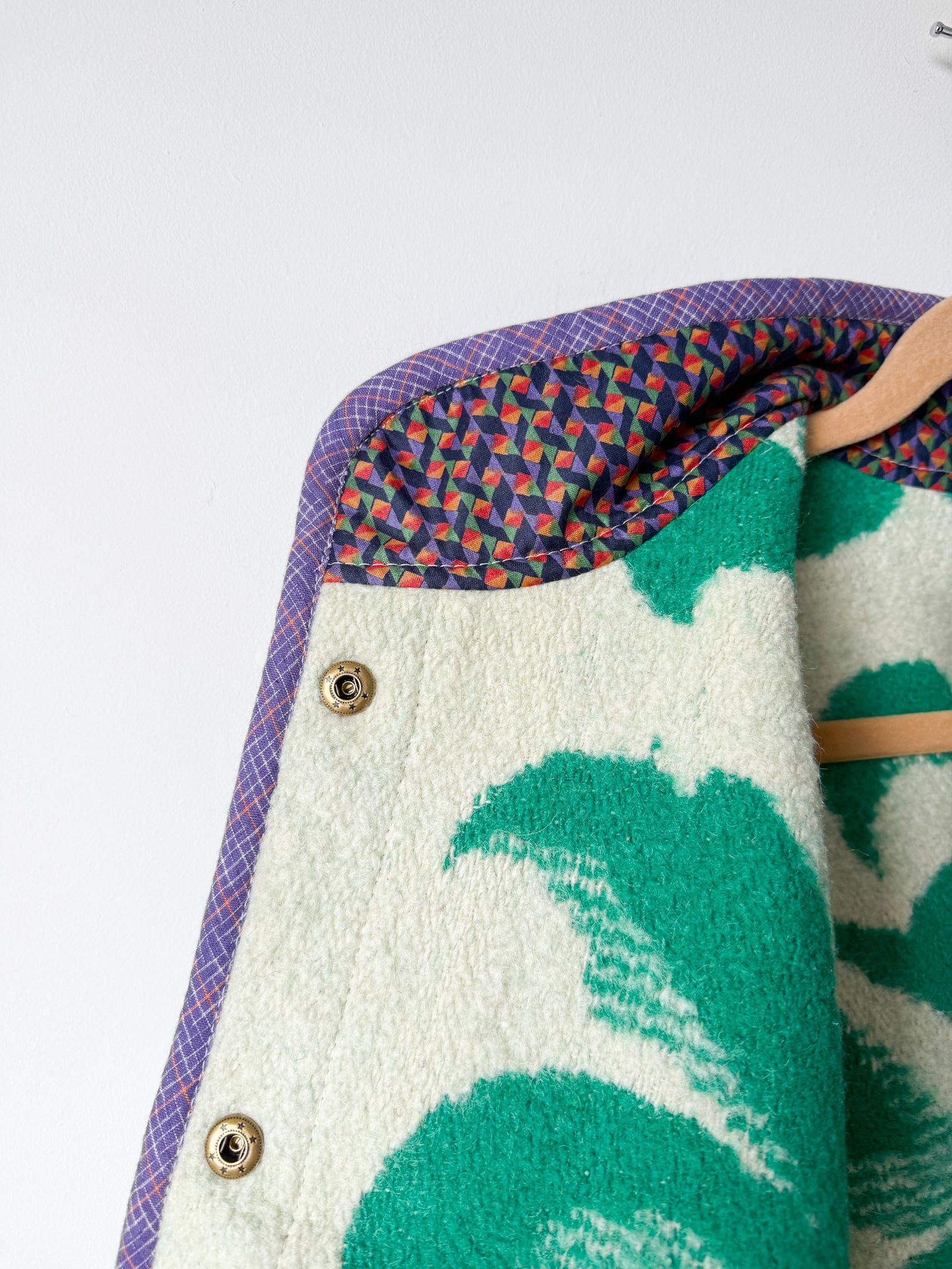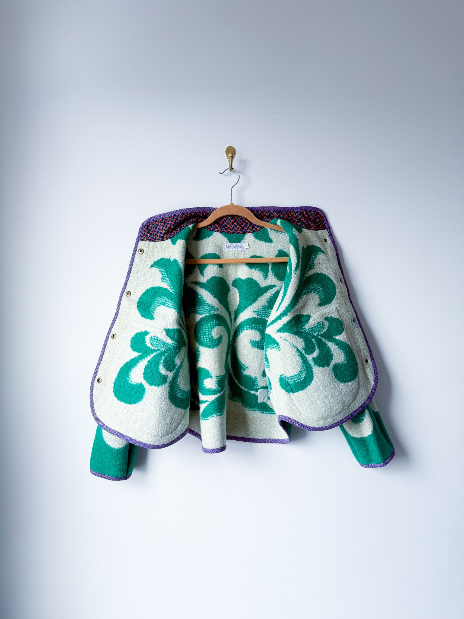 This Flora Jacket is made from a vintage blanket sourced from Ukraine, in a cool-toned green with a contrast floral pattern. The front plackets and inner collar are lined in a vintage batik patterned fabric, while the edges, pockets, and sleeves are bound in a woven cotton that pairs perfectly with the collar and placket fabric.