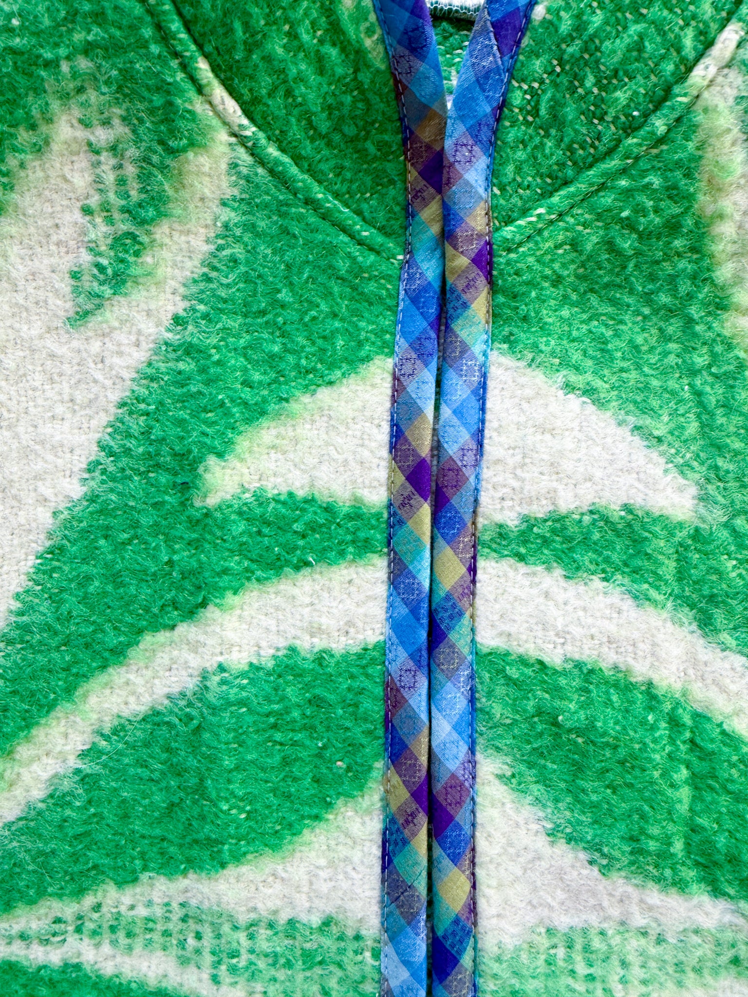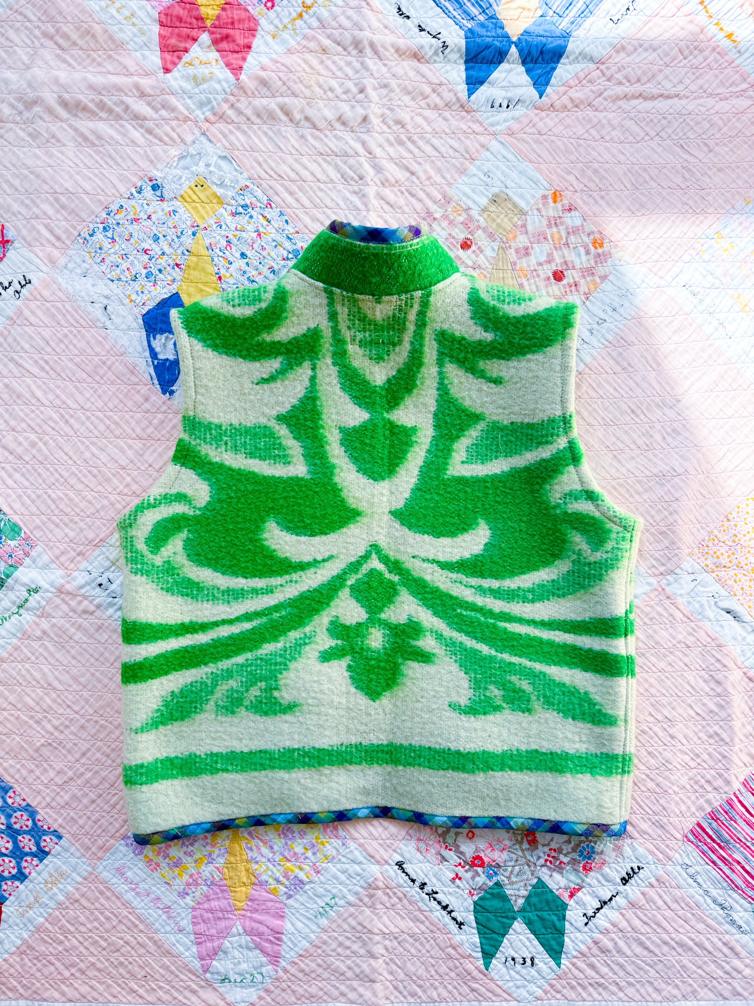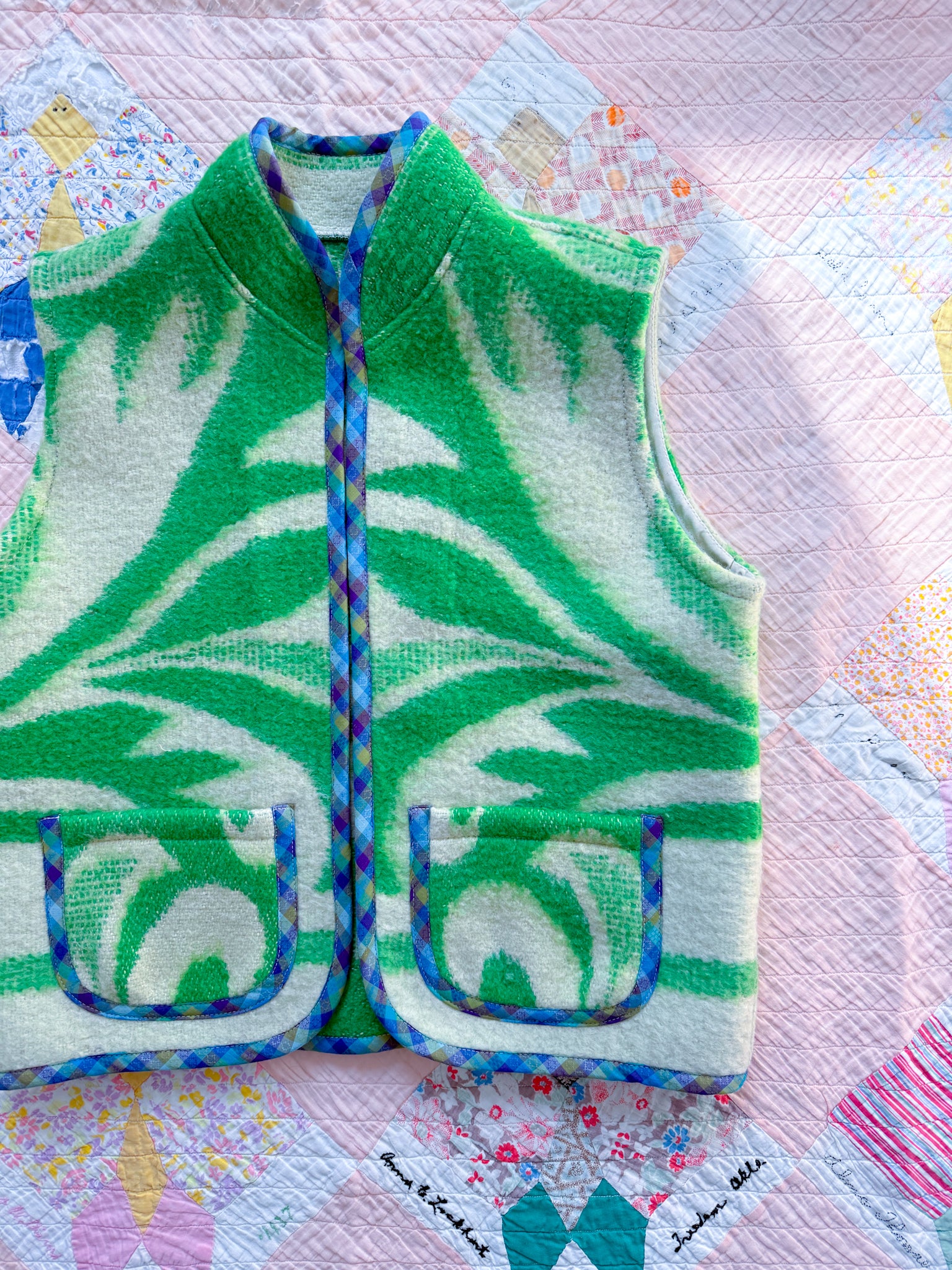 This vest features a vintage 100% wool blanket sourced from a woman-owned business in Ukraine, with a vintage jewel-toned plaid binding, complete with rounded patch front pockets.