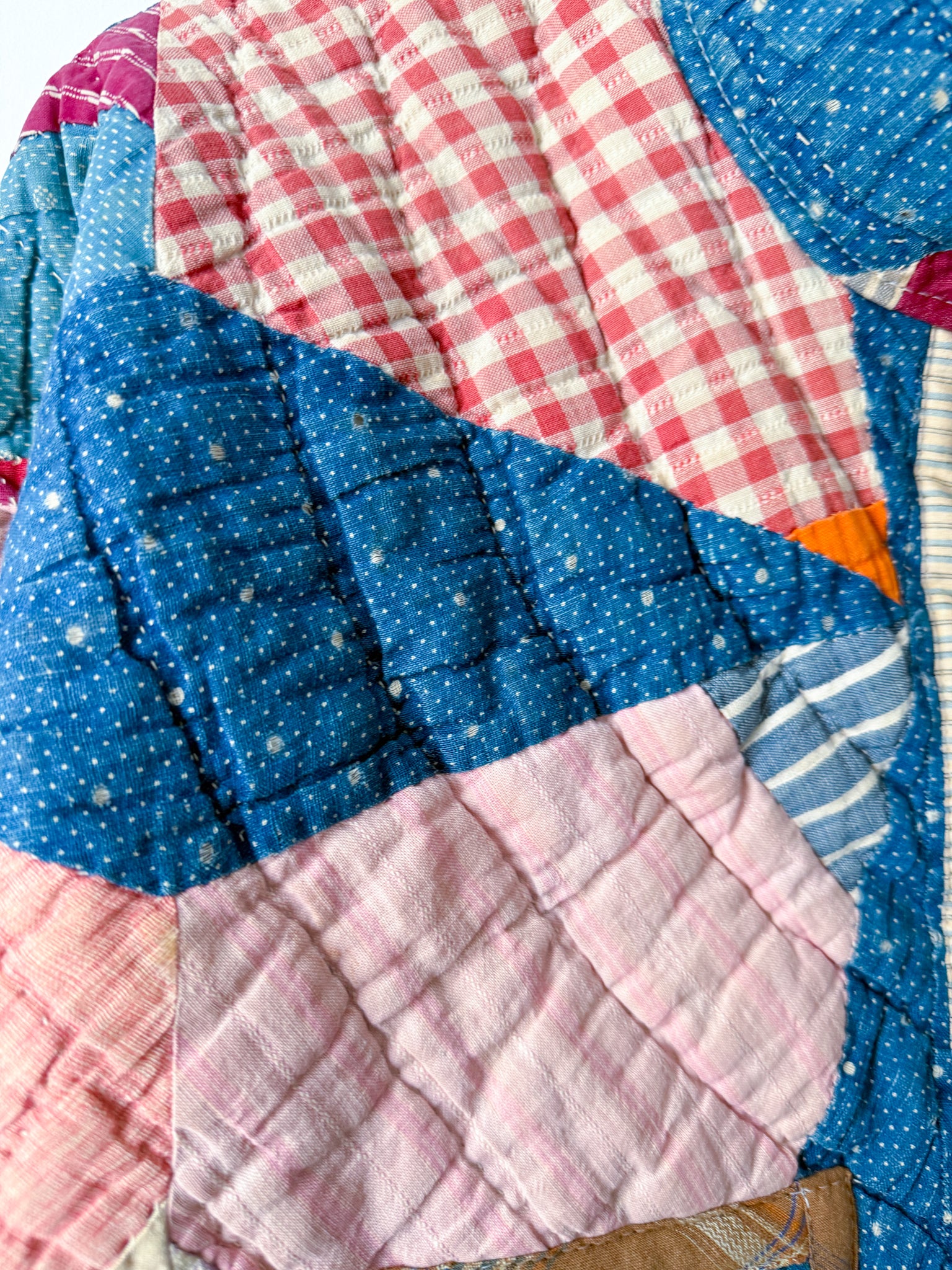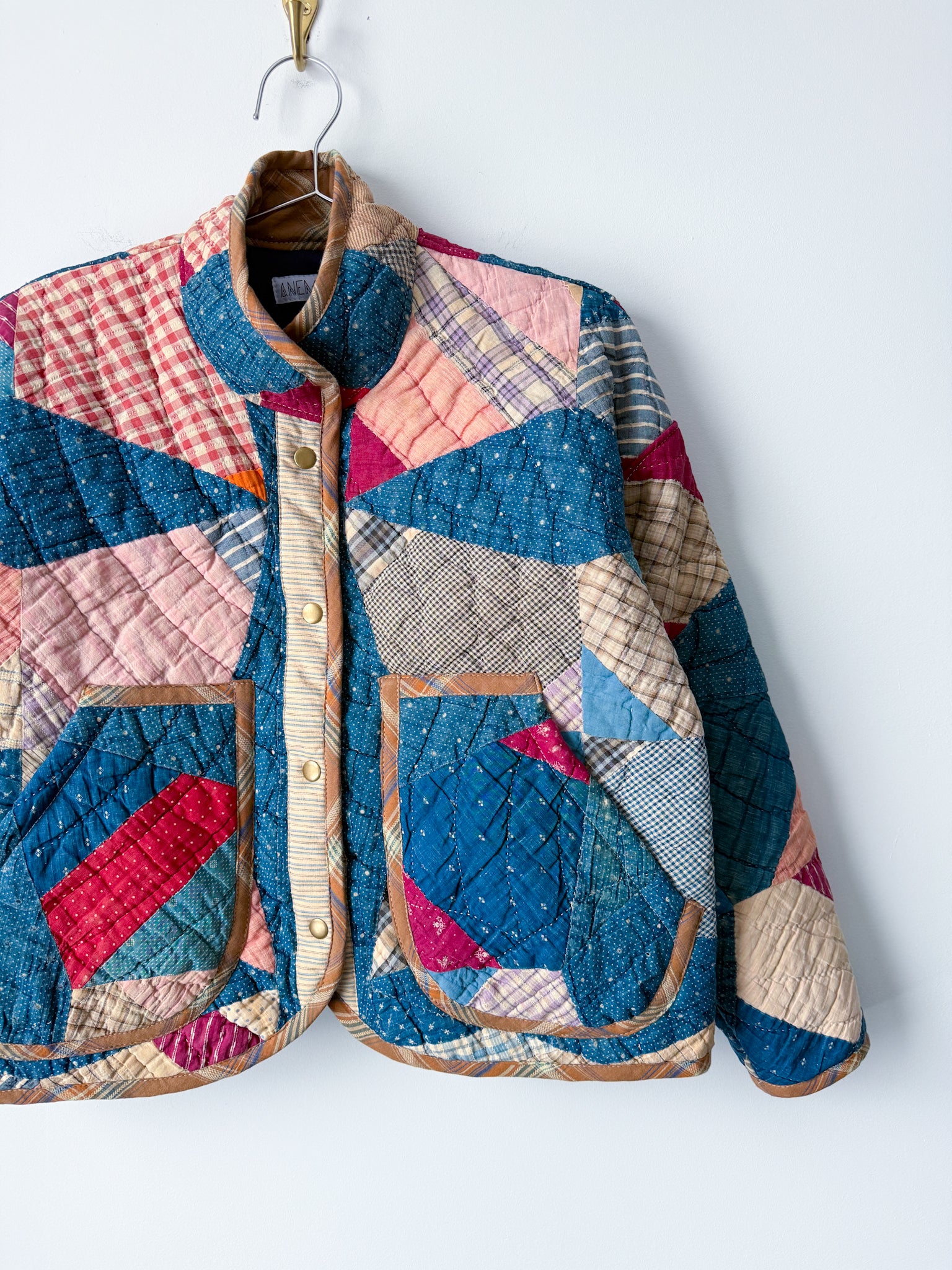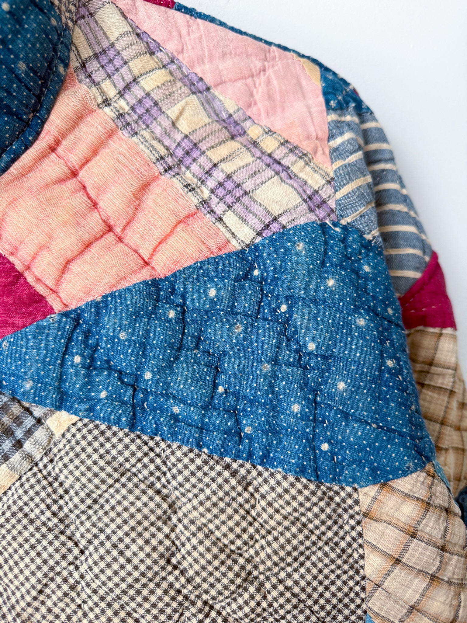 This Flora Jacket is made from a lightweight quilt that is hand pieced and quilted in a Rocky Road to Kansas pattern, with the background fabric featuring an indigo dot cotton, with lots of great plaids, ginghams, and shirting fabrics. The quilt backing was a lovely grey homespun fabric, but due to wear and damage, we lined the inside of this jacket with a deep blue lining. The edges are bound in a sepia toned plaid cotton fabric (from our friends at Toad&Co!), with the front packets featuring a vintage cream striped cotton. This quilt is well over 100 years old, and shows evidence of a life well loved through fabric wear throughout, as well as some age discoloration and hand mends. We invested many hours into bringing this quilt back to life - if you love a quilt with lots of character and are looking for a stunning coat to wear gently for seasons to come, you’d be hard pressed to find a more beautiful coat! If you prefer something ready for harder wear and prefer something more prestige, I would advise against adding this piece into your wardrobe.