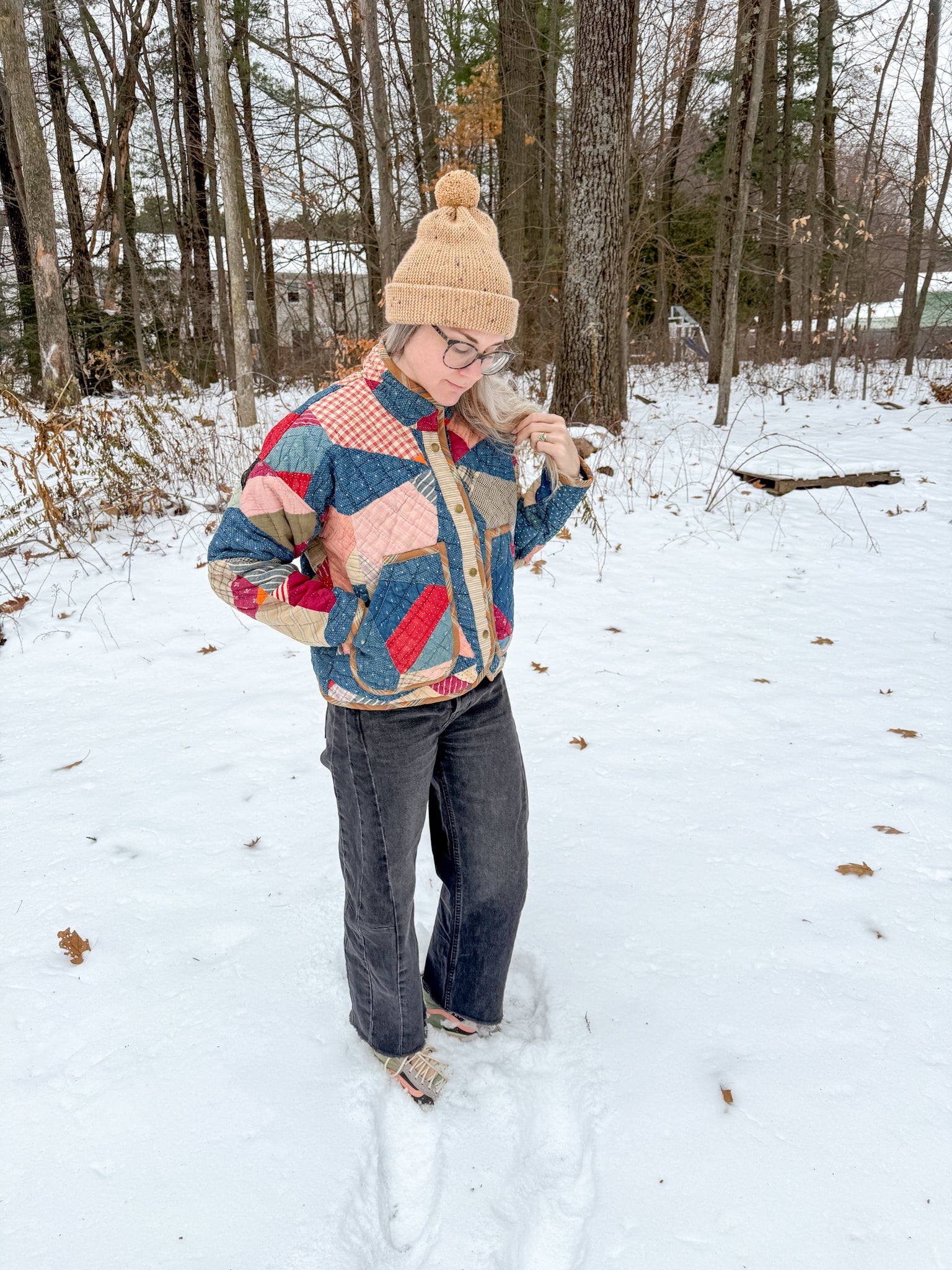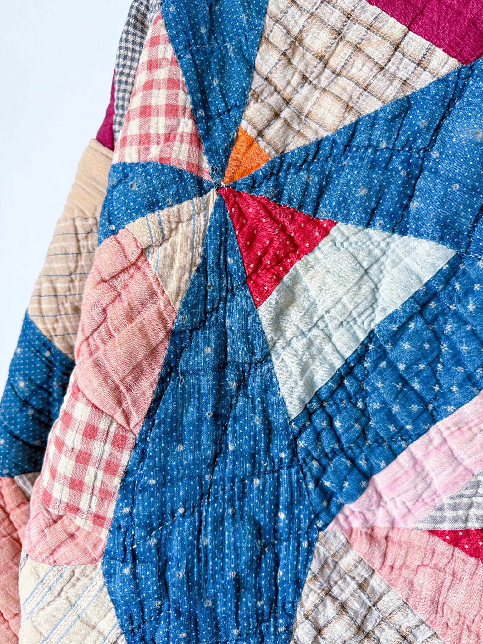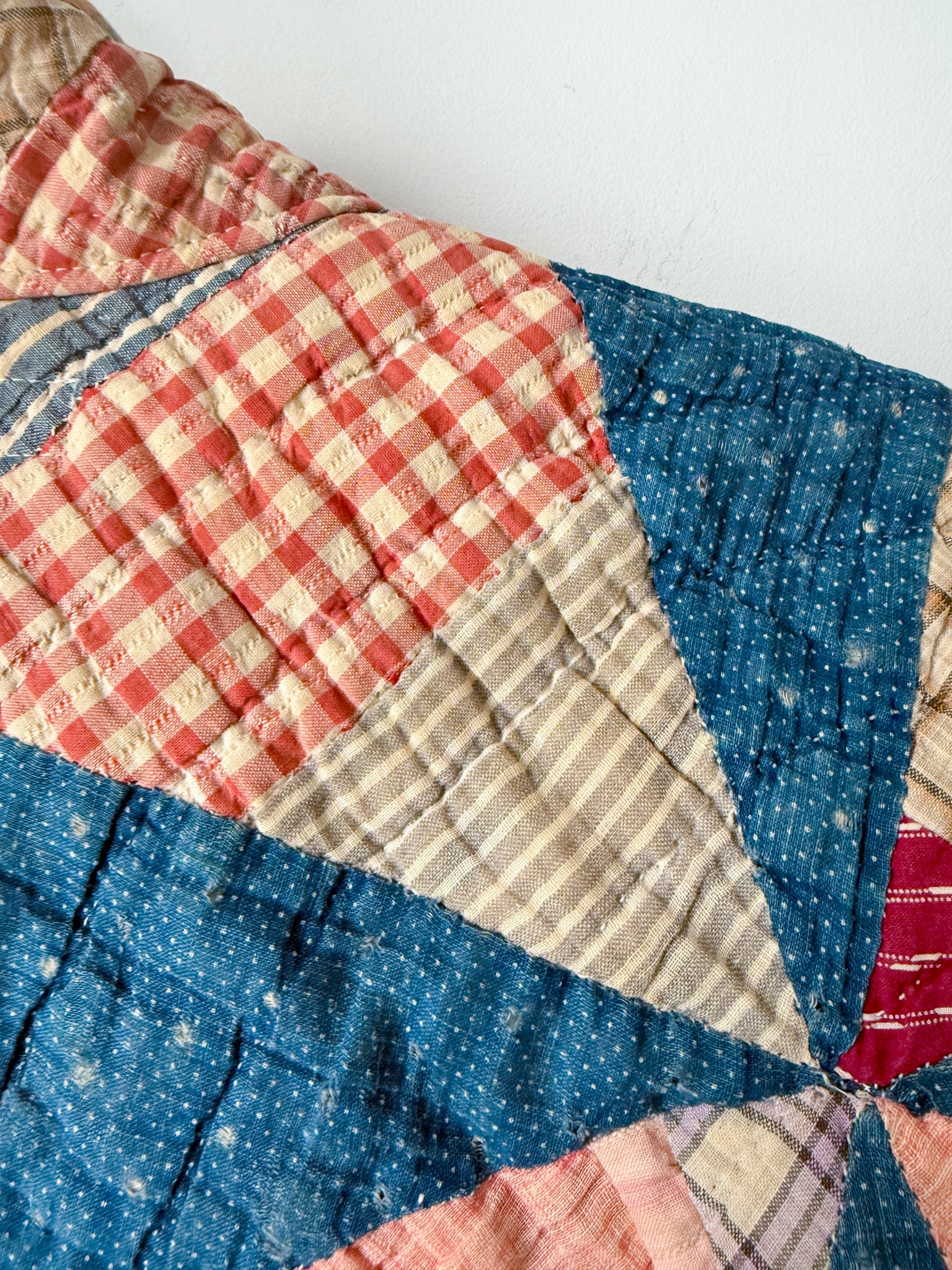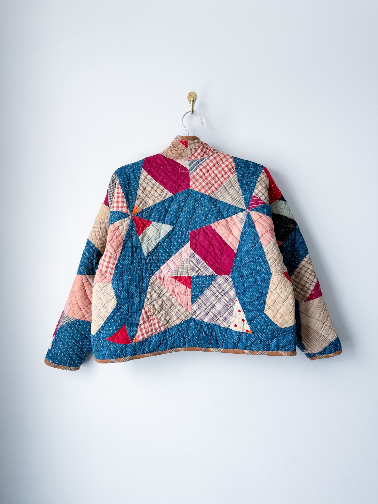 This Flora Jacket is made from a lightweight quilt that is hand pieced and quilted in a Rocky Road to Kansas pattern, with the background fabric featuring an indigo dot cotton, with lots of great plaids, ginghams, and shirting fabrics. The quilt backing was a lovely grey homespun fabric, but due to wear and damage, we lined the inside of this jacket with a deep blue lining. The edges are bound in a sepia toned plaid cotton fabric (from our friends at Toad&Co!), with the front packets featuring a vintage cream striped cotton. This quilt is well over 100 years old, and shows evidence of a life well loved through fabric wear throughout, as well as some age discoloration and hand mends. We invested many hours into bringing this quilt back to life - if you love a quilt with lots of character and are looking for a stunning coat to wear gently for seasons to come, you’d be hard pressed to find a more beautiful coat! If you prefer something ready for harder wear and prefer something more prestige, I would advise against adding this piece into your wardrobe.