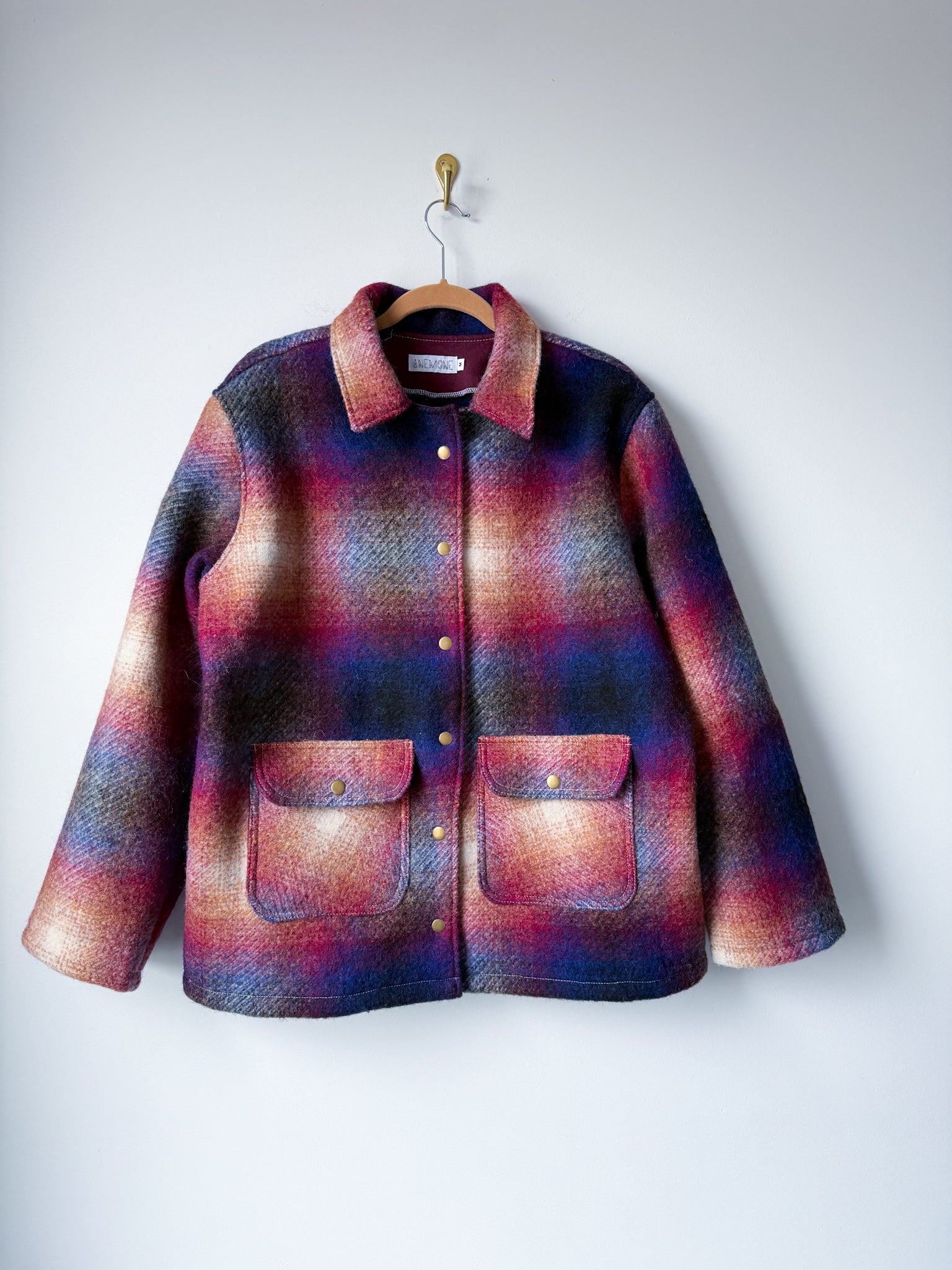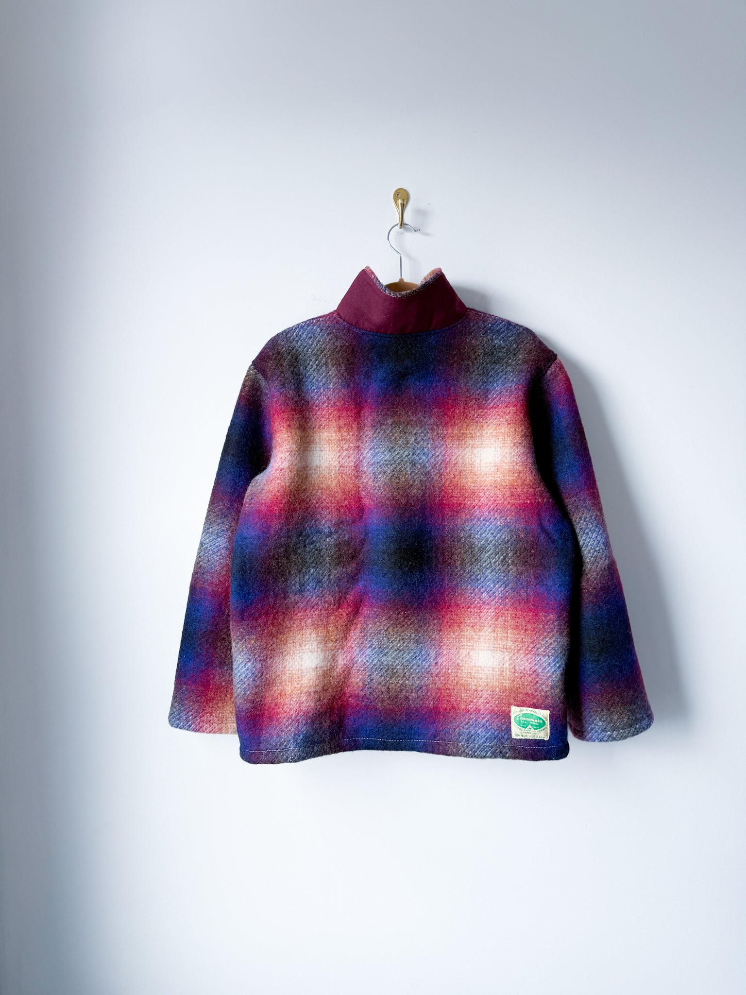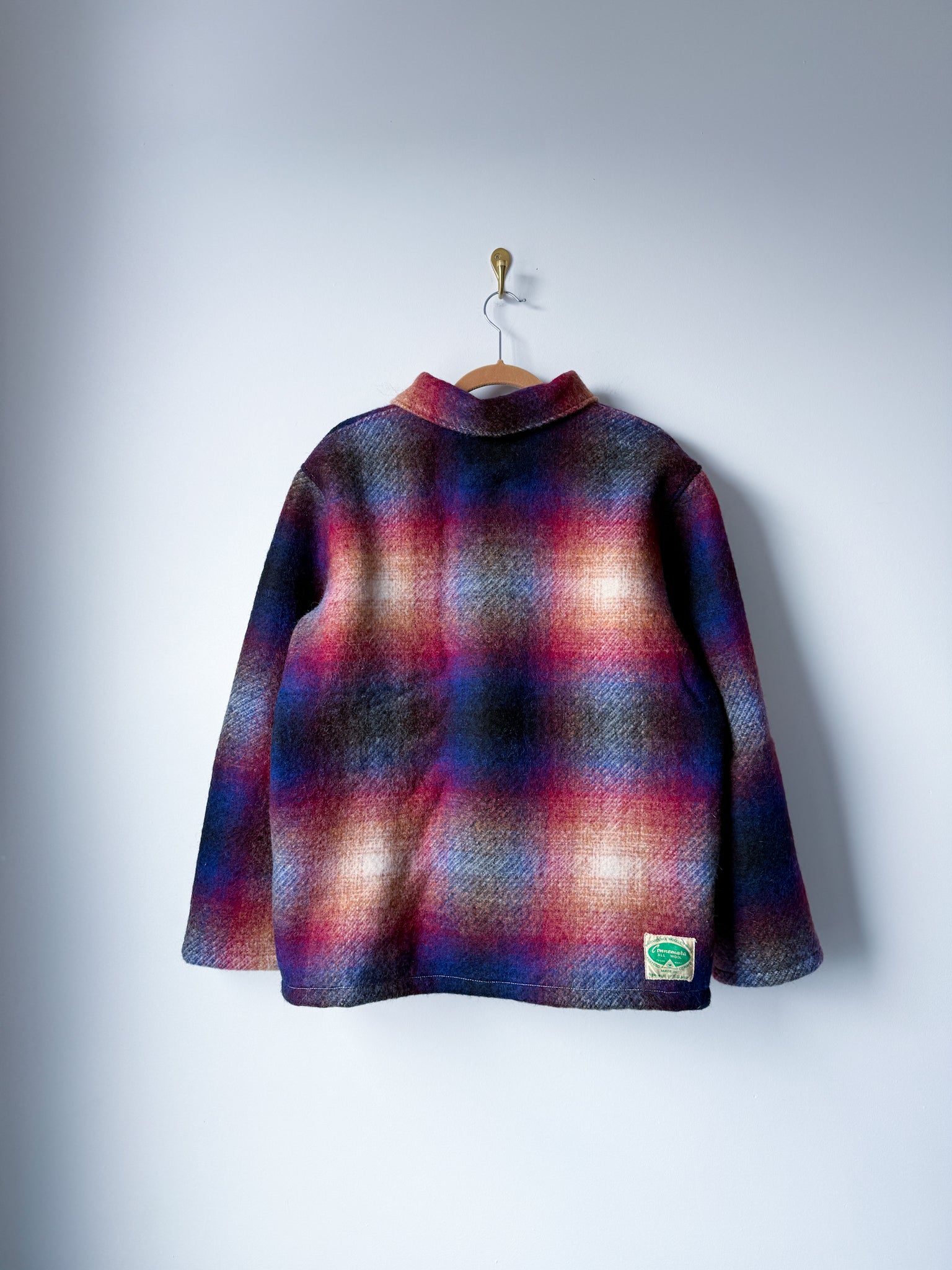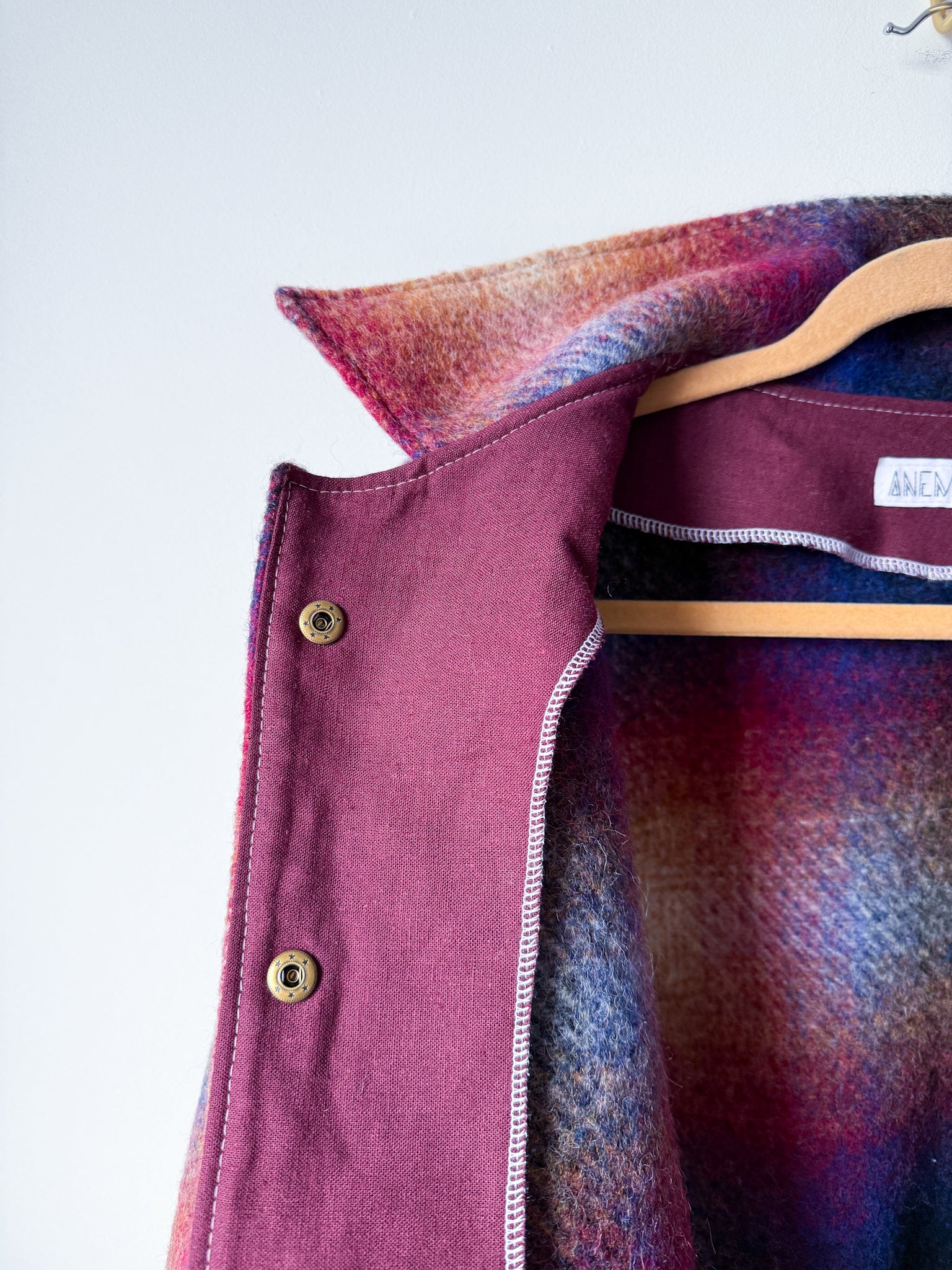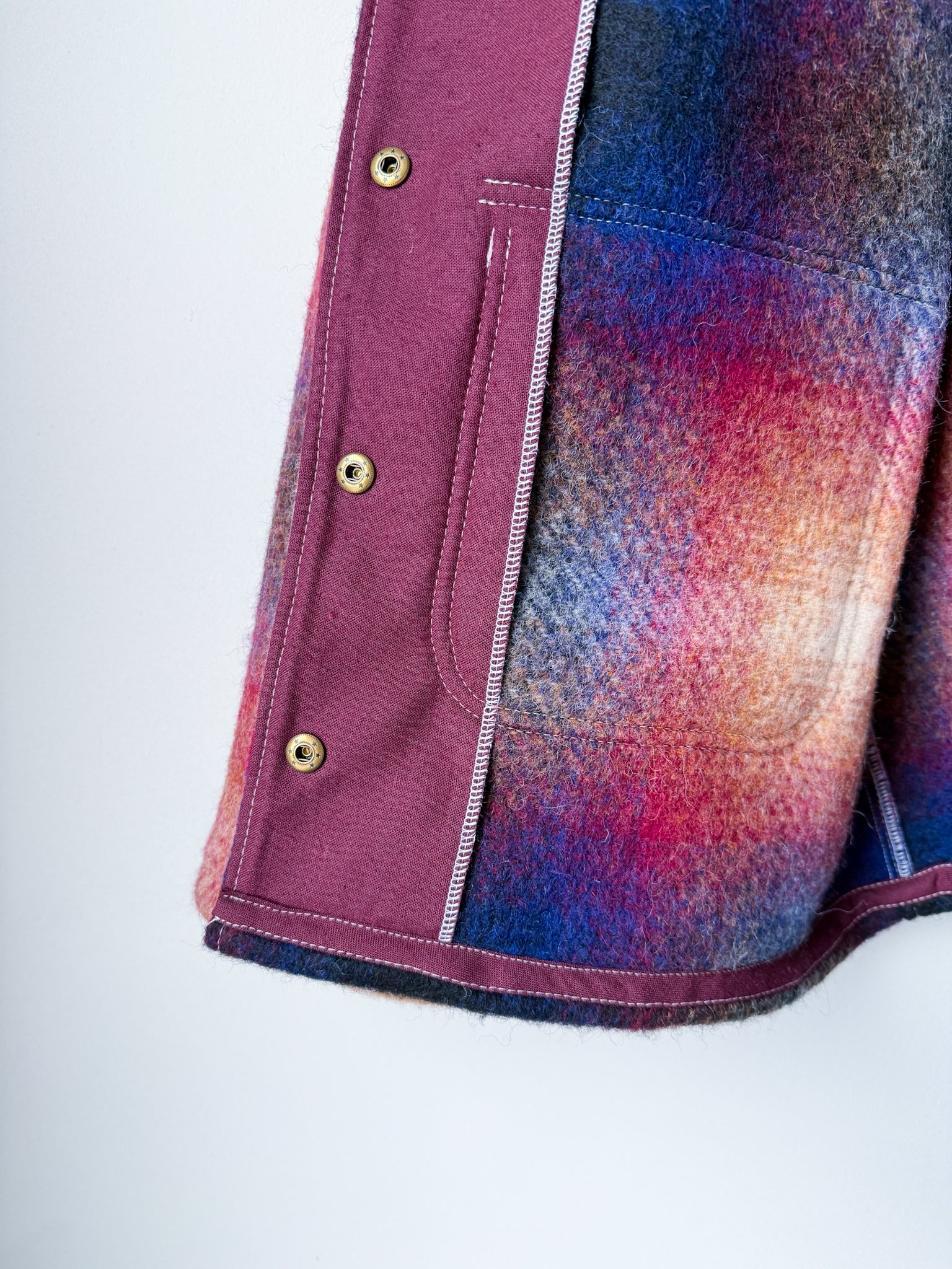 This Providence Woolen Mills (based in Ireland) 100% wool blanket has been reworked into a Field Jacket, which features a slight drop shoulder and tapered sleeve, with a straight silhouette, complete with flap front patch pockets and antique brass snaps. The inner facings, back of the neck, under-collar, and pockets feature a linen fabric in a rich burgundy.