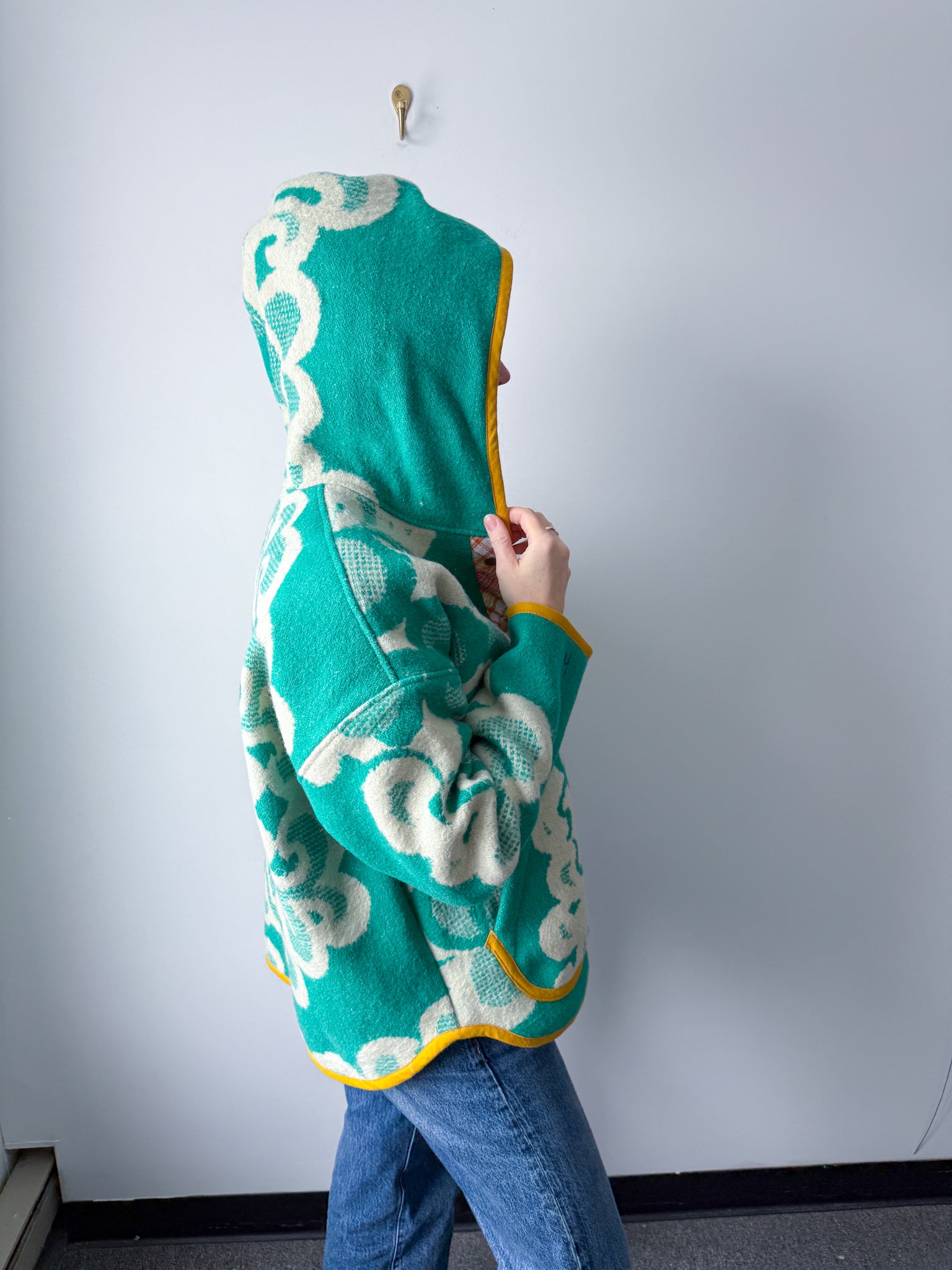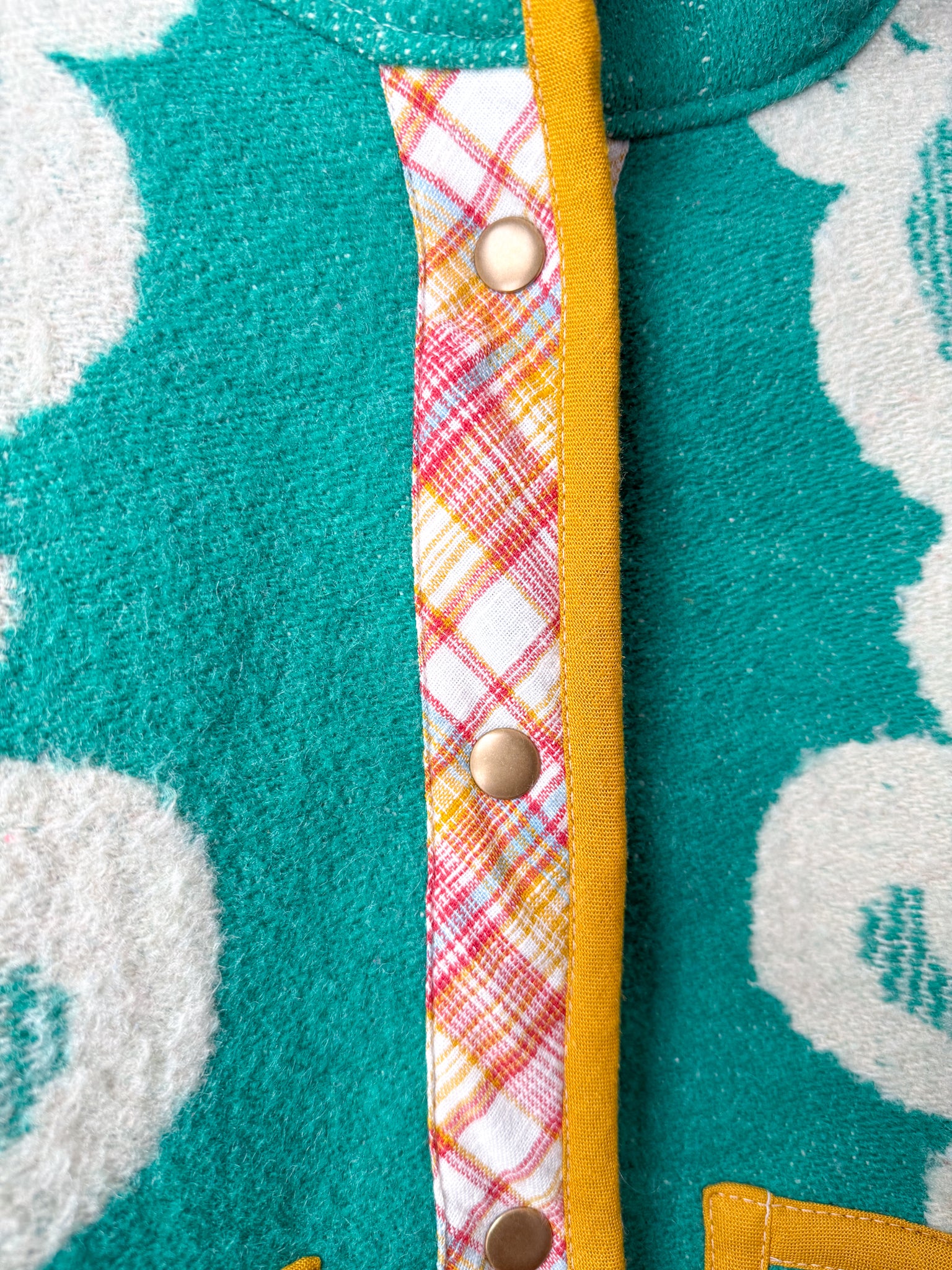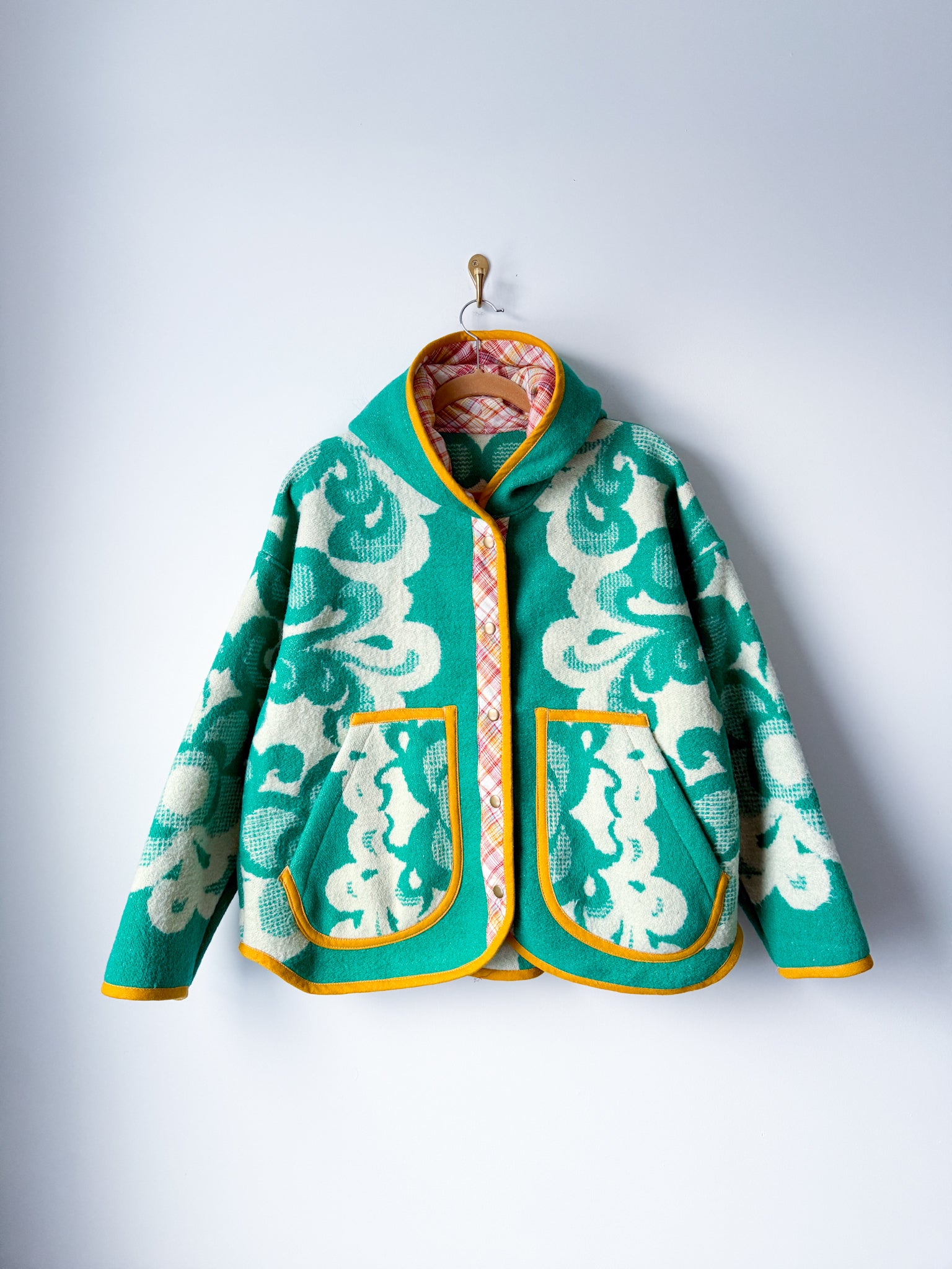 This Flora Jacket is made from a vintage floral wool blanket sourced from a woman-owned business in Ukraine in a cool-toned kelly green. The hood lining and front plackets were constructed from a soft, gauzy cotton plaid fabric sent by our friends at Toad&Co. The outer edges are bound in a mustard yellow cotton/linen blend fabric. The original blanket had a small hand-embroidered ‘H’, and this has been included on the back right sleeve!