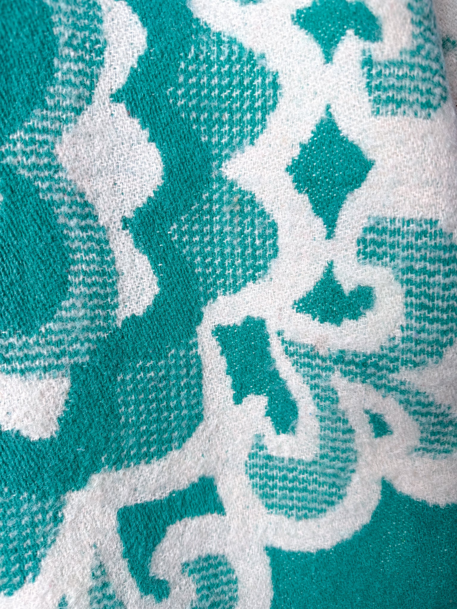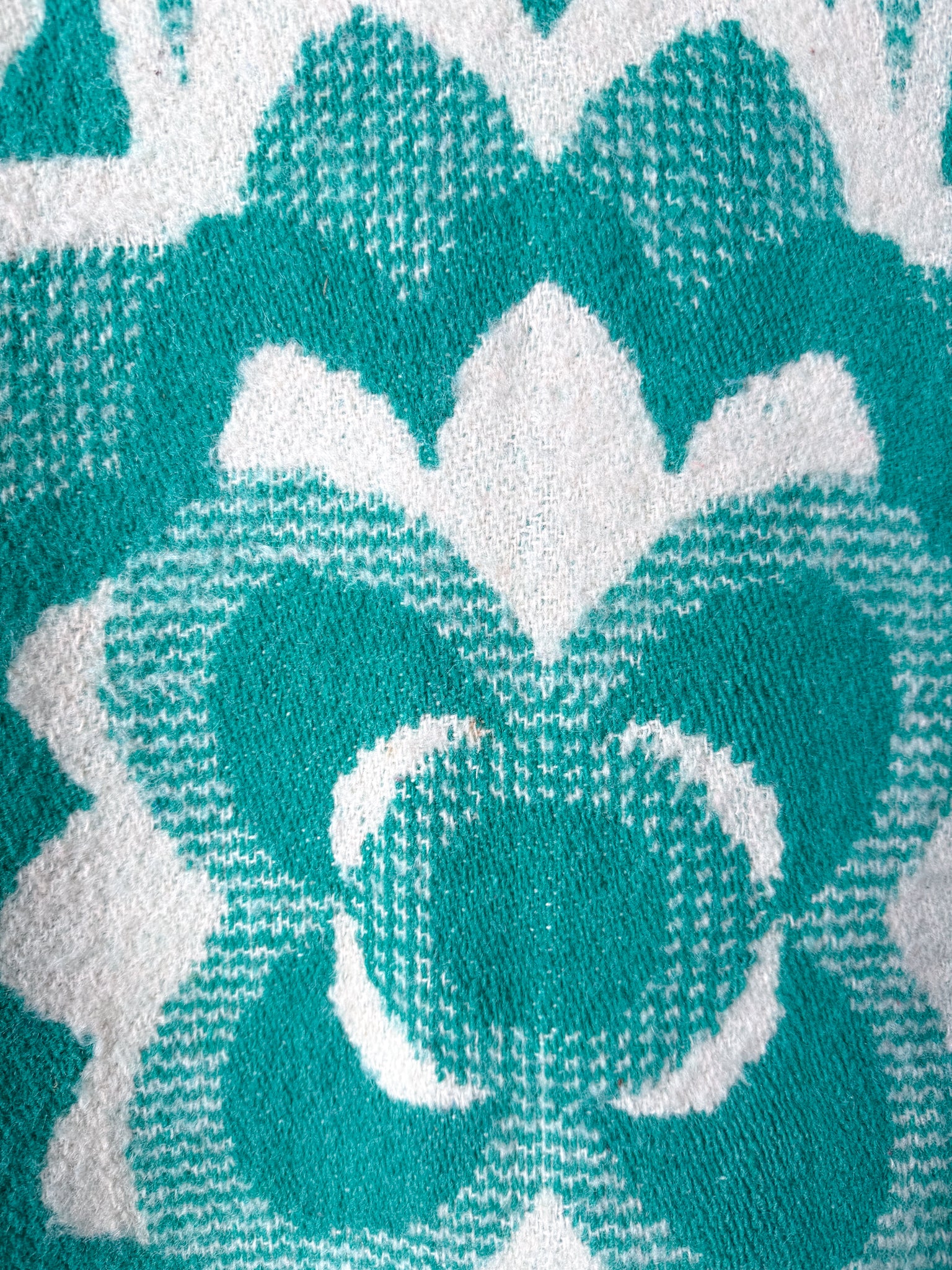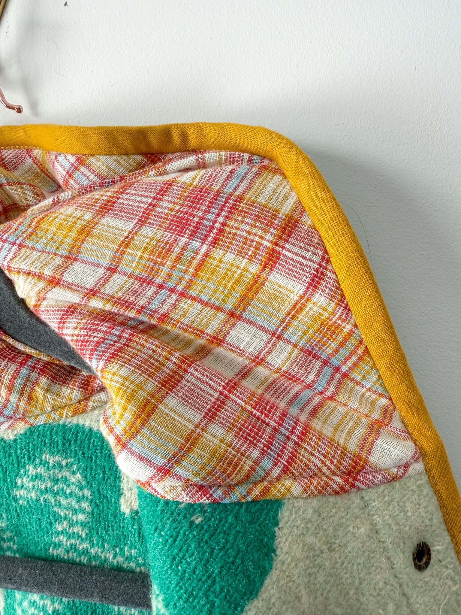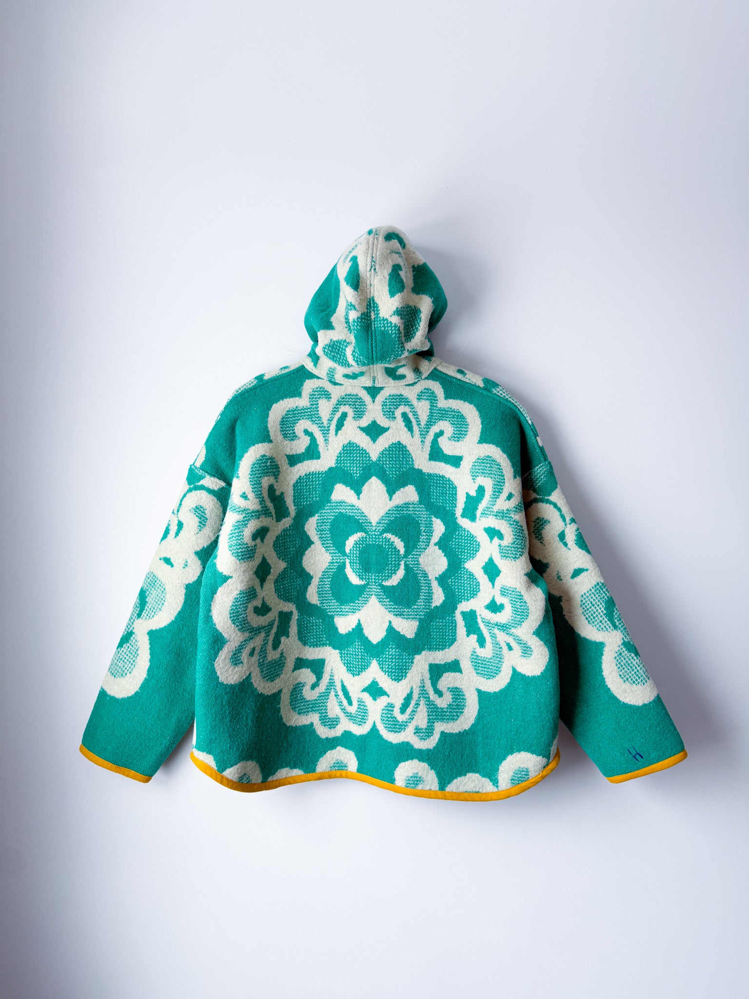 This Flora Jacket is made from a vintage floral wool blanket sourced from a woman-owned business in Ukraine in a cool-toned kelly green. The hood lining and front plackets were constructed from a soft, gauzy cotton plaid fabric sent by our friends at Toad&Co. The outer edges are bound in a mustard yellow cotton/linen blend fabric. The original blanket had a small hand-embroidered ‘H’, and this has been included on the back right sleeve!
