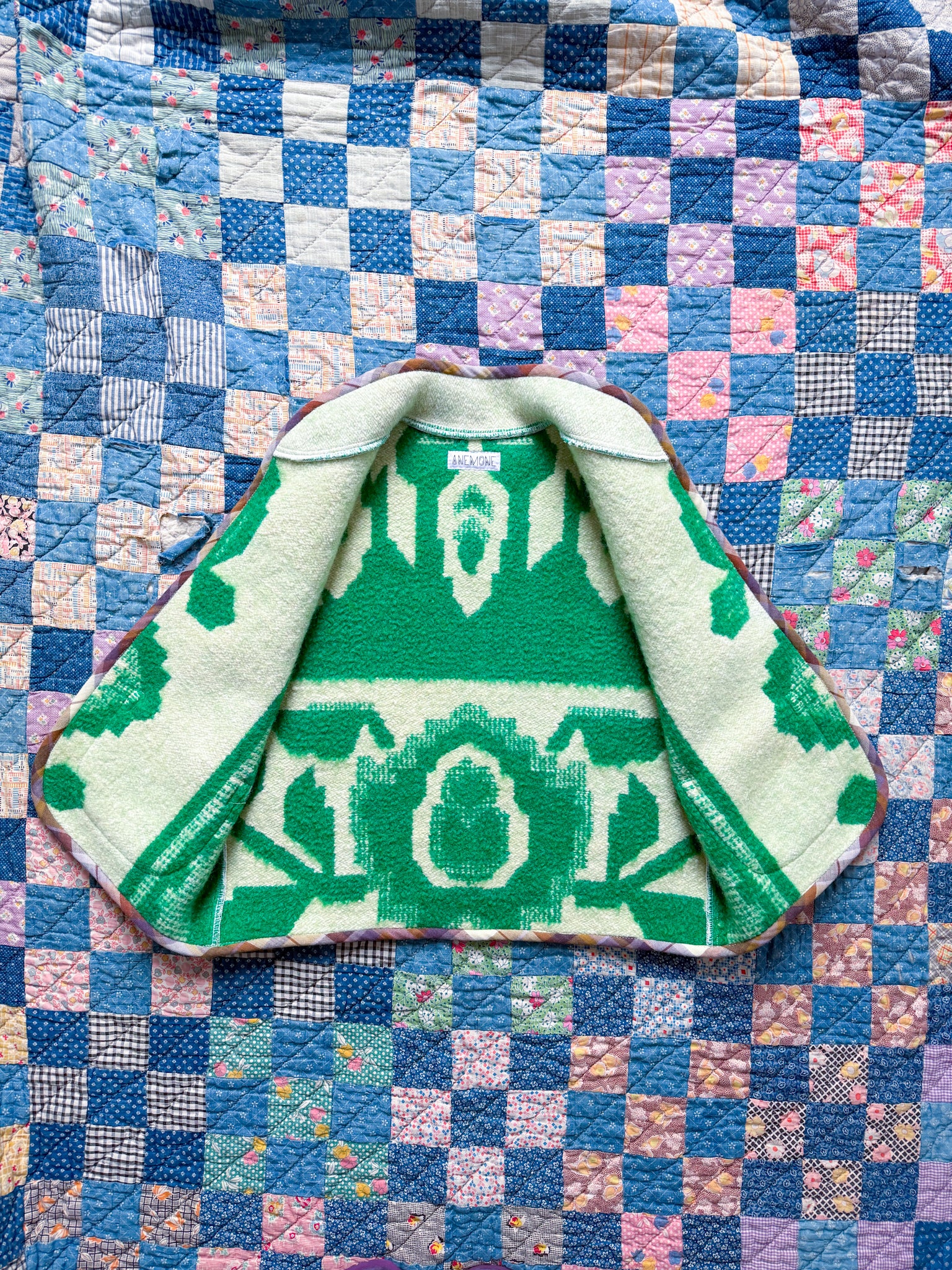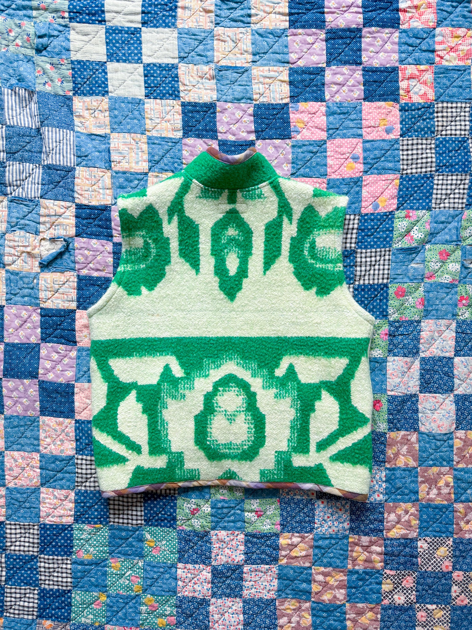 This vest features a vintage 100% wool blanket sourced from a woman-owned business in Ukraine, with a plaid cotton binding (made from fabric shared by our friends at Toad&Co.), complete with rounded patch pockets.