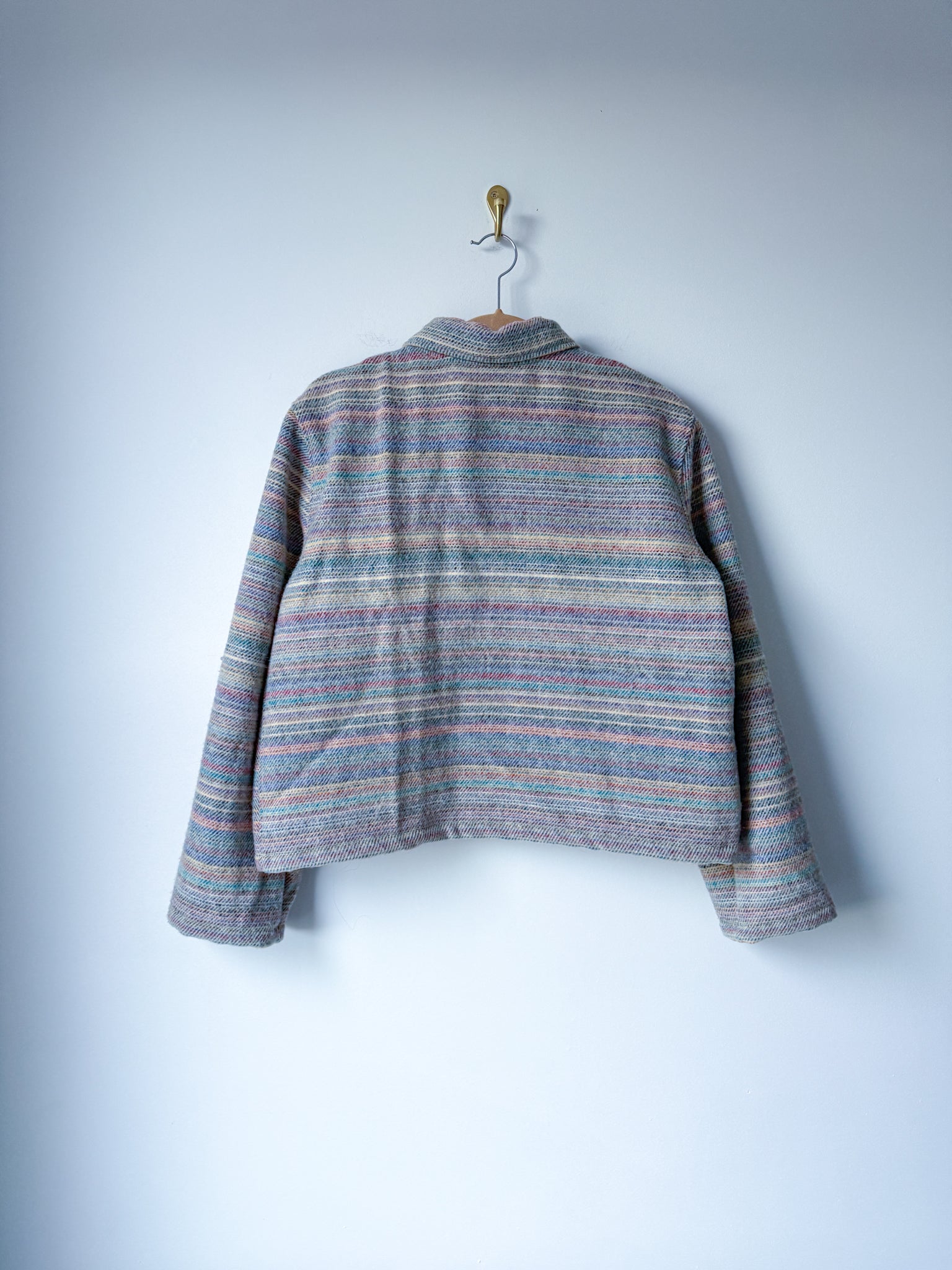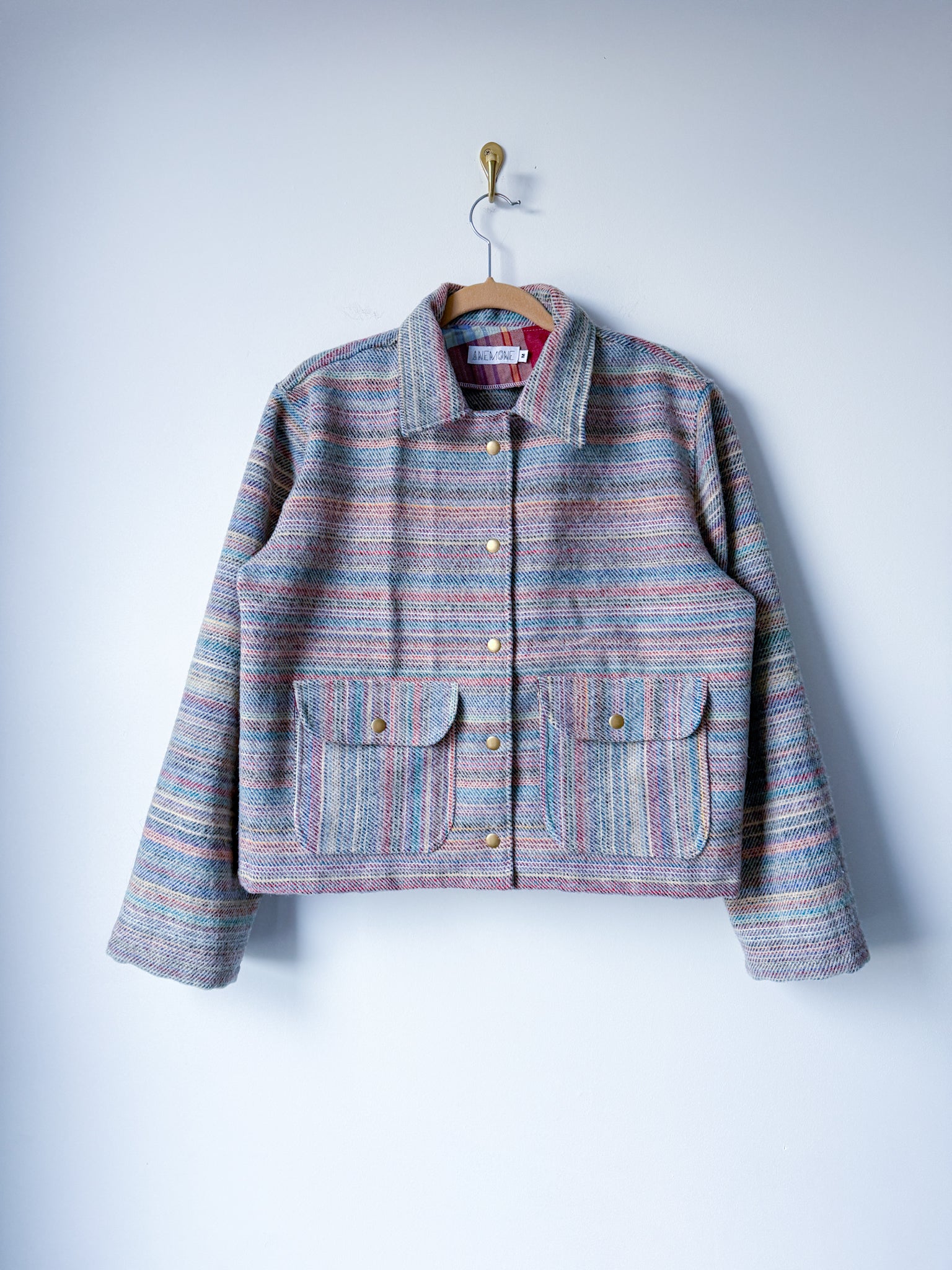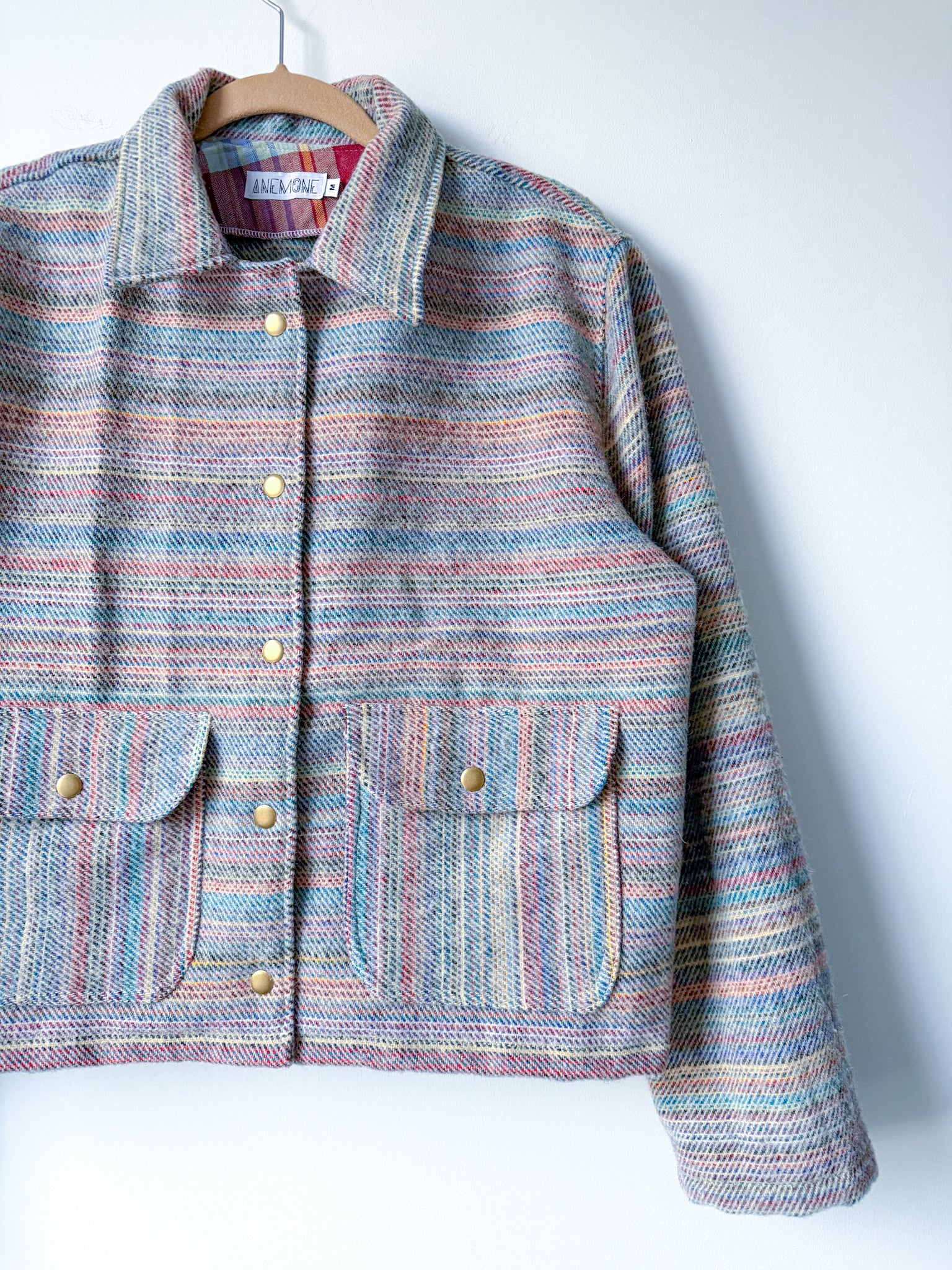 This vintage LLBean 100% wool blanket has been reworked into a Field Jacket, which features a slight drop shoulder and tapered sleeve, with a straight silhouette, complete with flap front patch pockets and antique brass snaps. The inner facings, back of the neck, under-collar, and pockets feature a cotton plaid fabric (sent by our friends at Toad&Co!).