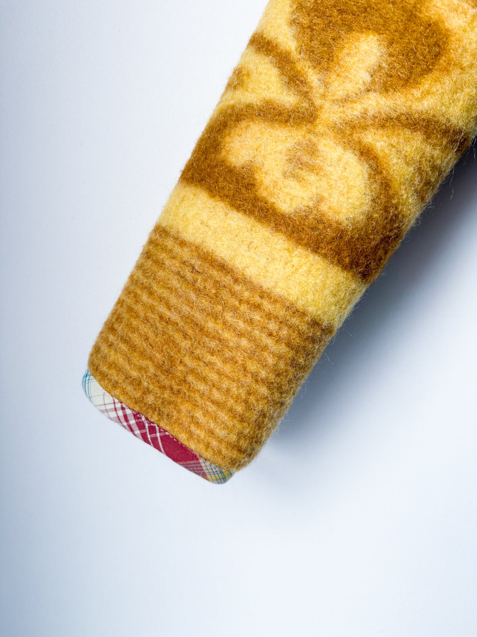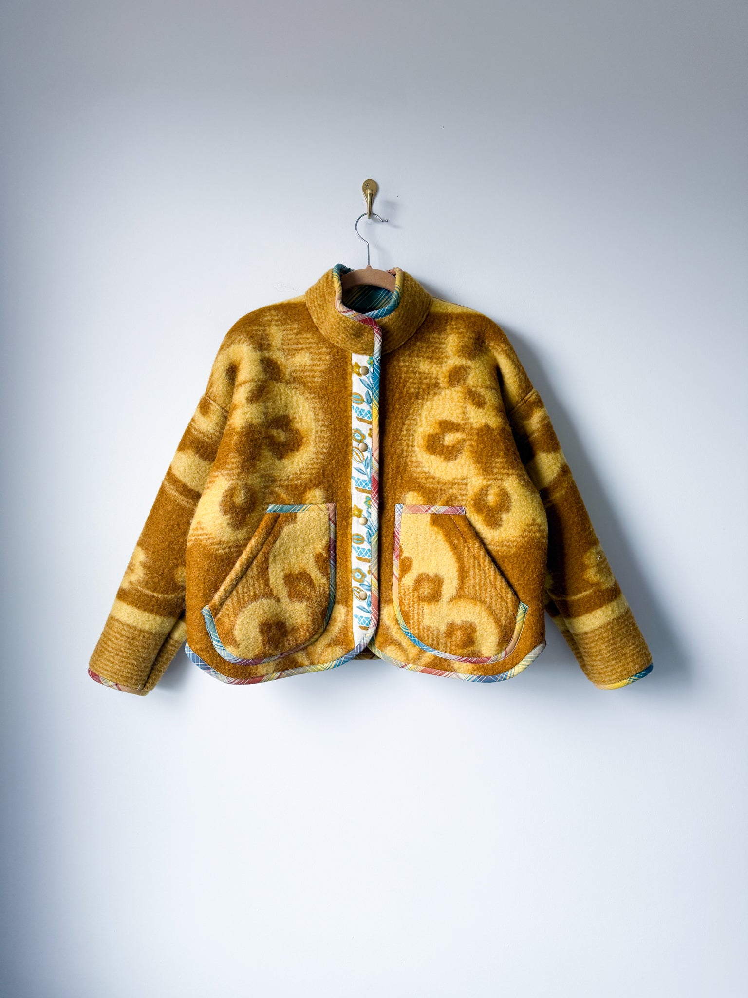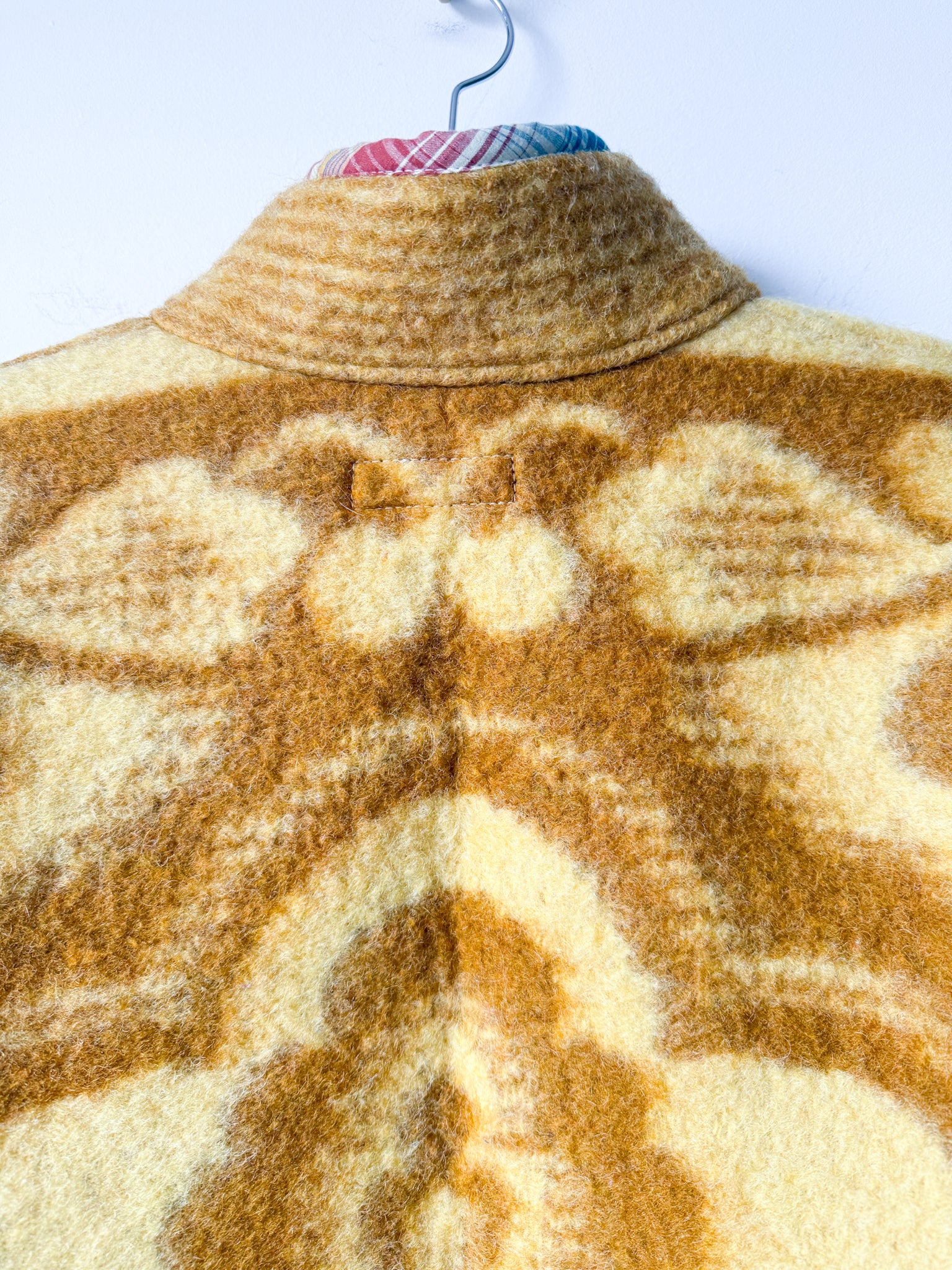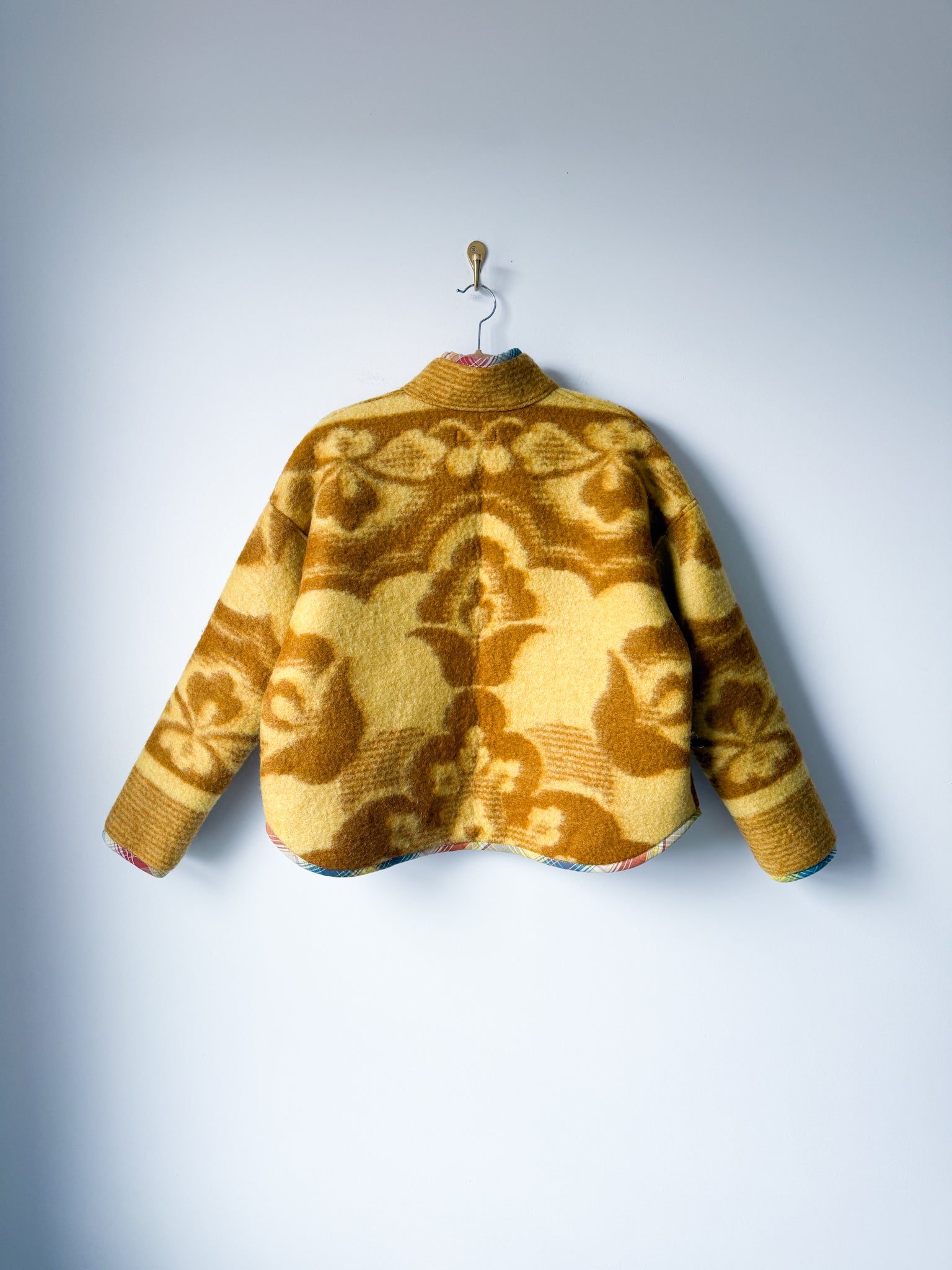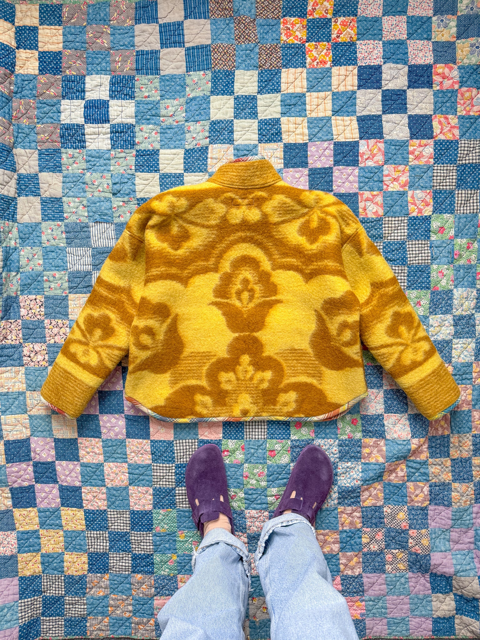 This Flora Jacket is made from a vintage blanket sourced from Ukraine, in a warm ochre with a contrast floral pattern - please note that this blanket is a medium to heavier weight. The front plackets feature a printed cotton ribbon that was found at a local estate sale; it was an incredible find and a perfect pairing for this beautiful jacket! The inner collar and bound edges are a cotton plaid sample fabric from our friends at Toad&Co.