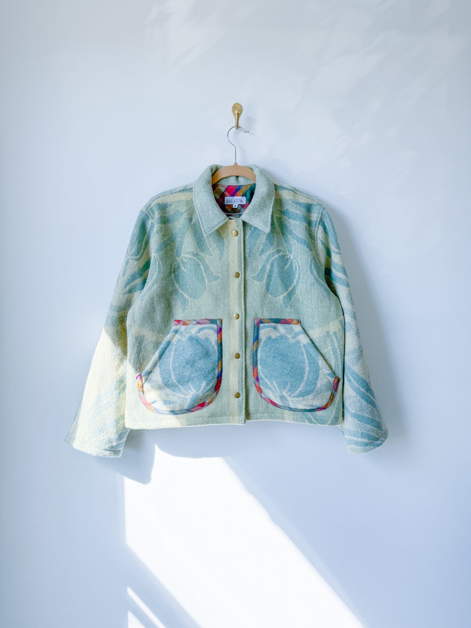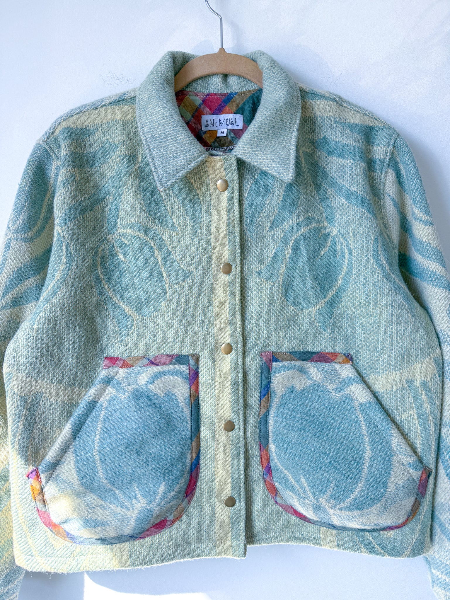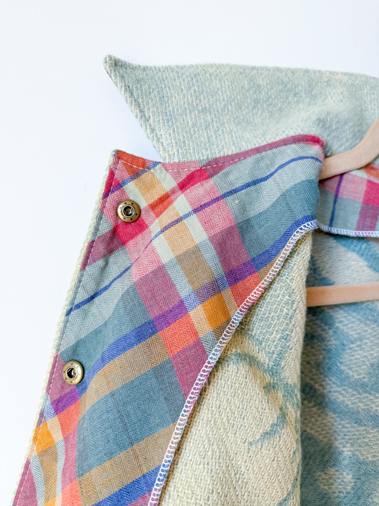 This vintage Golden Dawn 100% wool blanket has been reworked into a Chore Coat, which features a slight drop shoulder and tapered sleeve, with a less boxy silhouette (depending on how you would like it to fit), complete with rounded handwarmer style pockets and antique brass snaps. The inner facings, back of the neck, under-collar, and pockets feature a cotton plaid fabric (sent by our friends at Toad&Co!), and the original blanket’s tag has been reattached to the bottom corner of the piece.